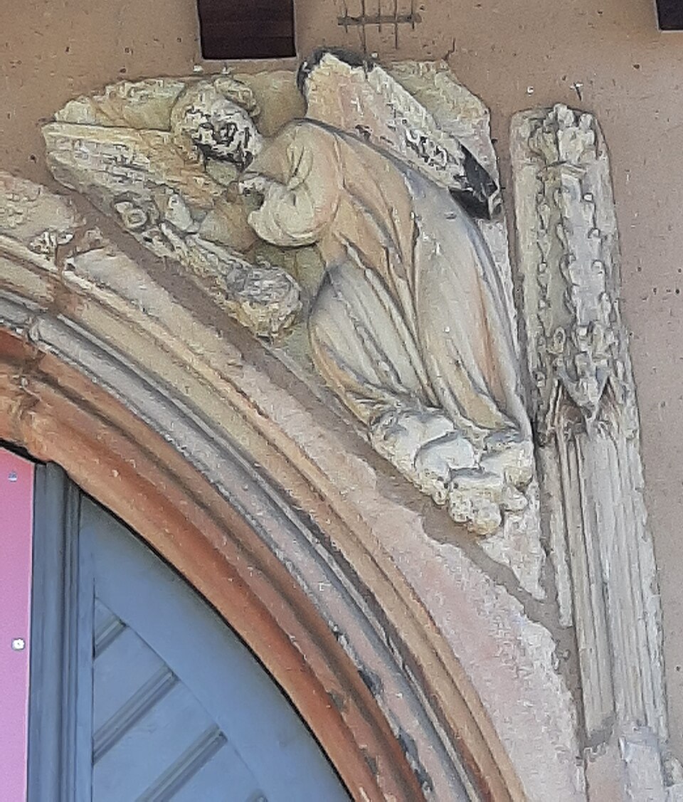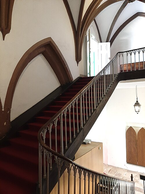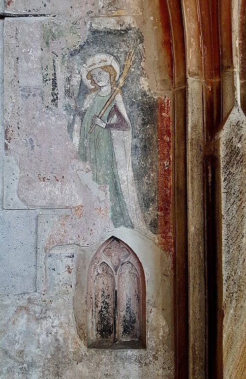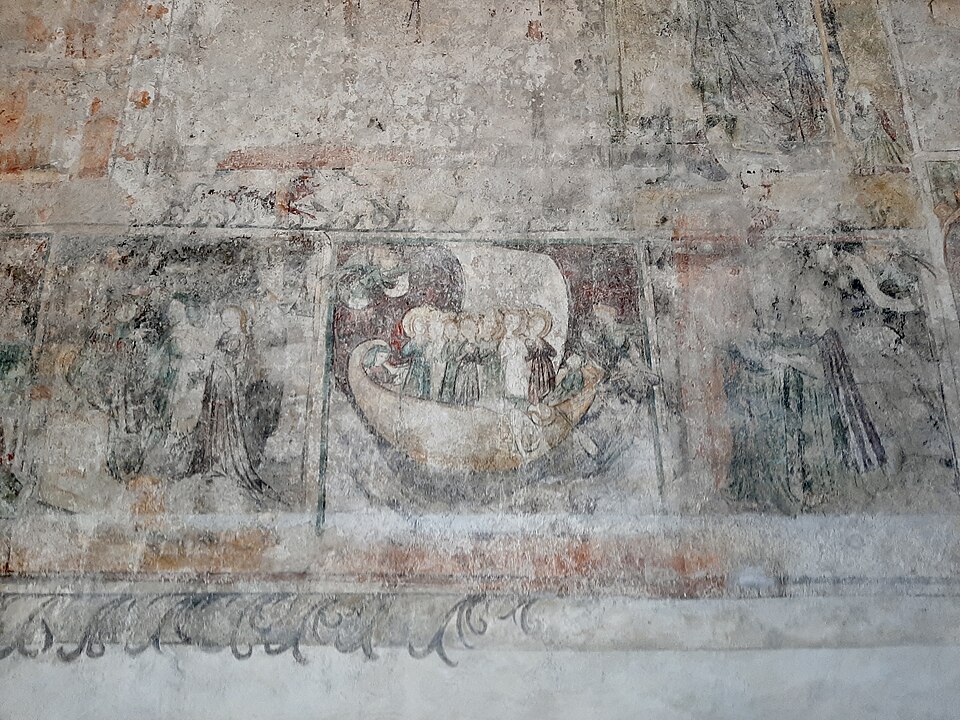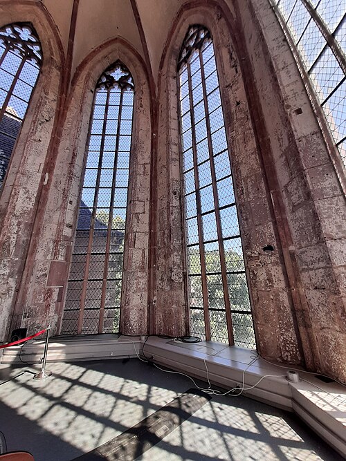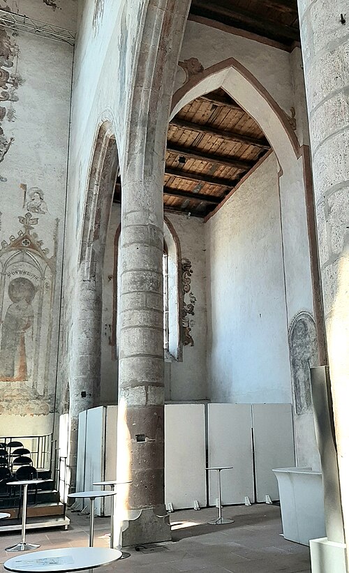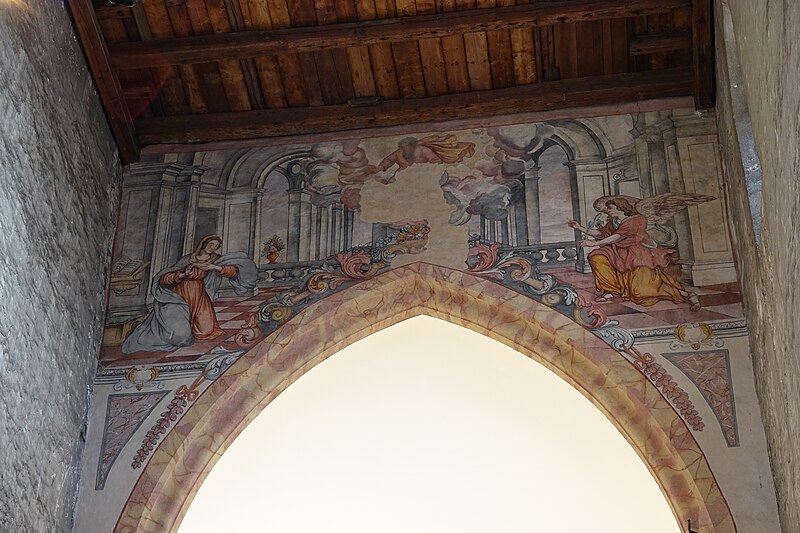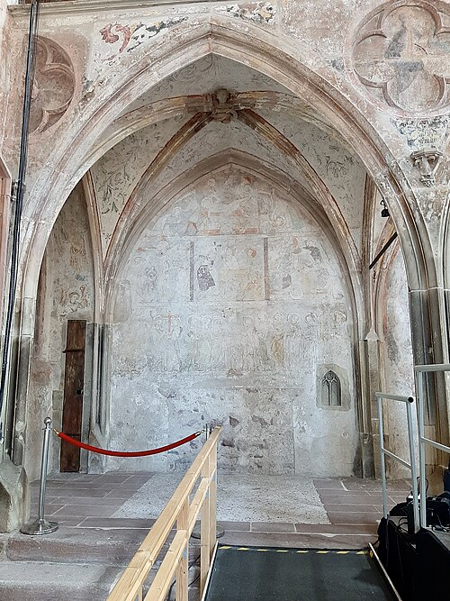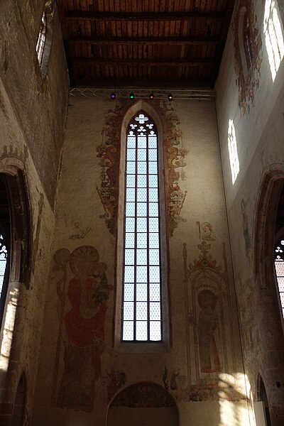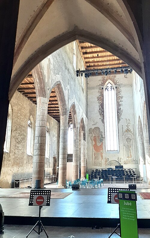 Le jubé occupe la travée orientale de la nef : il comporte cinq travées voûtées, une arcature ouverte sur la nef ornée de quadrilobes sculptés et des culots figurant des scènes inspirées de Thomas d'Aquin (pélican, phénix, aigle, etc.), tandis que les clefs de voûte représentent les évangélistes et un agneau pascal. Son décor peint, composé de couches successives depuis la fin du XIVe siècle, laisse encore apparaître plusieurs épisodes du Nouveau Testament tels que la Dormition de la Vierge, le Noli me tangere et une Crucifixion.