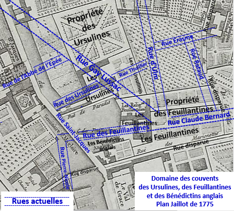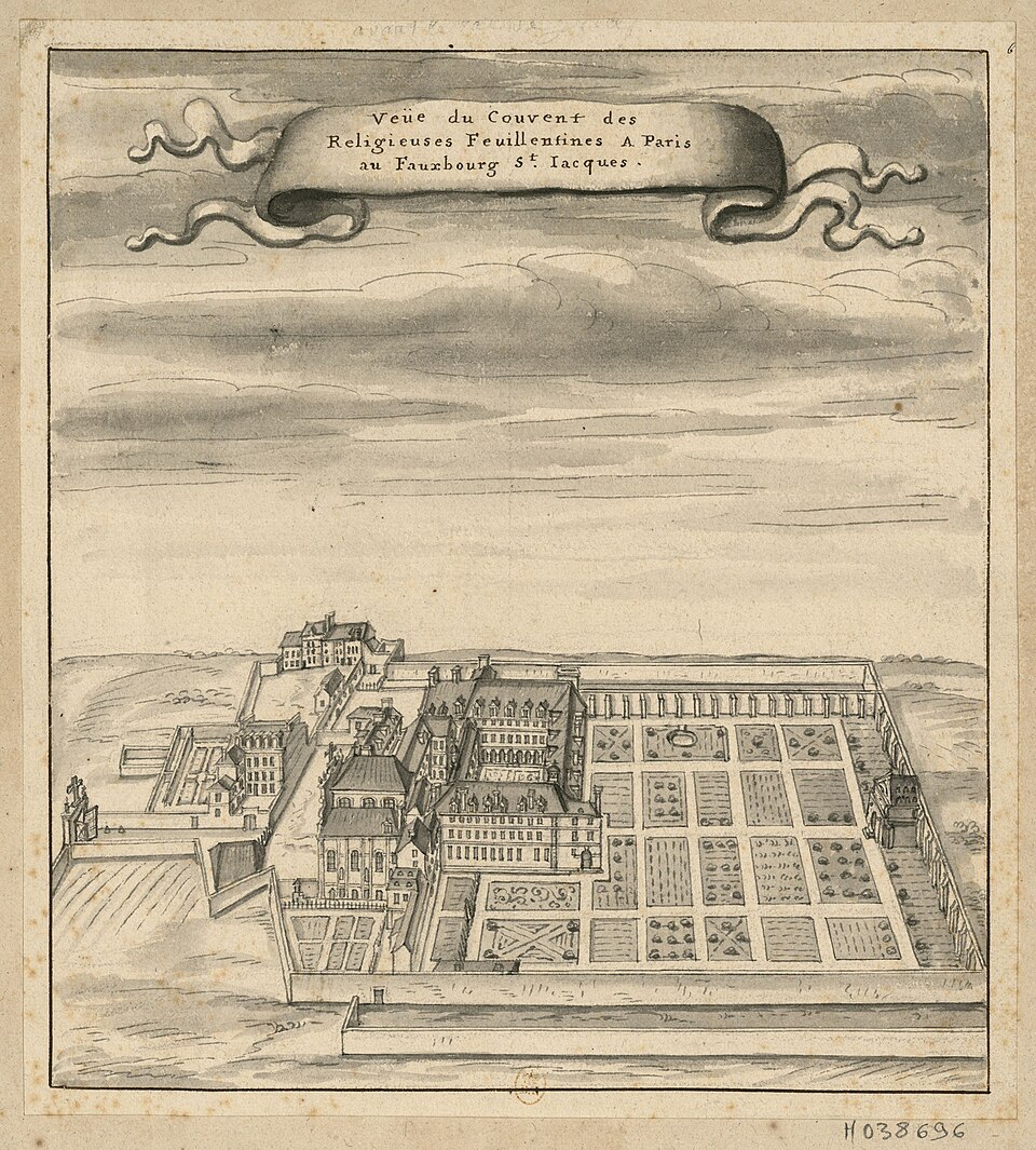 Le couvent des Feuillantines était un monastère parisien fondé en 1622 et situé à l'emplacement de l'actuelle rue des Feuillantines. Il fut créé rue du Faubourg‑Saint‑Jacques par Anne d'Autriche à la demande d'Anne Gobelin, qui fit venir de Toulouse six feuillantines. Les terrains, acquis par Anne Gobelin, épouse de Charles d'Estournel, seigneur de Corbie, couvraient près de six hectares et demi et comprenaient quelques habitations. Le domaine s'étendait à l'arrière des bâtiments conventuels situés aux nos 4 à 8 de la rue des Feuillantines et comprenait une église dessinée par l'architecte Jean Marot, achevée vers 1672. La première pierre fut posée en 1626 par François II de Bassompierre, comme l'atteste une plaque conservée au musée Carnavalet. En 1631 de nouveaux bâtiments furent inaugurés pour accueillir les 33 religieuses alors présentes. Le couvent comprenait aussi une pension pour les dames de Paris; Bossuet écrivit qu'on y respirait "l'air le plus pur et le plus serein de la ville". L'archevêque Jean‑François de Gondi fit interdire l'accès du cloître et du réfectoire aux séculiers afin de renforcer la clôture. Lieu de retraite spirituelle et de cadre bucolique, le couvent attirait des dames de l'aristocratie parisienne: en 1685 Mademoiselle de la Trousse, cousine de Madame de Sévigné, y mourut, et en 1703 Jeanne‑Marguerite de Mauron, épouse du fils de Madame de Sévigné, y séjourna pendant que son mari se retirait au séminaire Saint‑Magloire tenu par les oratoriens. Les Feuillantines portaient une robe de laine blanche et un voile noir, et les dames pensionnaires étaient enterrées en habit de religieuse. En 1695 le couvent atteignit son apogée avec 65 religieuses, 25 converses et 106 pensionnaires, mais il déclina progressivement au XVIIIe siècle et ne comptait plus, en 1790, que 20 religieuses et 10 converses. Fermé en septembre 1792 et vendu comme bien national, il fut transformé en logements; le grand parc à l'arrière accueillit Victor Hugo pendant une partie de son enfance, de 1808 à 1813, où il vécut dans un appartement au milieu des ruines et du jardin sauvage. Le général de la Horie s'y cacha un temps avant son exécution à la suite de l'échec du complot du général Malet en 1812. La rue des Feuillantines, ouverte en 1805 sur l'allée donnant accès à l'église, entraîna la destruction de l'édifice situé au no 11, et les derniers vestiges du couvent furent rasés en 1864 pour permettre l'ouverture de la rue Gay‑Lussac. Une maison annexe, bâtie en 1688, subsiste au no 10 de la rue des Feuillantines; sa façade arrière conserve des croisées du XVIIIe siècle et une cage d'escalier est inscrite aux monuments historiques depuis 1989. Les abbesses étaient appelées "Madame". À partir du Concordat de Bologne commença la série des abbesses commendataires et seigneurs temporels nommés par le roi; parmi elles figurent Mme de Roquelaure (1629), qui prit l'habit sous le nom de Sainte‑Catherine de Jésus, et Henriette d'Espinay‑Saint‑Luc, fille de Timoléon d'Espinay et abbesse de Saint‑Paul de Soissons, qui résigna le 1er février 1664 en faveur de sa sœur Françoise Catherine pour devenir ensuite abbesse des Feuillantines puis d'Étival‑en‑Charnie. La mémoire du couvent est restée illustrée par des documents graphiques et photographiques, notamment une représentation de sa situation en 1775, une photographie de la façade en 1899 et une image de Victor Hugo dans le jardin en 1813. Parmi les études consacrées au monastère figurent Le journal Les Feuillantines de Paris (1622‑1792), publié d'après un manuscrit original par F.‑H. Mabille en 1902, et l'ouvrage de Geneviève Crucifix‑Bultingaire, Feuillants et Feuillantines (Paris, 1961).