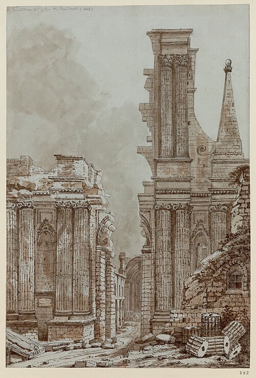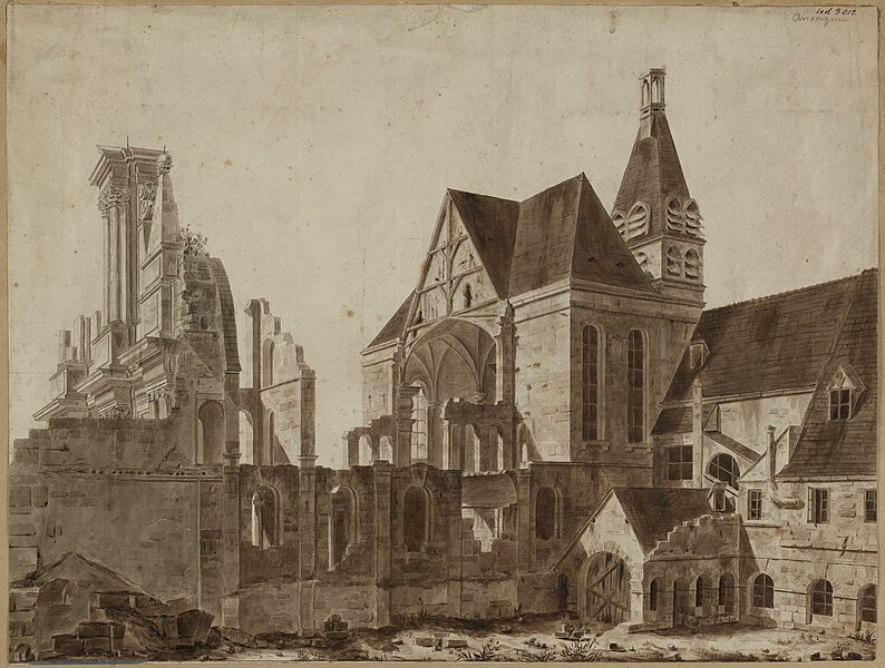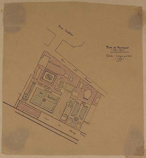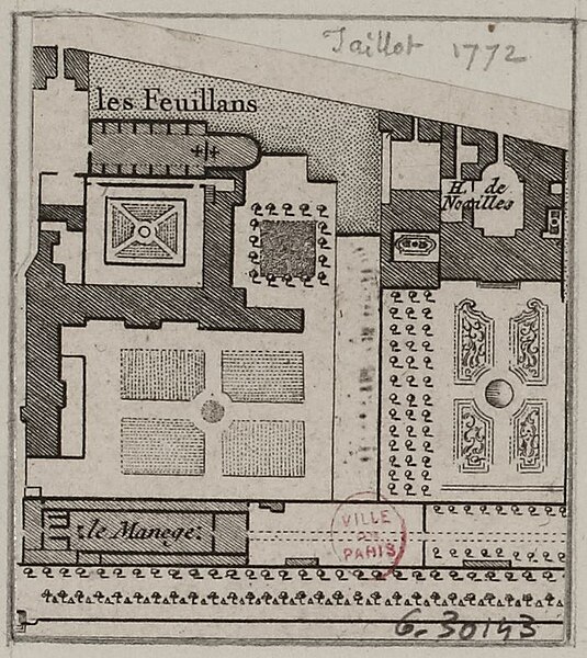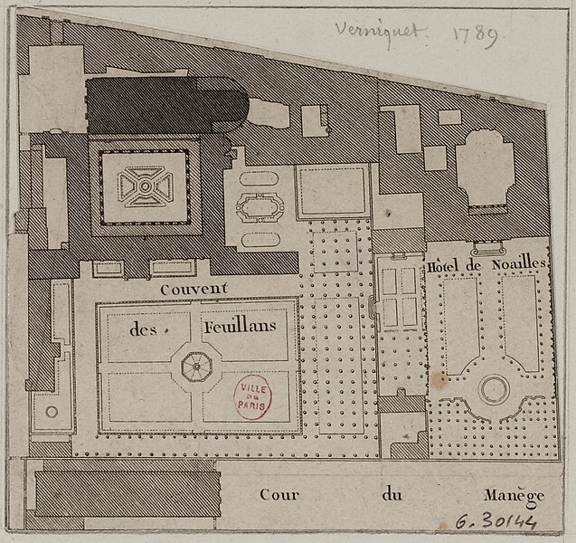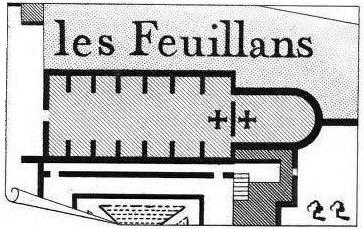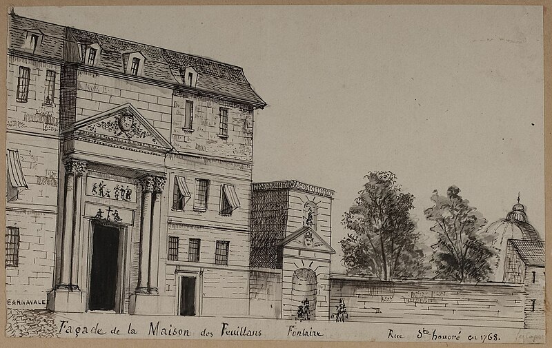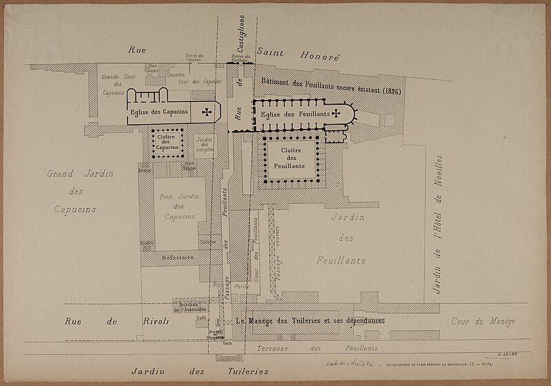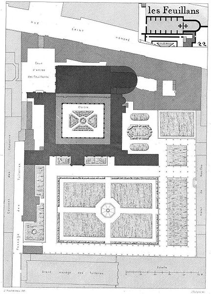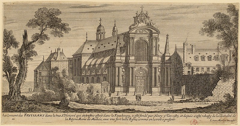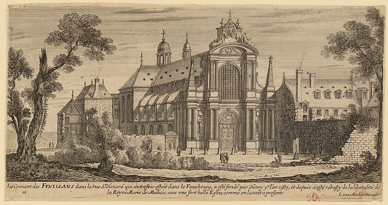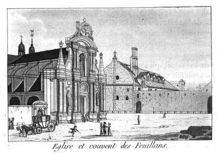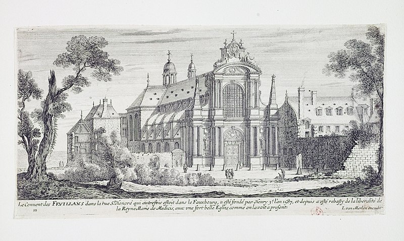 Le monastère royal de Saint‑Bernard, dit couvent des Feuillants, se trouvait rue Saint‑Honoré à Paris, derrière les actuels nos 229‑235, près de l’angle de la rue de Castiglione. Fondé en 1587 par Henri III pour des religieux de l’ordre cistercien réformé des Feuillants, il reçut une soixantaine de moines venus de l’abbaye de Toulouse et fut installé en septembre de la même année. Les premiers travaux de construction et d’aménagement furent confiés à l’architecte du roi Baptiste Androuet du Cerceau et dirigés par un membre de la communauté. Protégé et enrichi par la monarchie, le couvent obtint privilèges et terrains et reçut des revenus d’autres abbayes et immeubles de rapport. L’église dédiée à saint Bernard de Clairvaux, achevée en 1608 grâce aux aumônes du jubilé de 1600, fut dotée d’une façade monumentale en 1624, œuvre de François Mansart exécutée par le maçon François Boullet. Conçue par le frère Étienne de Saint‑Ignace selon les principes de la Contre‑Réforme, l’église présentait un transept peu saillant, des chapelles latérales remplaçant les bas‑côtés et un chœur voûté d’ogives, tandis que la nef offrait l’espace nécessaire à de nombreux monuments funéraires et toiles. L’édifice renfermait des œuvres et monuments signés ou attribués à des artistes tels que Simon Vouet, Jacob Bunel, Charles de La Fosse, Nicolas Renard, Philippe de Buyster et Jean II Restout, ainsi que des tombeaux de familles nobles. Au XVIIIe siècle le couvent possédait une riche bibliothèque, une apothicairerie aux boiseries remarquables, un réfectoire orné de toiles de Restout et un cloître décoré de fresques d’Aubin Vouet et de verres peints consacrés à Jean de La Barrière. Séculiarisé et nationalisé par les décrets des 13 et 16 mai 1790, le couvent fut progressivement désaffecté ; ses bâtiments hébergèrent alors bureaux, comités et services liés à l’Assemblée nationale, et la nef de l’église servit d’atelier à Jacques‑Louis David pour la réalisation du Serment du jeu de paume. Le site accueillit également le Club des Feuillants, une société politique issue d’une scission des Amis de la Constitution. Sous le Consulat, la plupart des bâtiments furent démolis pour permettre l’ouverture des nouvelles voies, mais subsistèrent des immeubles de rapport rue Saint‑Honoré (nos 229‑235), construits pour la communauté par l’architecte Jacques‑Denis (Denis) Antoine vers 1776 et inscrits aux Monuments historiques en 1987, ainsi que le chevet arrondi de l’église, encore repérable dans la cour d’un de ces immeubles. Avant leur destruction, le portail d’entrée, attribué à Jean Richer d’après un dessin de Libéral Bruand et sculpté par Anguier, formait l’aboutissement de la perspective de la place Louis‑le‑Grand mais fut détruit lors de l’ouverture de la rue de Castiglione. Aujourd’hui, les vestiges conservés — les immeubles néoclassiques de la rue Saint‑Honoré et le chevet en arrière‑cour — constituent les derniers témoins matériels du couvent des Feuillants et de son histoire religieuse, artistique et politique.