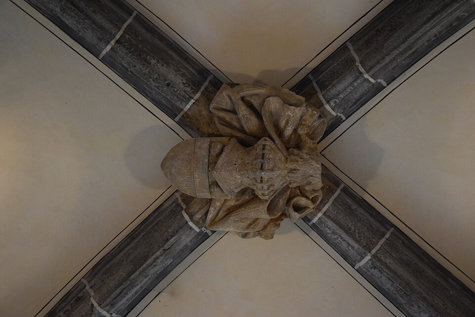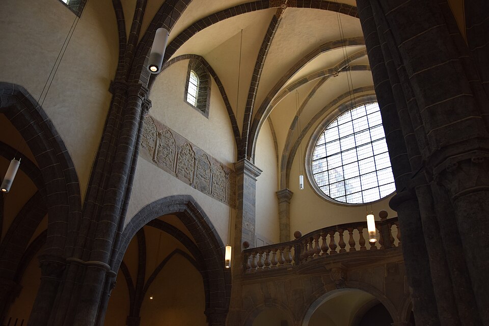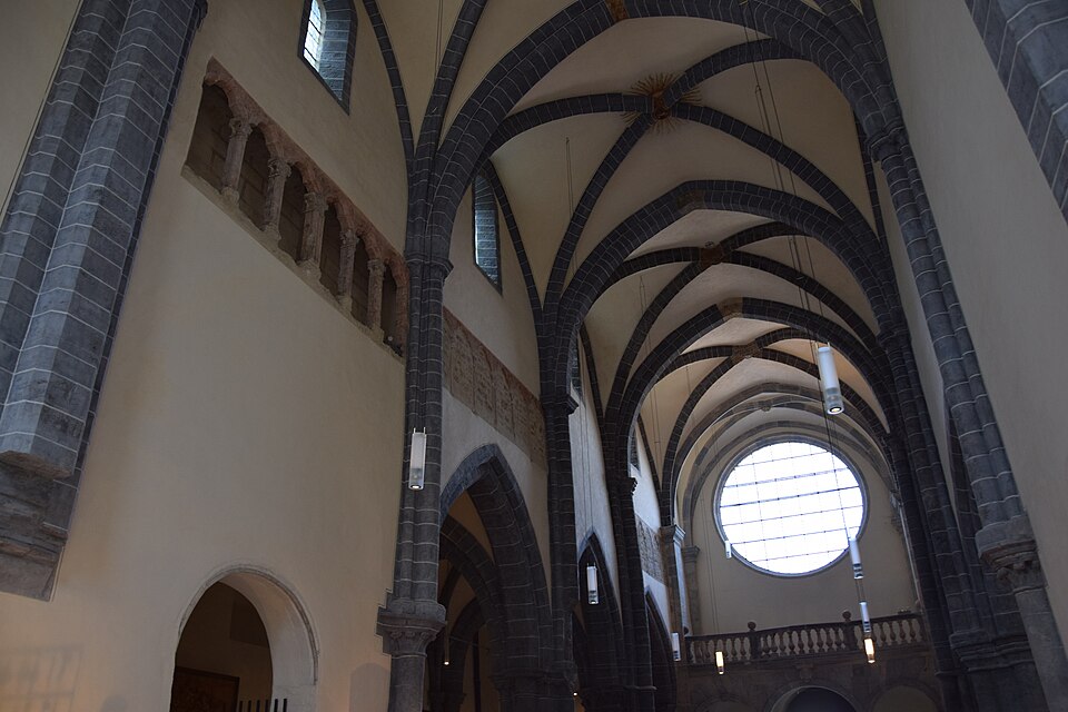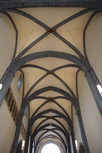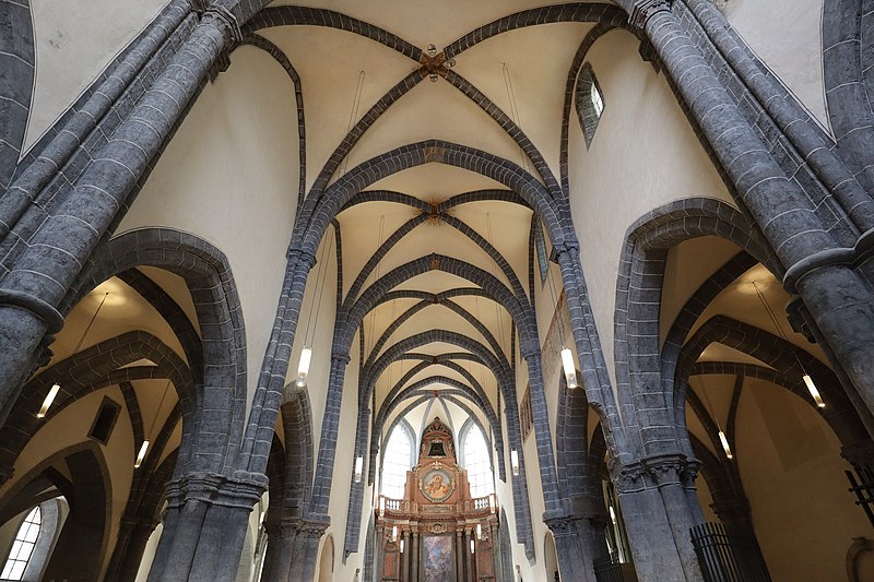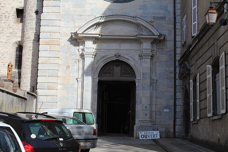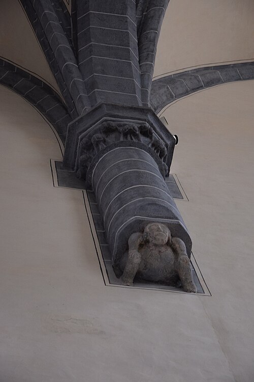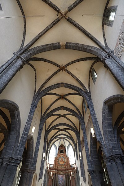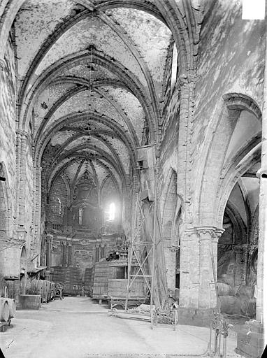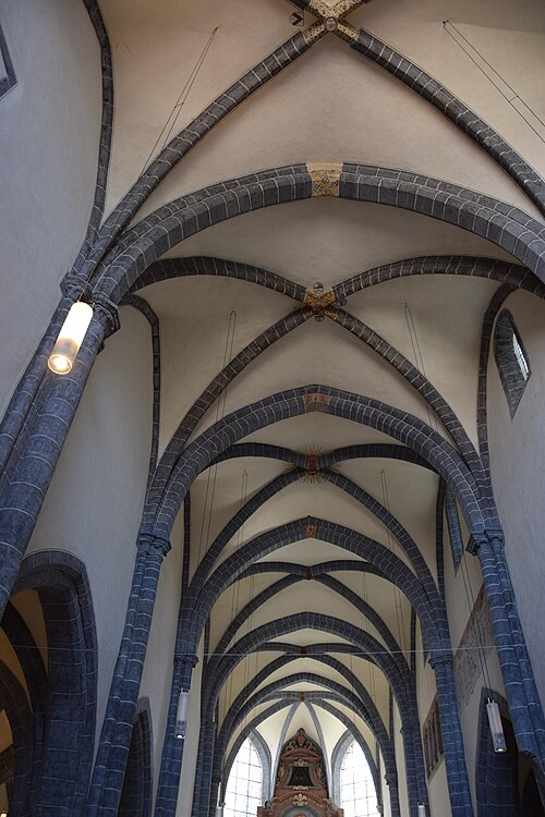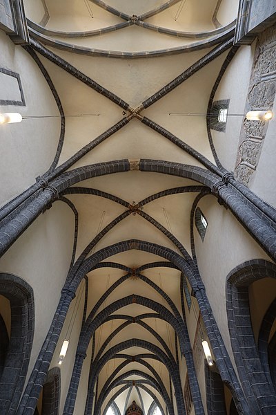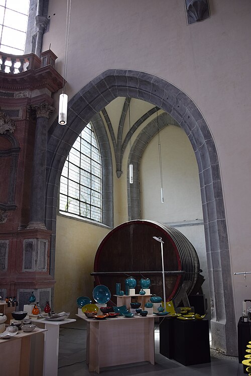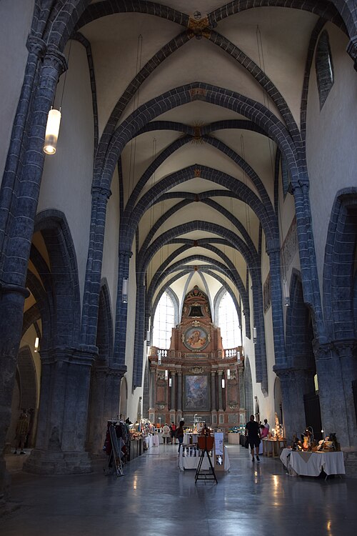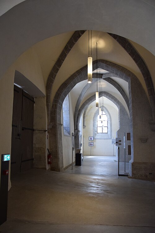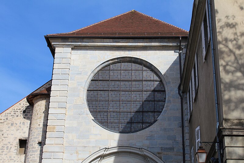 L'église conserve l'essentiel de son architecture gothique sobre ; des chapelles latérales furent ajoutées au nord aux XIVe et XVe siècles. Au XVe siècle, une grosse tour carrée, dite « tour de la Bibliothèque », coiffée d'un clocheton à l'impériale et pourvue d'une horloge, fut intégrée aux remparts de la cité et du château. Des ouvertures à meneaux et une porte datent du XVIe siècle.