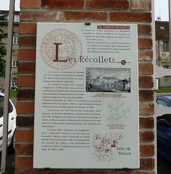 Situé à Melun, en Seine‑et‑Marne, l'ancien couvent des Récollets est un ensemble monastique dont l'installation remonte au début du XVIIe siècle : les Récollets vinrent à Melun en 1606 et la première pierre de leur église fut posée en 1616. Des travaux importants furent menés à partir des années 1680 — construction d'un aqueduc depuis la fontaine Saint‑Liesne (1681), agrandissement du dortoir (1682), début du nouveau cloître (pose de la première pierre en 1701) et ouverture de nouvelles fenêtres à l'église (1702) — sous la conduite du frère convers et architecte Anselme Bardon. En 1760, le couvent fut incendié par la foudre et pillé ; l'église fut reconstruite de 1761 à 1763. Transformé en hôpital en 1793, le site remplaça alors les hôtels‑Dieu Saint‑Jacques et Saint‑Nicolas ; les bâtiments conventuels furent affectés aux femmes et au personnel, tandis que l'ancienne église, aménagée par un plancher, servit de salles pour les hommes. Les Filles de la Charité s'y installèrent en 1798. Au XIXe siècle, une deuxième cour fut ouverte au sud en 1829; l'hôpital fut agrandi au nord selon les projets de l'architecte E. Gilson, les travaux débutant en 1855 et aboutissant, après le legs de Louis Armagis (1857), à la réalisation du "quartier des hommes" en 1862. La chapelle, restituée au culte à cette occasion, vit son mobilier et sa décoration réaménagés par l'abbé Jules Dégout. Entre 1893 et 1897 fut construite une maternité sur l'emprise des jardins, d'après les plans des architectes Bulot et Bernad‑Renaut, puis un sanatorium fut élevé à l'est en 1932 sur les plans de l'architecte Richardot. Dans la seconde moitié du XXe siècle, le centre hospitalier se modernisa, avec la création d'un centre psychiatrique en 1967 et l'inauguration du nouvel hôpital en 1975. Les bâtiments hérités du couvent n'ont plus de fonction hospitalière aujourd'hui : les anciens bâtiments conventuels autour du cloître sont désaffectés et ce dernier a perdu une partie de ses arcades en 1958. La chapelle, d'origine XVIIIe siècle et réaménagée au XIXe siècle, demeure affectée au culte. L'ensemble a été inscrit au titre des monuments historiques en 1994. Un projet de nouvel hôpital, commun à Melun et à la ville nouvelle de Sénart, est actuellement à l'étude sur un site au nord de la ville.