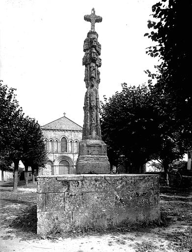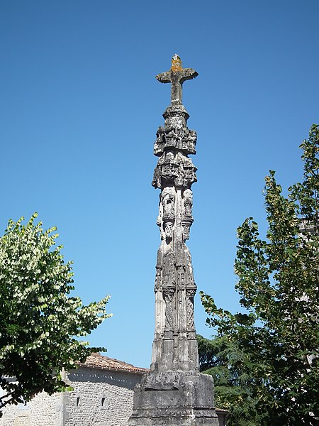 La croix de cimetière de Nieul‑le‑Virouil (Charente‑Maritime, Nouvelle‑Aquitaine) est datée du XVe siècle et se trouve sur la place de l’église, à l’emplacement de l’ancien cimetière. Inscrite au titre des monuments historiques le 23 février 1925, elle repose sur des marches en pierre et présente, sur plusieurs niveaux, des personnages dont certaines sculptures semblent avoir été mutilées pendant la Révolution ou altérées par le temps. La face ouest est partiellement taillée en glacis ; son arête saillante forme un pupitre destiné à recevoir un missel, et les angles arrondis en saillie pouvaient recevoir le pied creux d’un chandelier. L’ensemble est décoré de colonnes torses et de nervures prismatiques, qui animent la silhouette de la croix.