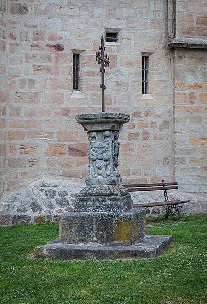 La croix est récente. La partie médiane du socle était constituée d'une pierre de remploi sculptée en grès, dont la provenance est inconnue. Les quatre faces du pilier portent une tête ou un masque sculpté au centre d'un cartouche au découpage complexe, dont les bords se retournent en épaisses volutes. L'ensemble est lourdement chargé d'ornements baroques, notamment de linges et de cordelières, toujours disposés selon une symétrie axiale rigide.
