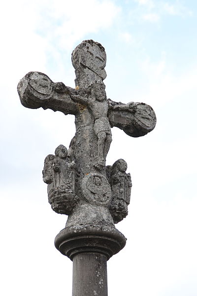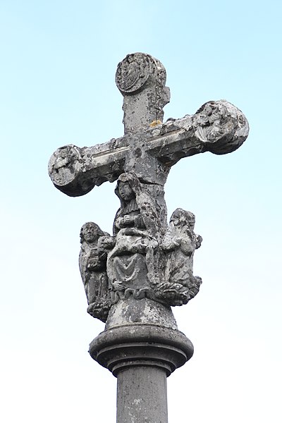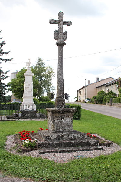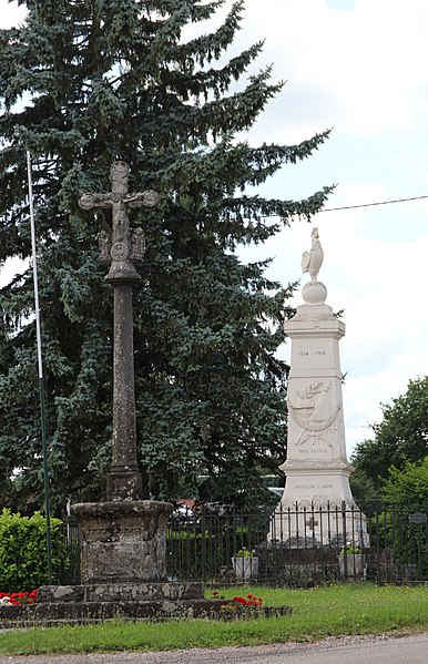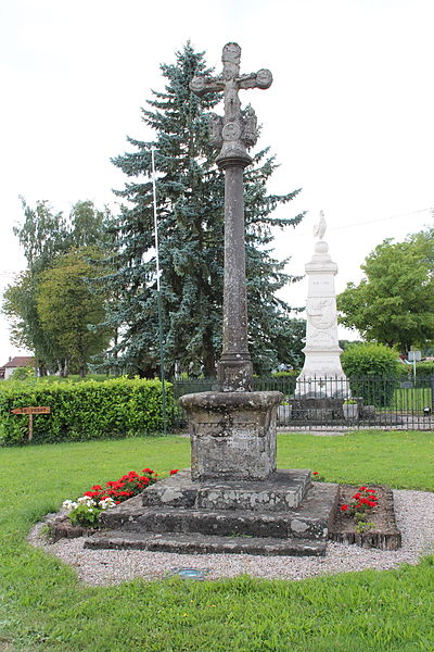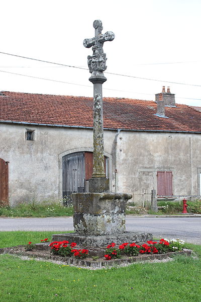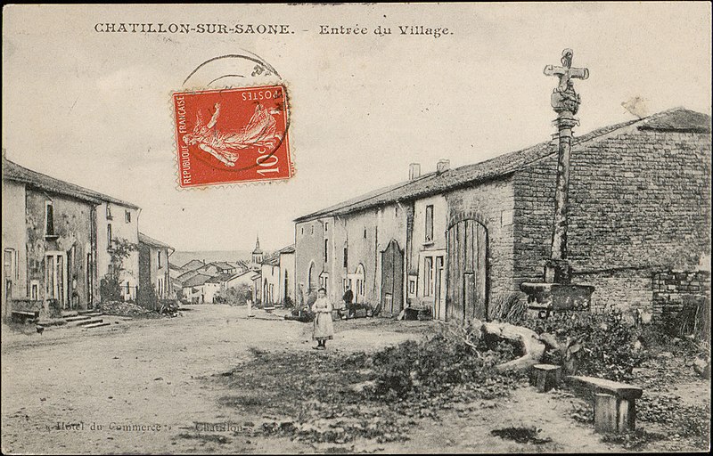 La croix de carrefour de Châtillon-sur-Saône, située en haut du village au carrefour de la Grande Rue et de la route d'Enfonvelle, marque la sortie vers Fresnes-sur-Apance et Bourbonne-les-Bains. Elle est en pierre et repose sur un piédestal de maçonnerie en forme de reposoir, surmonté d'une colonne coiffée d'un chapiteau ionique, elle-même couronnée par une croix à bras égaux sculptée. Le piédestal porte l'inscription « À la dévotion de Monsieur GARNIER, prêtre de ce lieu. 1809. O CRUX AVE ». La croix présente un riche décor sculpté : à gauche du Christ figure saint Nicolas et à droite saint Sulpice tenant une crosse d'évêque ; aux extrémités des branches se trouvent les symboles des quatre évangélistes accompagnés de leurs initiales. Au revers, une Vierge de Pitié est représentée entre saint Jean et sainte Madeleine, et autour d'elle quatre anges portent les instruments de la Passion aux extrémités des branches. Datant du XVIIe siècle, la croix a été classée monument historique par arrêté du 14 juin 1909. La commune compte plusieurs autres croix monumentales, parmi lesquelles la croix Bacchanée sur le chemin des vignes — calvaire élevé en 1946 pour remplacer un modèle plus ancien dont il ne reste que le socle —, la croix de Potot ou croix des Vignes, la croix Saint-Sulpice au bord de la route de Lironcourt et une croix sur la route de Jonvelle qui a souvent été déplacée. Des photographies et une notice sont consultables dans la base Mérimée et sur Wikimedia Commons.