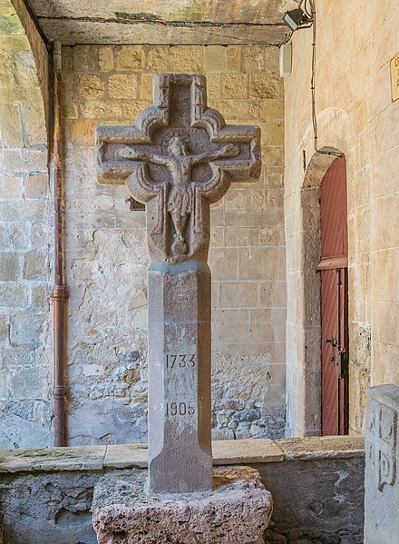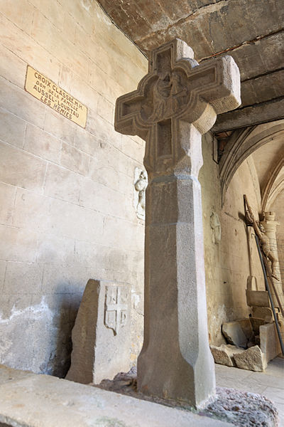 Croix située sur la route de Lodève, près d'un pont franchissant le ruisseau de l'Aubaigues. La partie sculptée, ancienne, a été remontée sur un fût de colonne au XVIIIe siècle. Sur une face, le Christ est représenté en haut-relief sur une croix évidée, entourée d'une moulure qui dessine un médaillon quadrilobé ; il porte le nimbe crucifère et une jupe jusqu'aux genoux. La face opposée, organisée de la même façon avec croix évidée et moulure formant le médaillon, montre la Vierge assise tenant l'Enfant debout sur ses genoux.