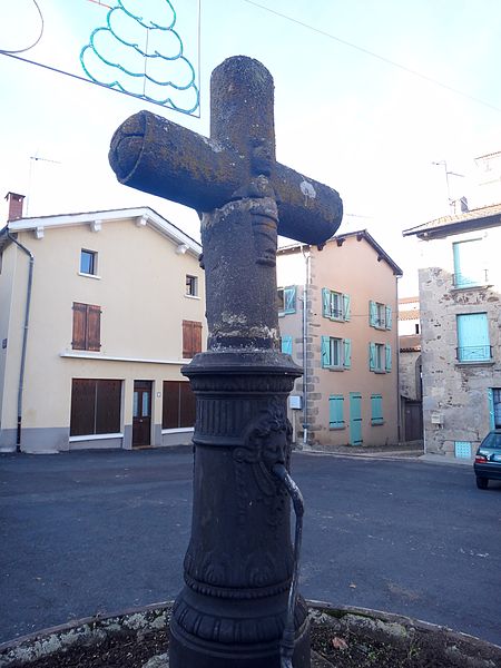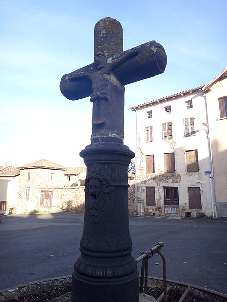 Cette croix de chemin, datée du XVIe siècle, porte d’un côté le Christ et de l’autre la Vierge tenant l’Enfant. Les extrémités sont fleuronnées et des accolades, placées dans les angles, soutiennent les bras. Elle est mentionnée au cadastre de 1836 au même emplacement qu’au XXe siècle. Accidentellement endommagée en 1988, elle a été restaurée et remise en place en 1989.