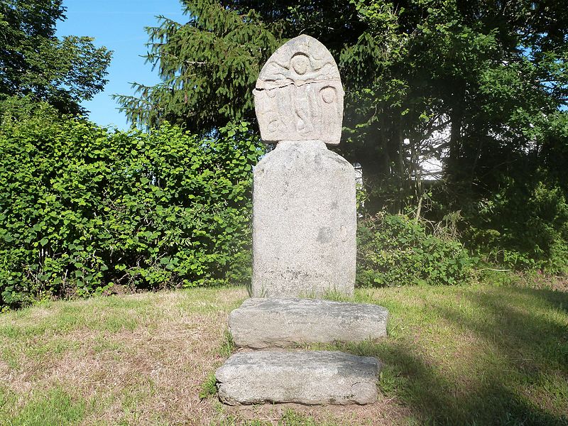 Croix (d'origine mérovingienne ?) taillée dans un bloc de pierre épais de forme semi-losangique. Une silhouette du Christ en croix, figurée en fort relief, occupe le centre. L'ensemble constitue un édicule daté de la fin du XVIe siècle ou du début du XVIIe siècle, dont ne subsistent aujourd'hui que le socle et le tableau supérieur.