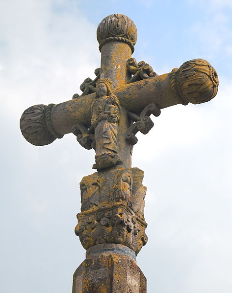 Croix en lave de Volvic reposant sur un soubassement à trois degrés de plan circulaire. Au-dessus, un socle cubique présente des angles supérieurs fortement arrondis. Le fût, de forme cylindrique, repose sur ce socle et est flanqué de quatre petits contreforts. La tête est séparée du fût par un groupe de quatre personnages ; les trois branches supérieures se terminent par des pommes ornées de feuilles plates et des feuillages ajourés entre ces branches forment un nimbe. Sur la partie basse du fût est gravée la date 1814.