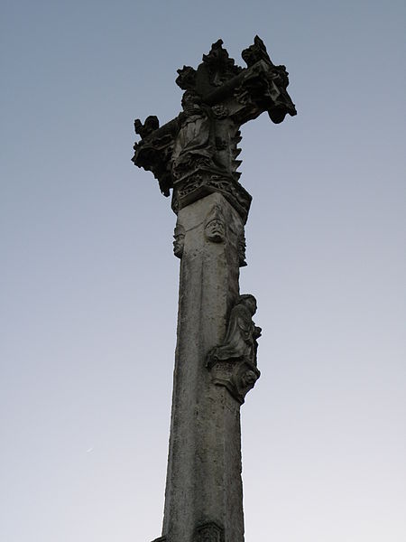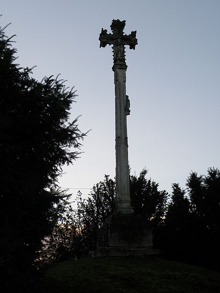 La croix de chemin dite « croix curé » se dresse sur la route menant à Arrelles, dans la commune de Polisy (Aube). L'ouvrage, classé au titre des monuments historiques en 1926, mesure 5,42 mètres de hauteur. Le fût est composé de deux parties d'égale hauteur : la partie basse est de section carrée, ornée d'une colonnette à chaque angle travaillée en torsade sur le tiers supérieur, tandis que la partie supérieure est polygonale à faces concaves. Un motif décoratif marque la jonction entre les deux sections. La croix est décorée de feuillages et porte, sur ses faces opposées, une Vierge à l'Enfant et un Christ en croix. Un texte, traduit approximativement par « ici espèrent tes fils fidèles », renvoie à la statue de la Vierge. Le donateur est figuré agenouillé sur la face nord, la tête tournée vers le Christ ; le socle de cette figure porte un écu où apparaît la tête de mort, symbole traditionnel de la fin du Moyen Âge inspiré de la gravure de Dürer de 1505. Sous la figure du donateur se lit un texte en lettres gothiques, et d'autres inscriptions encadrent l'écusson portant la tête de mort ; ces inscriptions, aujourd'hui effacées, sont connues par un dessin du milieu du XIXe siècle. La croix a été offerte par le curé de Polisy au début du XVIe siècle, en lien avec la pensée de sa mort et de son salut dans l'au-delà.