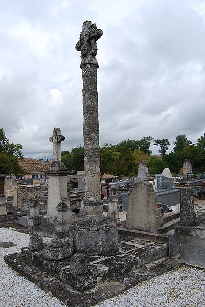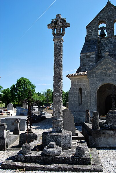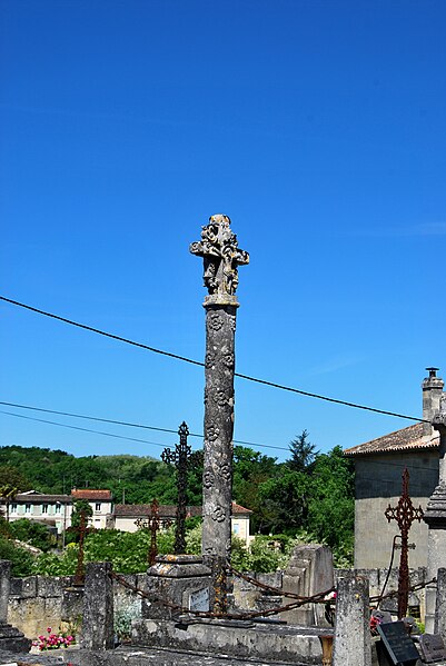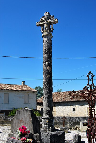 La croix de cimetière de Daignac est une croix hosannière située sur la commune de Daignac, en Gironde, dans l'Entre-deux-Mers, en face du portail de l'église Saint-Christophe. Les croix de cimetière apparaissent à partir du XVe siècle ; lorsqu'elles occupent le centre du cimetière, on les qualifie de croix hosannières, liées à la bénédiction des rameaux et le plus souvent réalisées par des maîtres maçons à la demande de seigneurs aisés. Elles mettaient en valeur le saint patron de la paroisse, une représentation du saint figurant généralement sur un des côtés de la croix sommitale. La croix de Daignac date du XVIIe siècle. Elle repose sur un socle carré et une base octogonale ; son fût est décoré de larges cannelures en spirale entre lesquelles de petites roses sont sculptées. La partie sommitale porte la croix : du côté est se voient le Christ en croix entre saint Jean et Marie, et du côté ouest un saint Christophe qui portait initialement le Christ sur ses épaules, flanqué à gauche d'un saint Jacques et à droite d'un personnage aujourd'hui méconnaissable. L'ouvrage est inscrit au titre des monuments historiques depuis le 24 décembre 1925. Des ressources documentaires, notamment la base Mérimée et des illustrations sur Wikimedia Commons, complètent les informations disponibles.