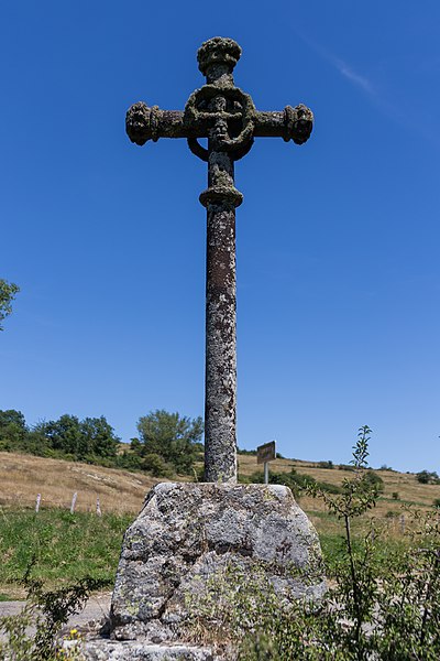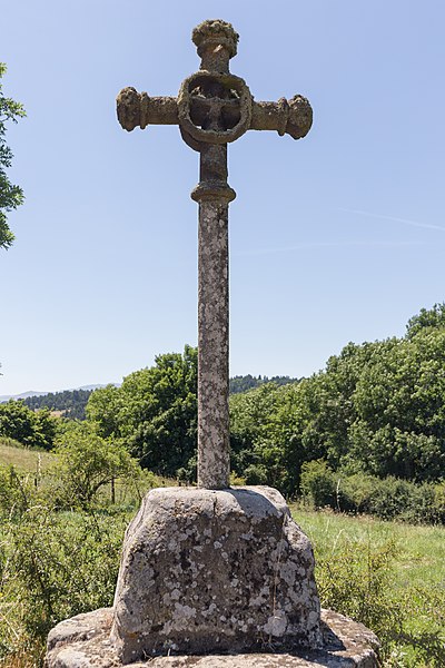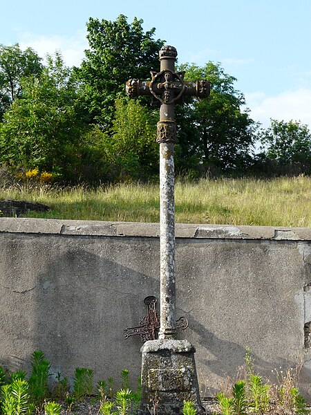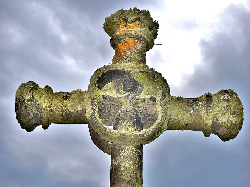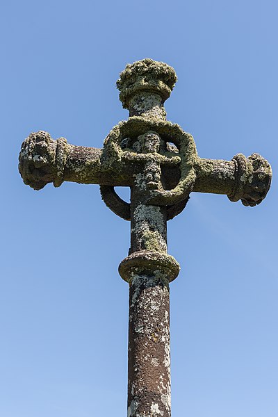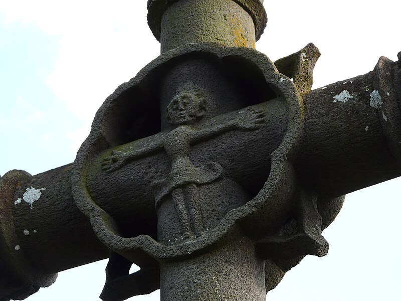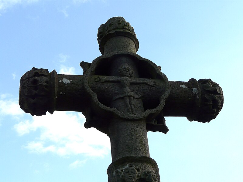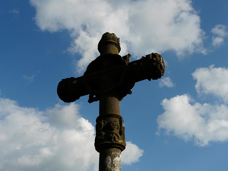Les branches supérieures de cette croix du XVIe siècle se terminent par des fleurons ornés de feuillage. Sur l'une des faces, le Christ est encadré par un nimbe polylobé à quatre redents qui occupe les angles formés par les bras ; le fût cylindrique est séparé de la tête par un bracelet cylindrique décoré de figures.