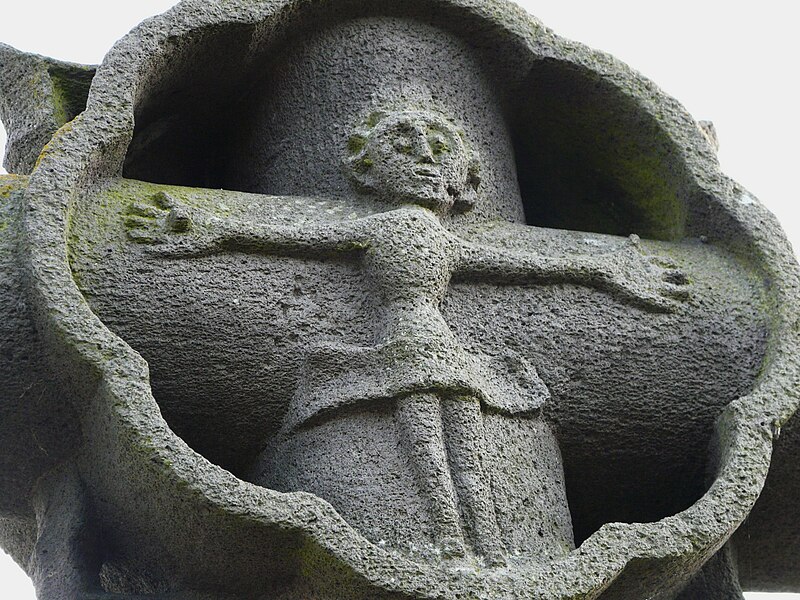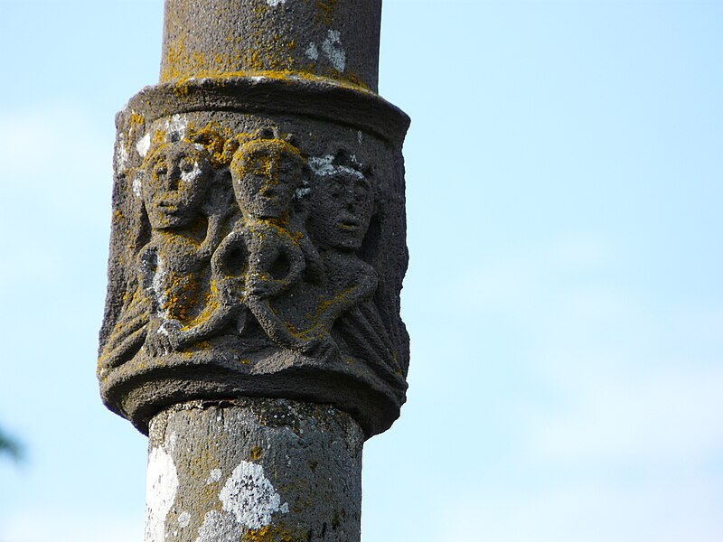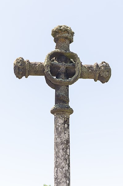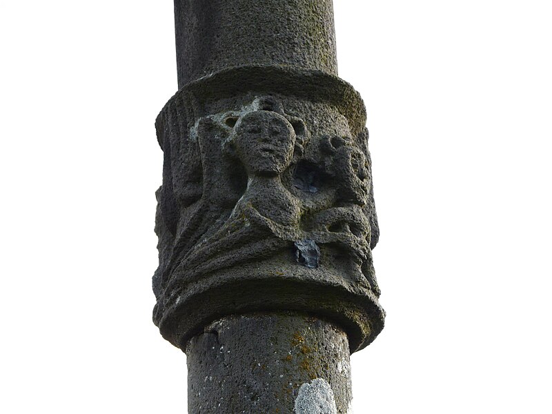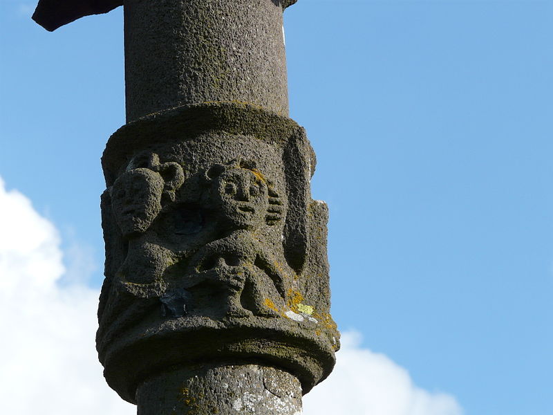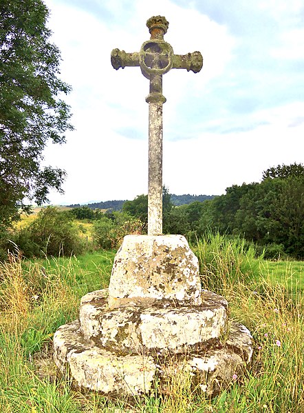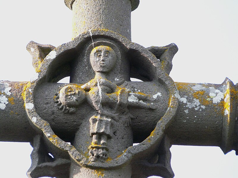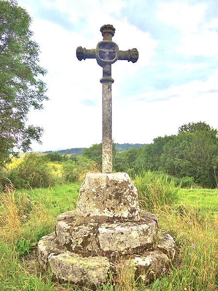 Les branches supérieures de cette croix du XVIe siècle se terminent par des fleurons ornés de feuillage. Sur l'une des faces, le Christ est encadré par un nimbe polylobé à quatre redents qui occupe les angles formés par les bras ; le fût cylindrique est séparé de la tête par un bracelet cylindrique décoré de figures.