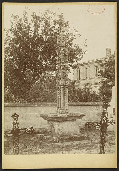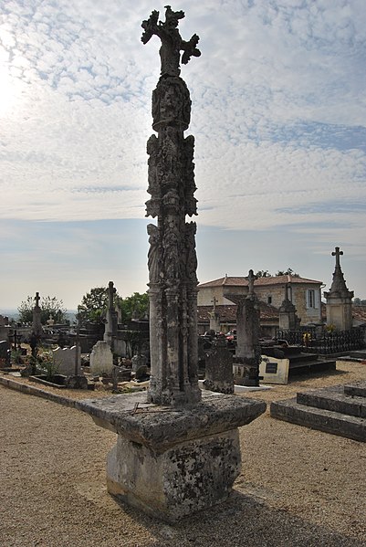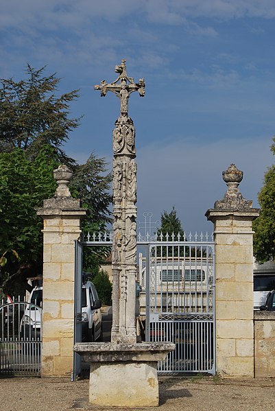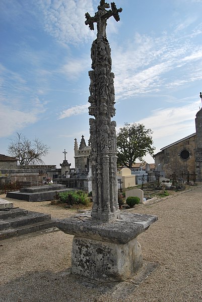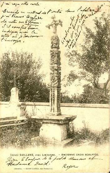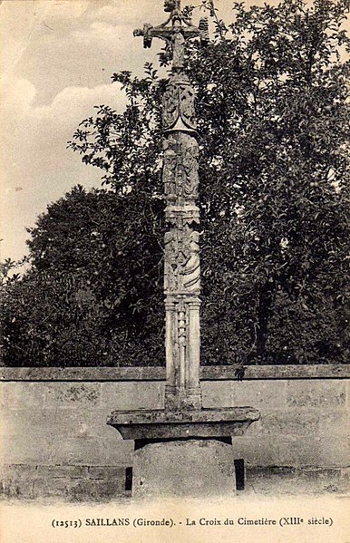 La croix de cimetière de Saillans est une croix hosannière située en face du portail occidental de l'église Saint‑Seurin, en Gironde. Les croix de cimetière apparaissent à partir du XVe siècle ; lorsqu'elles occupent le centre du cimetière on les qualifie de croix hosannières, associées à la prière Hosanna lors de la bénédiction des rameaux. Construites le plus souvent par des maîtres maçons et offertes par de riches seigneurs, elles mettent habituellement en valeur le saint patron de la paroisse, figuré sur un côté de la croix sommitale. Datée de 1573, celle de Saillans présente un fût sculpté richement orné et des statues réparties sur trois niveaux. Sous sa base carrée se trouve le caveau funéraire des curés de Saillans. Pour Léo Drouyn, c'est la mieux conservée du département ; il la décrit comme composée d'une base carrée avec une table d'autel, d'un fût rond orné de statuettes et d'ornements, et d'une croix richement décorée de fleurons et de statuettes. Le fût est structuré en quatre étages horizontaux, séparés verticalement par quatre pilastres à clochetons qui s'élèvent jusqu'au quatrième étage, lui‑même délimité par une moulure saillante. Dans l'étage inférieur s'élèvent quatre colonnes dont les chapiteaux servent de consoles à quatre statuettes formant le second niveau ; ces dernières sont surmontées de dais qui portent à leur tour quatre autres statuettes au troisième niveau. Orientée vers le solstice d'été, la croix présente au troisième niveau, dans les angles nord‑est, sud‑est, sud‑ouest et nord‑ouest, sainte Madeleine tenant un vase de parfums et ses cheveux, saint Antoine avec un marteau et une clochette, sainte Catherine coiffée d'une couronne fleurdelisée portant une épée et un livre avec la roue de son supplice à ses pieds, et saint Jean‑Baptiste vêtu de poils de chameau portant un agneau sur la main gauche. Les statuettes supérieures représentent, aux mêmes angles, saint Pierre coiffé de la tiare et portant les clefs, l'ange Gabriel tenant une fleur et bénissant, saint Paul armé d'une épée, et saint Michel en cotte de mailles tenant le dragon enchaîné. Entre saint Michel et saint Paul, un écusson porte la date 1543, indication qui, selon Drouyn, montre que l'on exécutait au milieu du XVIe siècle des monuments encore inspirés du style du XVe siècle. Les huit statuettes se détachent presque complètement du fût, tandis que les symboles des Évangélistes couvrant le quatrième étage sont traités en bas‑relief. La croix sommitale est très élégante et couverte d'ornements de la décadence gothique ; les extrémités des branches étaient ornées de larges fleurons en feuilles frisées encadrant une tête d'ange, dont un seul motif est resté intact. À l'occident figure un crucifix vêtu d'une simple bande d'étoffe, les pieds attachés par un seul clou et une tête de mort placée au‑dessous ; à l'orient on trouve saint Seurin, patron de la paroisse, tenant une crosse et bénissant. Malgré une dégradation légère, le monument est d'ensemble remarquable ; Drouyn estime toutefois que les statuettes, d'un dessin médiocre, rendent la composition inférieure à celles de Saint‑Projet et de Marcillac, et que si la croix sommitale avait davantage d'ampleur, le monument aurait pu être un chef‑d'œuvre. La croix fait l'objet d'un classement au titre des monuments historiques depuis le 20 décembre 1907.