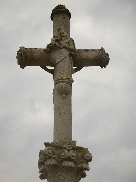Le chapiteau est d'ordre corinthien dit « bâtard », de proportions harmonieuses. La croix, élevée sur un petit socle, présente une hampe arrondie dont les croisillons et l'extrémité se terminent par un culot fleuri épanoui en pétales renflés autour d'un bouton central. Elle porte un Christ en relief sur une face et, sur l'autre, une Vierge diadémée tenant l'Enfant sur son bras droit. Le Christ se distingue par une disposition rare des pieds, l'un posé à plat sur l'autre, et la Vierge par la tenue de l'Enfant sur le bras droit, caractéristique peu commune dans l'iconographie.