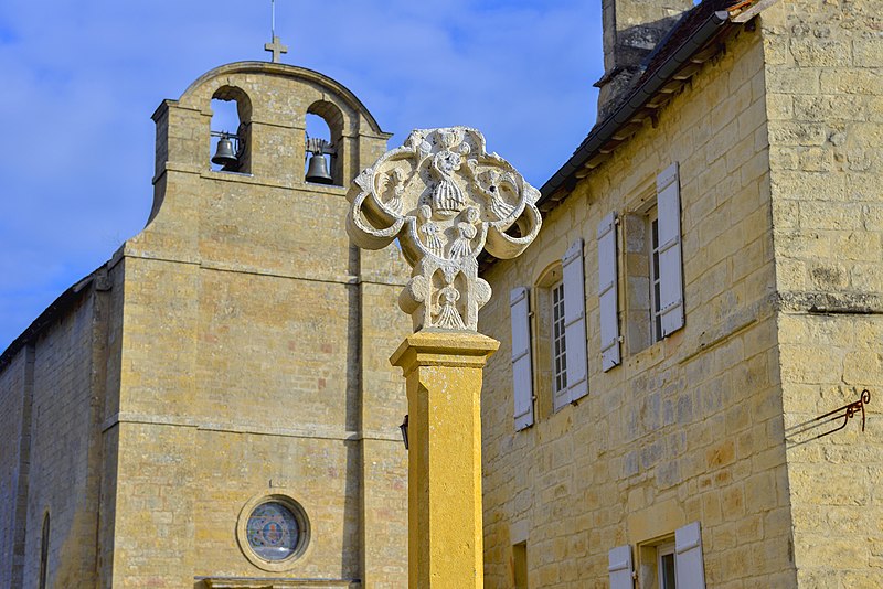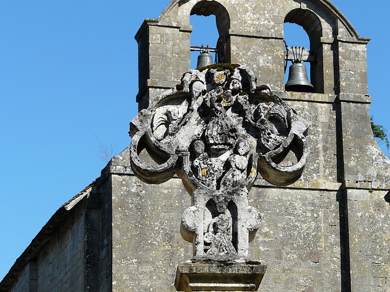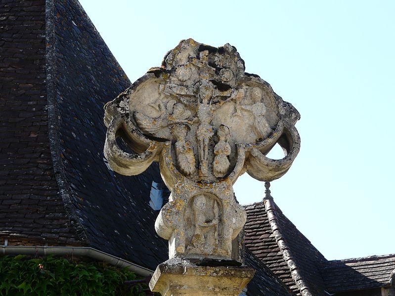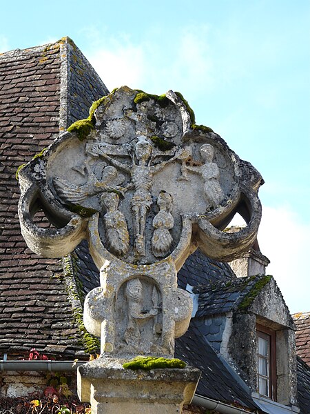 Croix sculptée dont le costume du chevalier en prière suggère une datation possible à la fin du XIVe ou au début du XVe siècle. Sur la face orientale, un Christ en croix est entouré de quatre anges aux ailes déployées tenant des calices ; en dessous, dans une petite niche, un chevalier en armure, coiffé d’un casque, est agenouillé et tourne la tête vers la croix. La face occidentale montre une Vierge en gloire entourée d’anges. La colonne et le socle ont été refaits et portent la date de 1883.