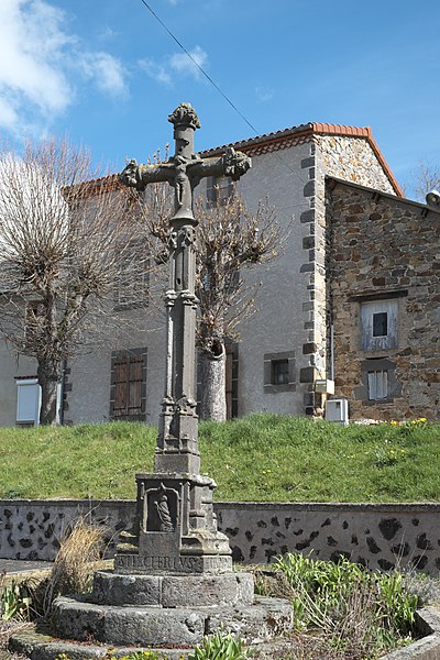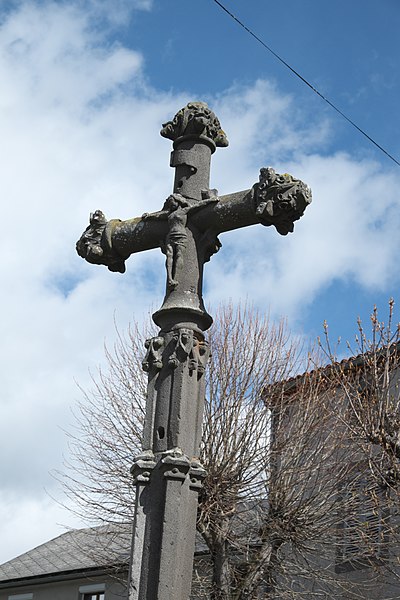 Croix en lave datée de la fin du XVe ou du XVIe siècle, sculptée sur la face antérieure d’un Christ et sur la face postérieure d’une Pietà reposant sur un cul-de-lampe.