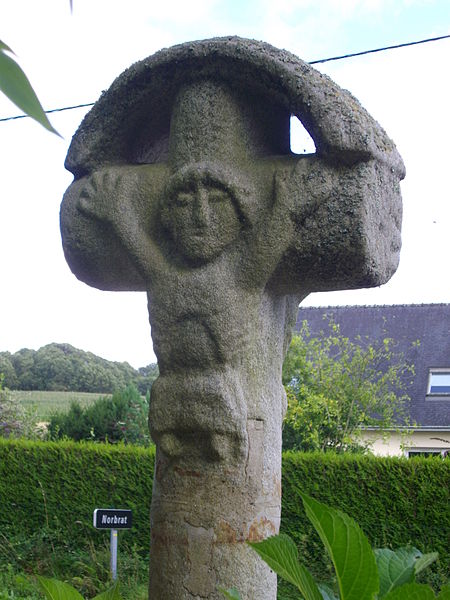 Croix de chemin avec le Christ représenté sur chacune des deux faces, abrité sous un auvent en cintre surbaissé ; la partie inférieure du Christ est manquante. La croix de Norbrat est située à l'entrée du lieu-dit Norbra, à l'intersection de la route départementale 308 et de la route Er-Goua (ancien chemin Hent Conan, reliant la Vilaine au Blavet), sur la commune de Meucon, dans le Morbihan. Elle fait l’objet d’une inscription au titre des monuments historiques depuis le 30 mai 1927. Cette croix présente, comme la croix de mission à Brandivy, la particularité rare d’avoir un Christ sculpté sur chacune des deux faces. Pour approfondir, on peut consulter les notices et portails consacrés aux monuments historiques du Morbihan et à la commune de Meucon, ainsi que les ressources en ligne telles que Topic-Topos (calvaire de Norbrat, Meucon), le Portail des monuments historiques français, le Portail de Vannes et de sa région et le Portail de l’architecture chrétienne.