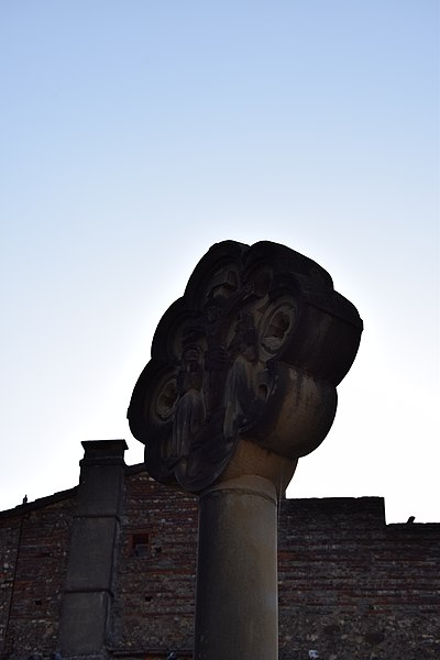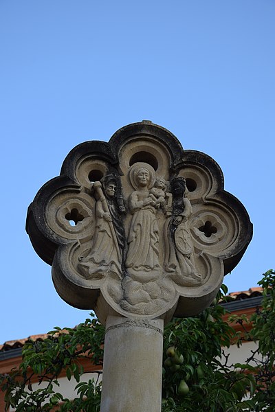 La croix en pierre, monumentale, se dresse au centre du village de Daumazan-sur-Arize (Ariège). Elle est sculptée sur ses deux faces et présente une silhouette à huit lobes, dont quatre plus petits correspondant aux diagonales. La moulure est cernée de rosettes et la tranche était ornée de fleurons sur tout le pourtour. Sur une face, la scène de la Crucifixion montre le Christ en croix, accompagné de la Vierge et de saint Jean ; les lobes qui portent ces deux personnages se terminent par un fenestrage ajouré. Au revers, la Vierge tenant l’Enfant occupe le centre, avec sainte Catherine à droite et saint Jacques à gauche. La croix repose sur une colonne moderne, elle-même posée sur un piédestal carré à soubassement régressif. Le monument, daté du XVe siècle, est classé au titre des monuments historiques par arrêté du 6 juillet 1907.