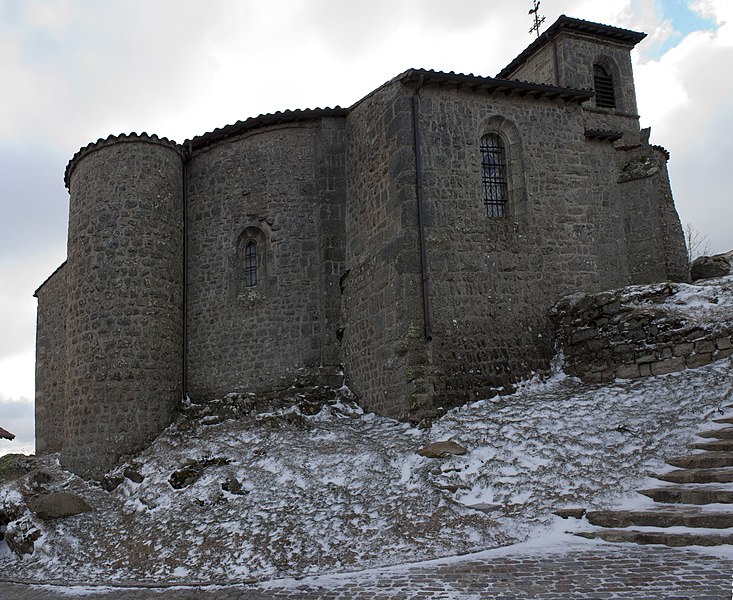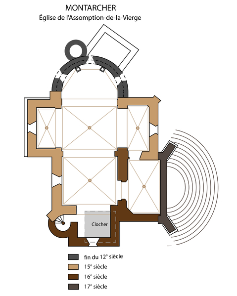 L'église de l'Assomption-de-la-Vierge est un édifice catholique situé à Montarcher, dans la Loire (Auvergne-Rhône-Alpes), classé au titre des monuments historiques depuis 1938. Elle s'élève au centre du village, à proximité de l'ancien donjon dont subsiste le remblai de motte castrale, et se trouve sur le chemin de Cluny, préambulaire de la via Podiensis. Construite sur un éperon rocheux, l'église occupe vraisemblablement l'emplacement d'un lieu de culte gaulois, évoqué par une statuette de déesse mère allaitant deux enfants fixée au mur du porche, au-dessus du banc des pèlerins. Simple chapelle dépendant de la paroisse d'Estivareilles, elle devint paroisse après l'intervention du vicaire Claude Ferrier. Le bâtiment résulte d'une construction médiévale : au XIIe siècle la chapelle du château fut agrandie et adossée aux fortifications, et la tour sud-est conservée abrite aujourd'hui la sacristie. Le chevet, en forme de tour ronde, comporte une abside en cul-de-four. La nef et les deux chapelles latérales datent du XVe siècle et témoignent d'un gothique dépouillé. Au XVIe siècle, la façade occidentale fut reconstruite pour supporter le clocher, et un vaste porche s'appuie sur un banc en granite destiné au repos des pèlerins. Un nouveau porche, orienté plein sud, compléta l'édifice au XVIIe siècle ; il permettait de rassembler les paroissiens autour du Christ sculpté sur une croix de style bourguignon, dont l'autre face porte la Vierge tournée vers l'extérieur en signe de protection. À l'intérieur, à la jonction du chœur et de la nef, une poutre de gloire du XVIe siècle illustre la Création, à l'instar de celle de Saint-Haon-le-Châtel, plus haut sur le chemin de Cluny. Les corbeaux, ornés d'une spirale, évoquent la création de l'univers (Genèse 1-3) ; la première courbe, décorée de fougères et de fleurs, représente la création de la terre (Genèse 1-12). Sur les contre-courbes, cinq personnages en procession figurent la création de l'homme accomplissant la volonté divine (Genèse 1-27:30), et les rosaces terminales expriment le rayonnement de la Gloire divine (Genèse 1-31). Les deux parties de la poutre se rejoignent sous le crucifix portant le Christ, présenté comme l'aboutissement de la création, et le linceul suspendu sous la croix évoque la libération du Christ de la mort. Jusqu'à la fin du XVe siècle, les habitants de Montarcher devaient parcourir près de huit kilomètres pour être ensevelis au cimetière d'Estivareilles. Après l'accession du village au statut de paroisse, le vicaire Claude Ferrier obtint l'autorisation de créer un cimetière hors les murs, près de l'église ; de cette époque subsistent une croix sobre et plusieurs dalles tumulaires, dont l'une serait la pierre tombale d'un seigneur de la lignée des Rochebaron. La croix de Montarcher, croix de chemin construite en 1497 sous l'impulsion de Claude Ferrier et portant son monogramme, est inscrite aux monuments historiques depuis le 4 août 1978 ; on y accrochait une lanterne au croisillon pour signaler la mort d'un paroissien. Sur le parvis et dans l'ancien cimetière se lisent encore la déesse mère, la tour de la sacristie et le chevet du XIIe siècle, la dalle tumulaire et la croix de chemin.
