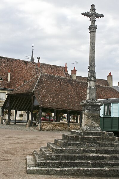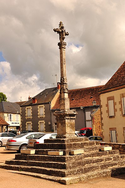 La croix-calvaire repose sur un socle et présente un fût formé de pilastres à quatre faces, surmonté d’un chapiteau de caractère François Ier. Elle est couronnée d’une croix qui porte, sur une face, le Christ et, sur l’autre, la Vierge à l’Enfant.