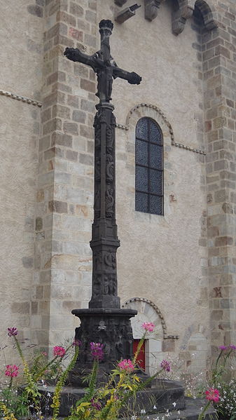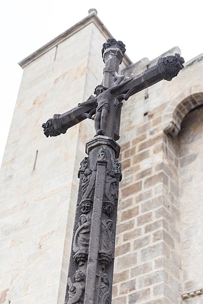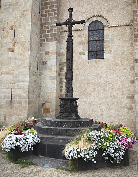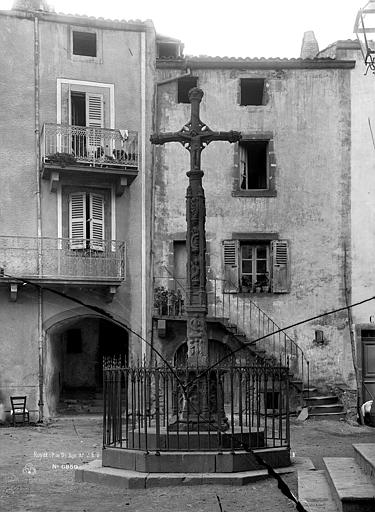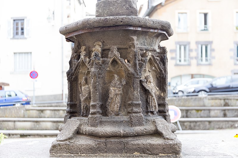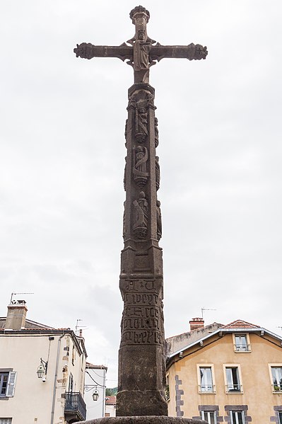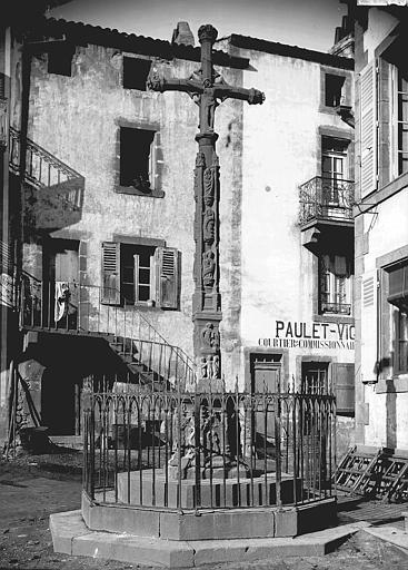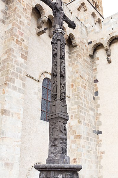 Réalisée en pierre de lave, la composition se divise en deux éléments distincts : la croix elle-même et le piédestal, ce dernier provenant à l'origine d'un autre monument. Le piédestal repose sur trois marches, mesure 87 centimètres de hauteur et présente une forme octogonale encadrée par huit pilastres ; entre ces pilastres se trouvent huit sculptures de personnages aux proportions régulières dont l'identité demeure incertaine, Eugène Viollet-le-Duc y discernant des prophètes. Il est surmonté d'une table polygonale.