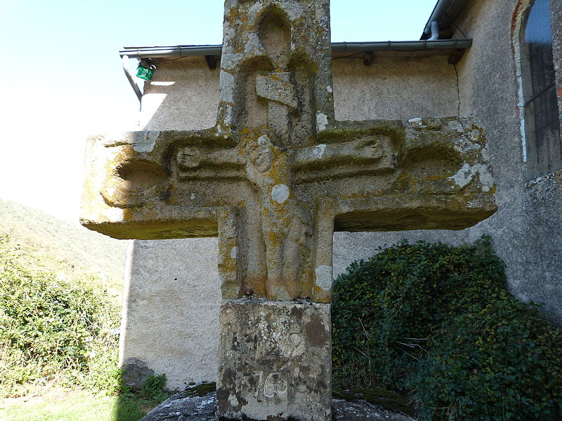 La croix se trouve dans l'ancien cimetière d'Ambialet, dans le Tarn (Occitanie). La date 1759-1760 est gravée sur un dé de section carrée qui sert de support ; la croix y est scellée au mortier. Le raccord net entre ce support et la partie sculptée, qui coupe le fleuron de base et les pieds des personnages, suggère une ré-érigée et laisse entendre que la partie sculptée est sensiblement antérieure à 1759, éventualité parfois rapportée comme une origine au XVe siècle. Sur chacune des faces, un fleuron taillé en réserve dessine un arc lobé aux écoinçons légèrement évidés. La face antérieure porte une croix ornée de l'inscription INRI ; la tête du Christ, affaissée sur la poitrine, s'incline fortement vers la gauche tandis que le corps se décale vers la droite ; en contraste, les membres, surtout les bras, apparaissent raides et traités de façon rudimentaire. La face postérieure présente, dans un évidement analogue, une Vierge couronnée tenant l'Enfant et un sceptre. La croix d'Ambialet est inscrite au titre des monuments historiques par arrêté du 20 octobre 1971.