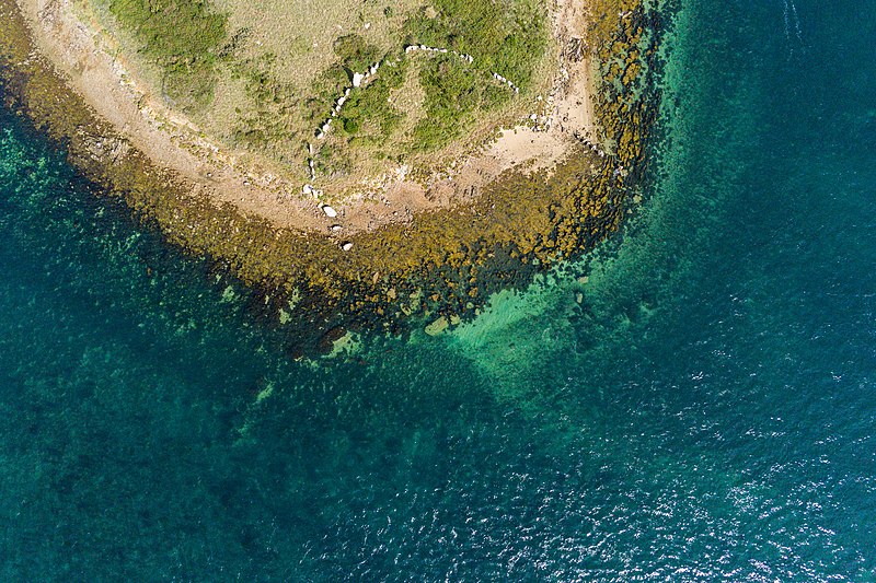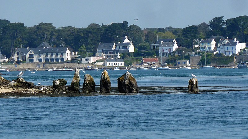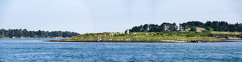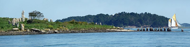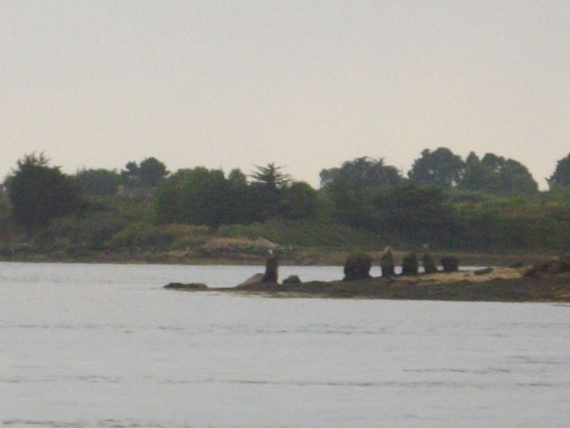 Les deux menhirs isolés, l'un situé au large du rivage ouest et l'autre près du rivage est, mesurent respectivement 3 m de hauteur et 7 m de longueur; leur éventuel alignement n'éclaire pas clairement leur relation avec les enceintes. Les dalles employées sont en granulite et en migmatite d'origine locale; quatre d'entre elles, dans l'enceinte nord, portent des gravures ou des cupules représentant des haches simples ou emmanchées, dont une hache gravée en creux longue de 30 cm, ainsi que des traits verticaux parallèles qui pourraient être plus récents. Sur une pierre de calage du grand menhir, Le Rouzic a interprété un groupe de cupules comme une possible représentation de la constellation de la Grande Ourse.