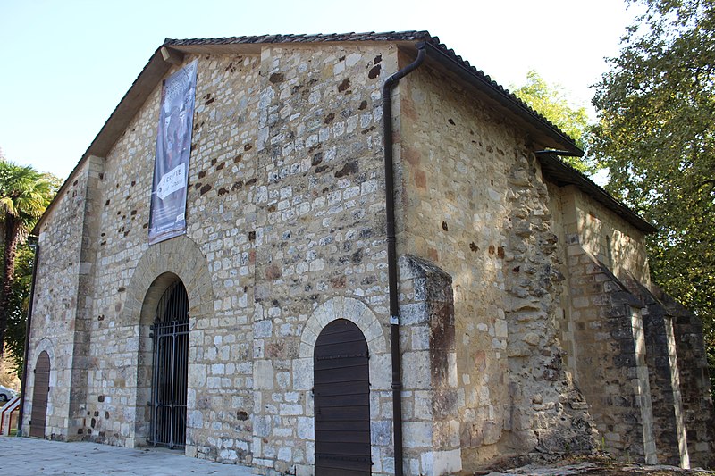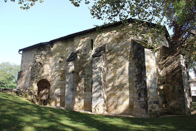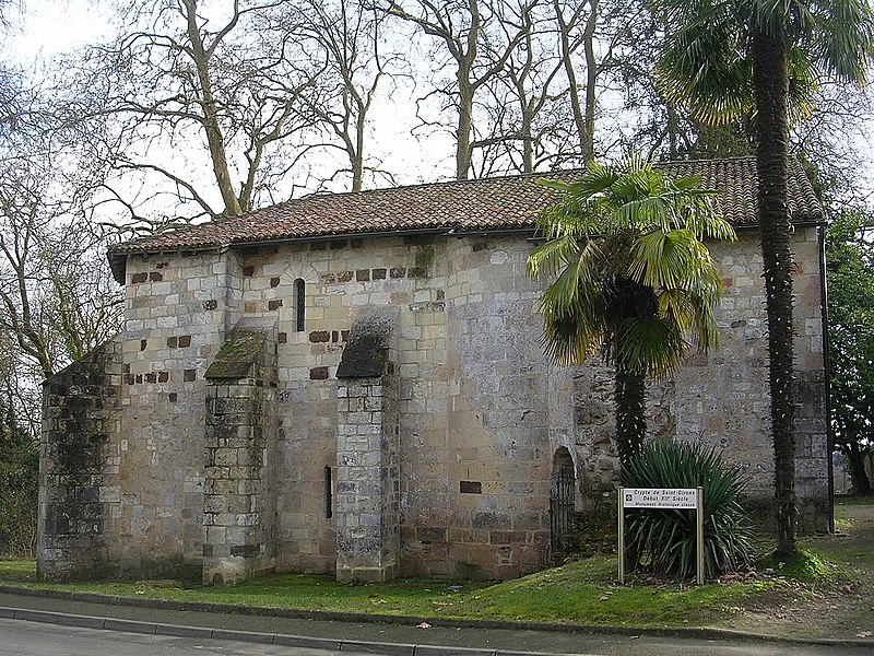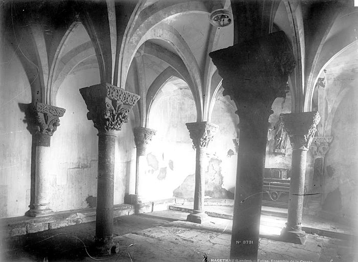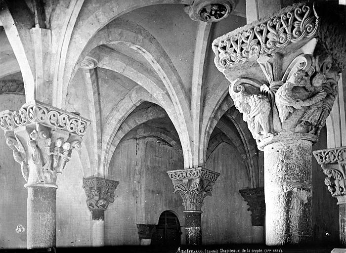 L'église Saint-Girons d'Hagetmau, dont la crypte est le dernier vestige, remonte pour son implantation religieuse aux traditions attribuant une fondation à Charlemagne, tandis que les premières mentions d'une abbaye bénédictine dedicated à saint Girons apparaissent à la fin du XIe siècle. L'église conventuelle, alors sans doute édifiée au tout début du XIIe siècle selon J. Cabanot, comprenait à l'origine une nef unique prolongée par un transept saillant et, à l'est, deux absidioles séparées de l'abside centrale précédée d'une travée droite de chœur élevée au‑dessus d'une crypte semi‑souterraine. Au cours de la période gothique, probablement au XIVe siècle, un collatéral fut ajouté au nord, le portail occidental et le clocher refaits, et l'abside romane remplacée par un chevet à cinq pans renforcé par de puissants contreforts; la crypte reçut alors des croisées d'ogives. Sécularisée en 1330 par l'abbé Guillaume Loup, l'abbaye connut de graves destructions lors des guerres, notamment le pillage et l'incendie de 1569 par les capitaines huguenots Sénégas et de Salles; les reliques furent profanées et dispersées et l'établissement périclita jusqu'à sa suppression à la Révolution. Après des réparations partielles et la construction, au XVIIe siècle, d'un escalier monumental desservant le sanctuaire surélevé, l'édifice déclina encore et fut progressivement abandonné; la crypte fut inscrite dès 1840 puis classée en 1862, tandis que le reste de l'église fut démoli entre la fin du XIXe siècle et août 1904. Entre 1905 et 1908, l'architecte Henri Léon Rapine restaura les parties subsistantes : un mur occidental ferma l'ancienne travée droite du chœur transformée en vestibule, les voûtes de la crypte furent restituées et une salle aménagée au‑dessus d'elle à l'emplacement du chœur. La crypte, joyau de l'art roman daté du début du XIIe siècle et mesurant environ 12 mètres sur 7,6 mètres, abritait le sarcophage renfermant les reliques de saint Girons et constitue aujourd'hui le seul élément conservé de l'abbaye. Sa voûte est portée par quatre colonnes centrales en marbre rouge et noir réemployées d'un édifice gallo‑romain; ces supports portent quatorze chapiteaux historiés sculptés, dont l'un illustre la parabole de Lazare et du mauvais riche. Les sculptures, mêlant scènes bibliques, végétaux stylisés et animaux fantastiques — lions, oiseaux affrontés et dragons — s'adressaient aux fidèles et aux pèlerins de Saint‑Jacques, la paroisse servant d'étape sur la voie limousine. L'ensemble préservé témoigne de l'importance religieuse et artistique de Saint‑Girons au Moyen Âge et de l'histoire tourmentée de son abbaye, marquée par les destructions, les pillages et les tentatives de restauration successives.