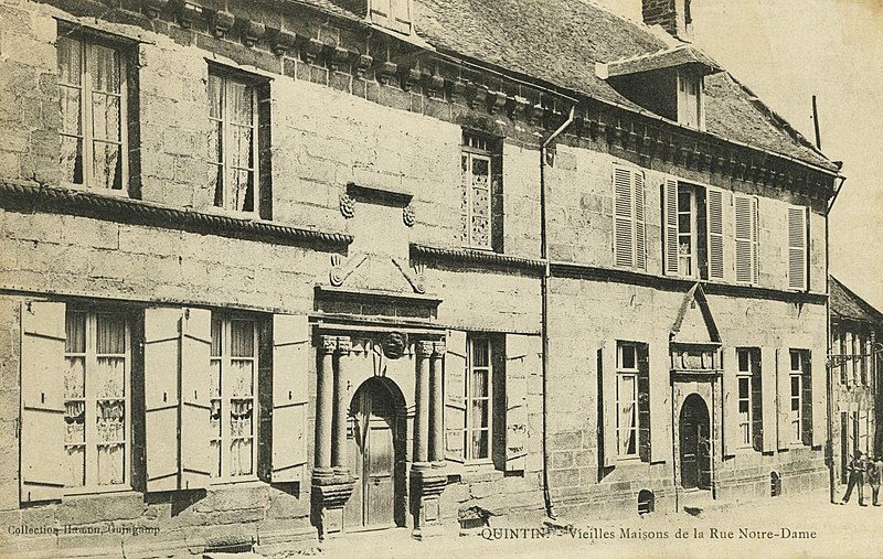 Situées au 5-7 rue Notre-Dame à Quintin (Côtes-d'Armor, Bretagne), ces deux maisons forment un ensemble remarquable de façades Renaissance. Elles illustrent l'architecture domestique des XVIe et XVIIe siècles avec des portes en arc plein cintre encadrées de colonnes ou de pilastres et de lourdes corniches typiquement bretonnes. La première maison présente un arc dont la clé est moulurée entre deux formes de banderoles ; ses chapiteaux reprennent des motifs végétaux et le sommet des allèges est souligné par une moulure ornée d'oves. Sa corniche se compose d'une succession de corbeaux ou de mutules, traités comme des mâchicoulis. La maison voisine conserve également une bande au sommet des allèges, mais sans sculpture ; sa porte en plein cintre s'ouvre entre des piedroits décorés de pilastres aux motifs géométriques et une corniche y soutient un haut fronton triangulaire. Quintin, érigée en duché en 1691, a conservé plusieurs édifices de cette période. Les façades et les toitures de ces deux maisons sont partiellement inscrites au titre des monuments historiques par arrêté du 28 mai 1951.