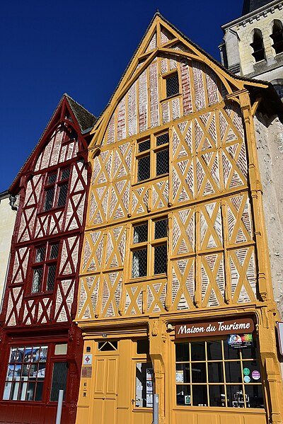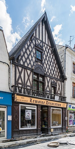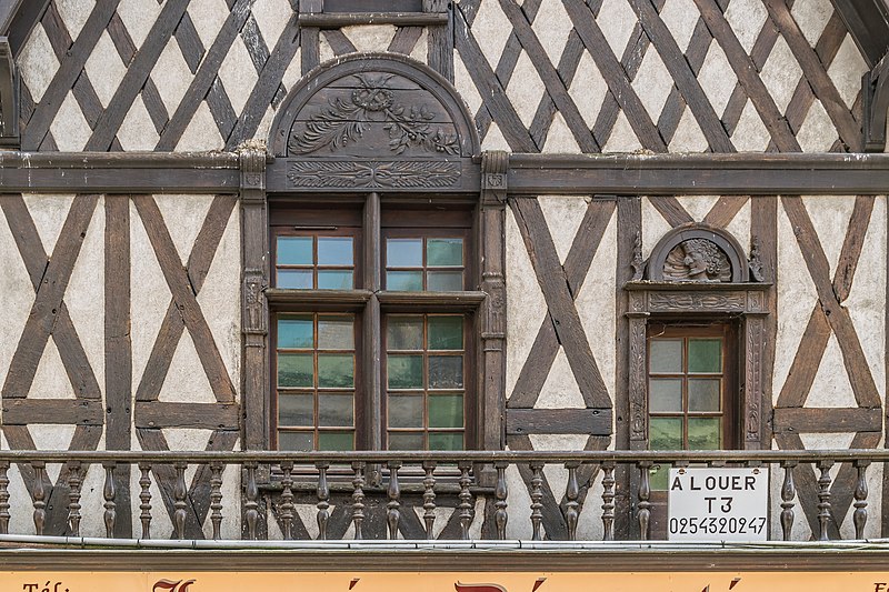 À partir du premier étage, la façade présente un colombage à croix de Saint-André et croisillons, avec un remplissage enduit. Elle est percée de deux fenêtres à meneaux en bois ; la principale est encadrée de pilastres à chapiteaux et surmontée d’un fronton demi‑circulaire en bois sculpté. La fenêtre située à sa droite adopte la même disposition, mais son encadrement est entièrement sculpté et le fronton porte un médaillon figurant une tête d’homme. La fenêtre du pignon reproduit cette même composition. Un balcon à balustres en bois orne la façade ; sa partie centrale est décorée d’une couronne en bois sculpté encadrant une glace. Une frise en bois découpé, d’époque moderne, longe le pignon. L’intérieur conserve un escalier à vis en bois à rampe moulurée, dont l’accès se fait par une ouverture ornée de deux colonnes en pierre, qui devait autrefois desservir l’entrée de la façade postérieure.