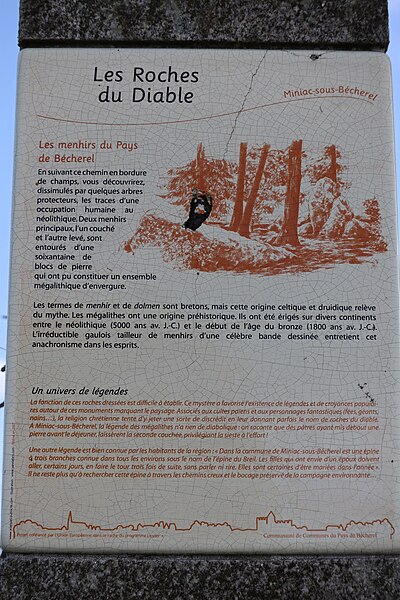 Les Roches du Diable sont un ensemble mégalithique situé à Miniac-sous-Bécherel (Ille-et-Vilaine). L'ensemble a été classé monument historique en 1960. Il se compose de deux blocs en dolérite d'origine locale, dont l'un est dressé et l'autre renversé, la nature de la roche leur donnant une silhouette basse et arrondie. Ces deux pierres sont entourées d'une soixantaine de blocs plus petits, vestiges probables d'un ensemble d'assez grande envergure, et bordées d'un bosquet d'arbres. Selon la tradition, des bergers auraient tenté de dresser les deux pierres en une journée : l'une fut levée avant le repas de midi, mais la sieste aurait interrompu le travail et la seconde resta couchée. Comme source documentaire figure notamment l'ouvrage de Jacques Briard, Loïc Langouët et Yvan Onnée, Les mégalithes du département d'Ille-et-Vilaine (2004, p. 63).