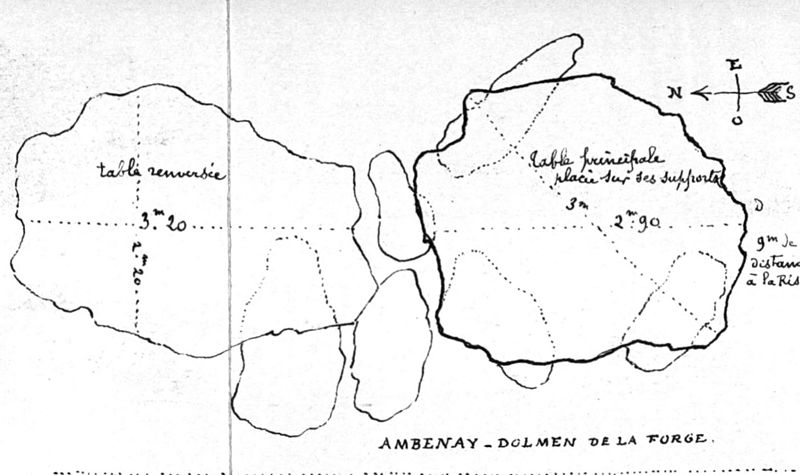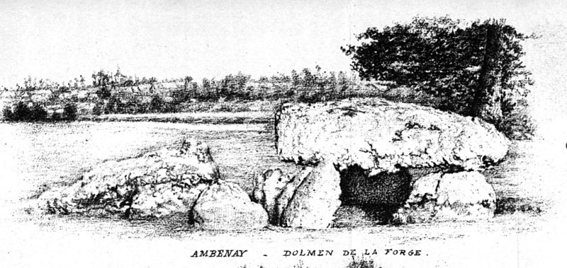 Le dolmen dit de Rugles, aussi appelé dolmen de la Forge, se trouve sur la commune d'Ambenay, en bordure de la Risle, à la limite de Rugles. Il s'apparente plutôt aux allées couvertes : il comprend une chambre et un vestibule orientés au sud-est. La chambre repose sur trois supports hauts d'environ 1 m, qui soutiennent une table presque carrée de 3,9 m de côté ; un quatrième support, du côté de la rivière, a disparu. En extérieur, la hauteur visible des supports n'atteint que 0,5 m. L'espace intérieur mesure 2,8 m de long sur 2,5 m de large et son sol est pavé de gros silex. Le vestibule fait 3 m de longueur pour 2,2 m de largeur, mais il se rétrécit à 1,5 m près de la chambre. La dalle qui couvrait le couloir a été déplacée ; ses dimensions sont 3 m de long avec une largeur variant de 1,5 à 2,2 m ; elle recouvre toujours six supports, dont un est à plat, et les deux supports les plus proches de la chambre apparaissent désormais à nu. Le monument est attribué au Néolithique, et la région a livré de nombreux instruments de cette période, tels que socs de charrue, houes et haches en pierre polie. Frédéric Galeron mentionne le dolmen en 1829 ; Auguste Le Prévost le reprend en 1832 en le qualifiant de renversé et brisé, et le vicomte de Pulligny le décrit en 1879 comme « composé de trois blocs supportant une vaste et unique table ». Léon Coutil donne une description détaillée dans son Inventaire de 1896, accompagné de relevés et de dessins probablement liés aux travaux d'Armand (Amand) Desloges. Desloges a déblayé le monument en 1893, notant qu'il était alors masqué par une épaisse végétation et recouvert d'une couche de tourbes et de débris ; il signale également 0,3 m d'alluvions apportées après la diversion de la rivière pour la création d'un moulin. Ses fouilles, qui semblaient viser surtout le dégagement du site, n'ont livré aucun objet signalé, et il déplore l'activité des chasseurs de trésors. Le dolmen a été reconnu pour son intérêt archéologique et classé au titre des monuments historiques dès 1900.