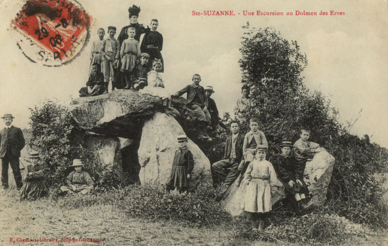 Le dolmen dit des Erves est situé à Sainte-Suzanne, dans la commune nouvelle de Sainte-Suzanne-et-Chammes, dans le département de la Mayenne. Il a fait l’objet d’une première fouille en 1868 menée par E. Perrot et a été classé au titre des monuments historiques en 1889. Une seconde fouille approfondie, réalisée en 1983 par Frédérik Letterlé de la DRAC des Pays de la Loire, a précédé sa restauration. L’édifice a été construit avec des dalles de grès dites de Sainte-Suzanne alors que le substrat local est calcaire. Il s’apparente aux dolmens angevins par sa chambre quadrangulaire, longue de 4,540 m et large de 2,80 m, précédée d’un portique. Il s’en distingue toutefois par la présence de deux tables de couverture et par un fort espacement entre les orthostates, espaces originellement comblés par des murets en pierres sèches. Le sol de la chambre était recouvert d’une couche de pierrailles d’une épaisseur de 0,15 à 0,20 m. Ce type d’architecture le rapproche des chambres à couloir à chambre rectangulaire et pourrait correspondre à une transition entre les dolmens angevins et les dolmens armoricains. Le cairn, composé de trois étages, mesurait environ 10 m de long sur 6 m de large et présentait une élévation minimale de 6,50 m. Les fouilles ont livré des ossements humains fragmentés correspondant à une quatorzaine d’individus (neuf adultes et cinq enfants), dont un cas de crémation. Le mobilier funéraire, peu abondant, comprenait notamment une coupe à socle à décor incisé, une dent d’équidé percée et un coquillage marin identifié comme Purpura lapillus. Un pic en bois de cerf a été découvert dans le fond d’une fosse d’implantation d’un pilier. Une datation par radiocarbone du pic et des ossements a fourni un intervalle de 4 650 à 5 580 BP (+/- 130), attribué au Néolithique moyen, et la décoration de la coupe la rattache au Chasséen.