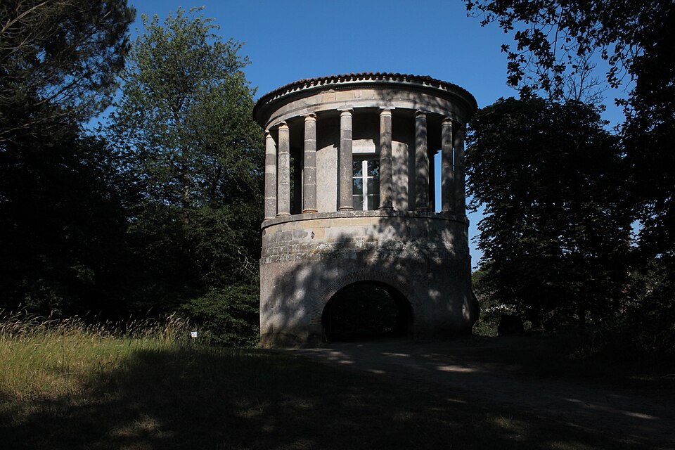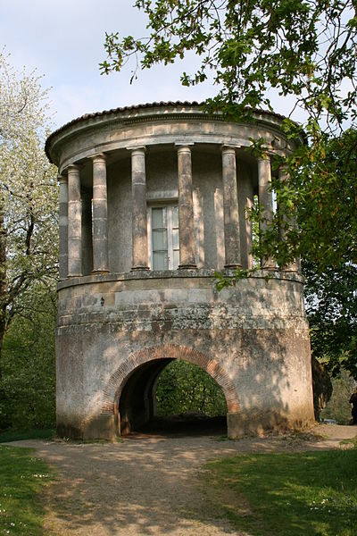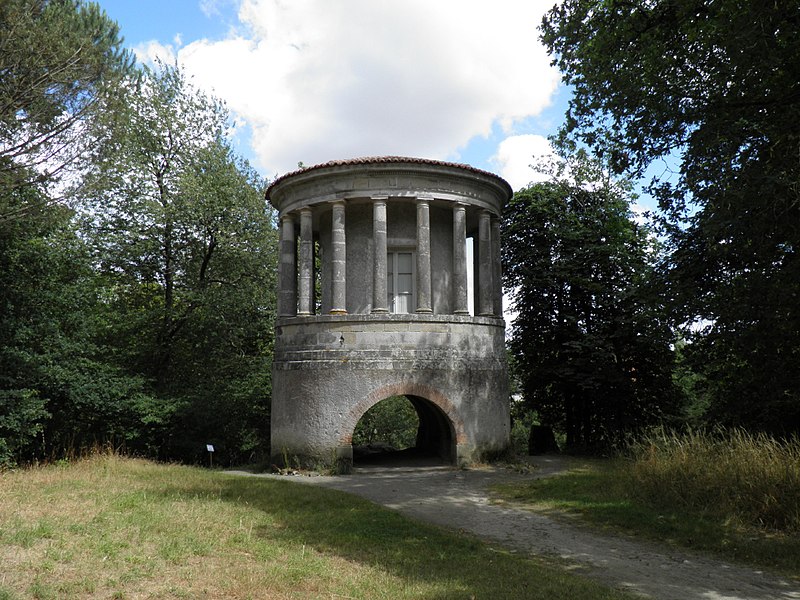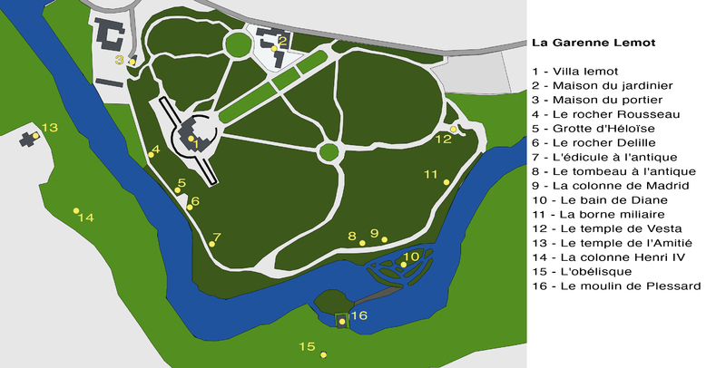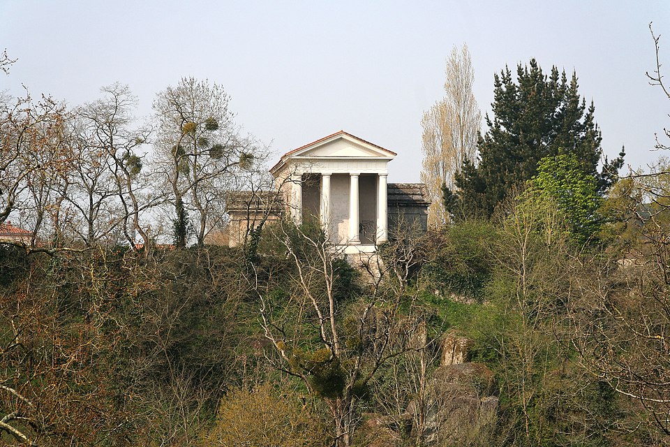 Les fabriques du parc, pensées comme des citations littéraires, antiques ou locales, sont autant d'éléments scénographiques répondant aux perspectives de la villa. Le temple de Vesta, tholos de plan circulaire élevé de 1819 à 1822, se compose de dix‑huit colonnes aux fûts en granit local et devait abriter une statue centrale qui n'a jamais été réalisée. La grotte d'Héloïse, le rocher Rousseau, le rocher Delille, l'édicule et le tombeau à l'antique figurent parmi les autres fabriques, tout comme la colonne dite de Madrid, une borne milliaire et les bains de Diane aménagés dans le lit de la rivière. Le moulin de Plessard, acquis en 1823, demeure à cheval sur la Sèvre et sera reconstruit ultérieurement dans un style italien par la famille Lemot.