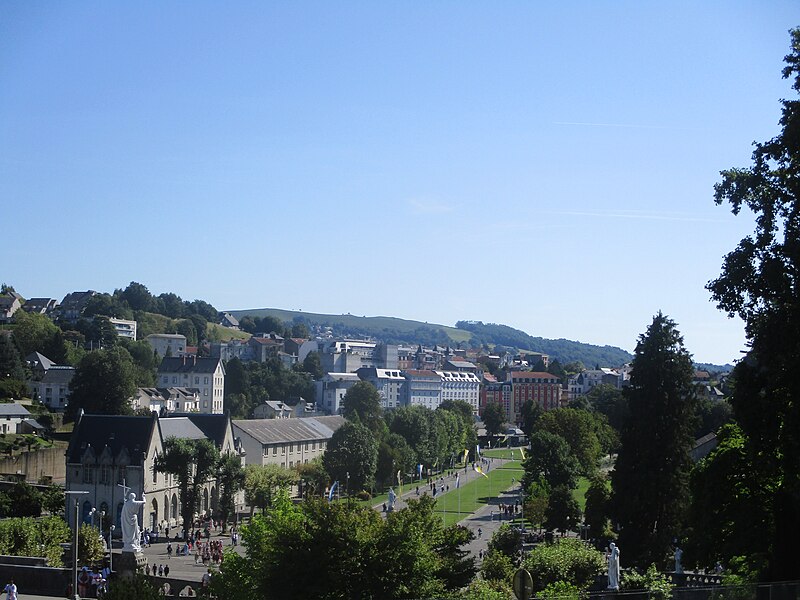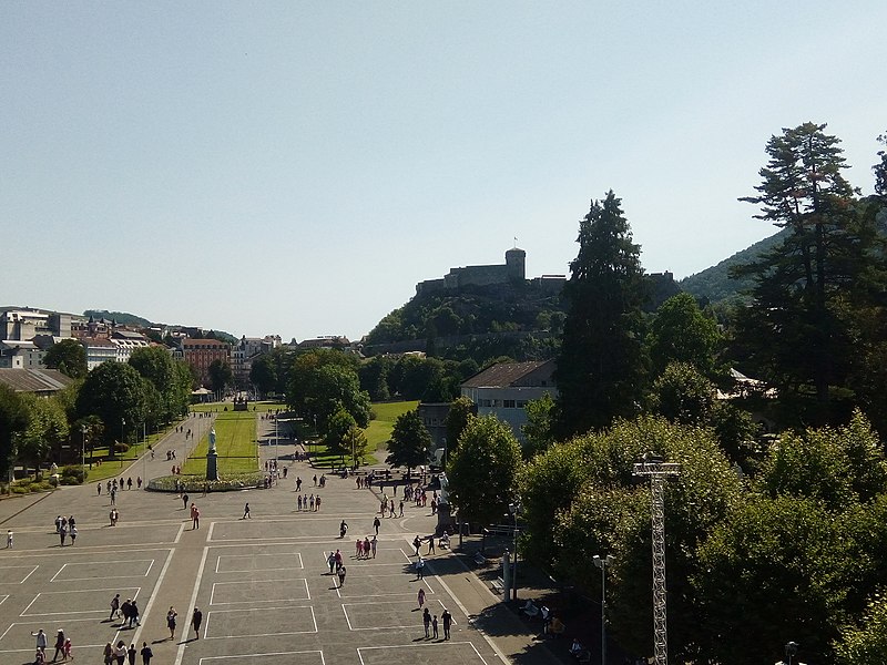 Le domaine, principalement situé sur la rive gauche du Gave, s'organise autour d'une double allée qui relie la porte Saint‑Michel à l'esplanade du Rosaire et sur laquelle cheminent les processions, notamment la procession aux flambeaux nocturne. Sept portes d'accès ouvrent le sanctuaire vers tous les points cardinaux ; la porte Saint‑Michel et la porte Saint‑Joseph, qui donnent un accès direct depuis la ville, sont parmi les plus empruntées. L'esplanade du Rosaire, vaste parvis encadrant les rampes menant aux basiliques et dominant une statue de la Vierge, peut accueillir des rassemblements considérables. Sur la rive droite, accessibles par trois passerelles, se trouvent l'église Sainte‑Bernadette, l'accueil Notre‑Dame et une large prairie utilisée pour de grandes célébrations.