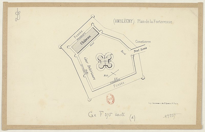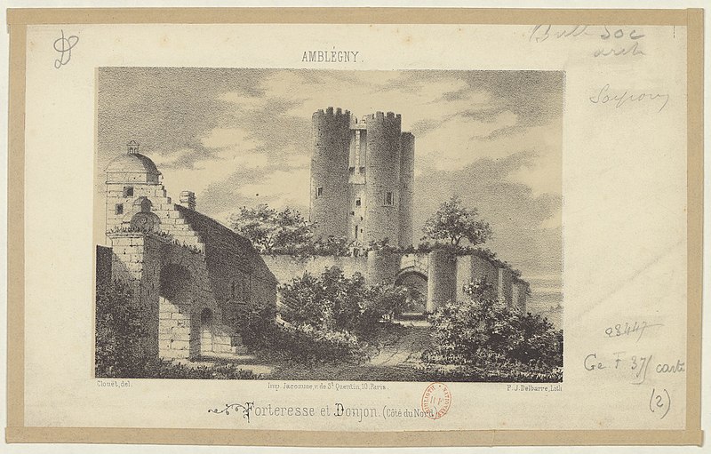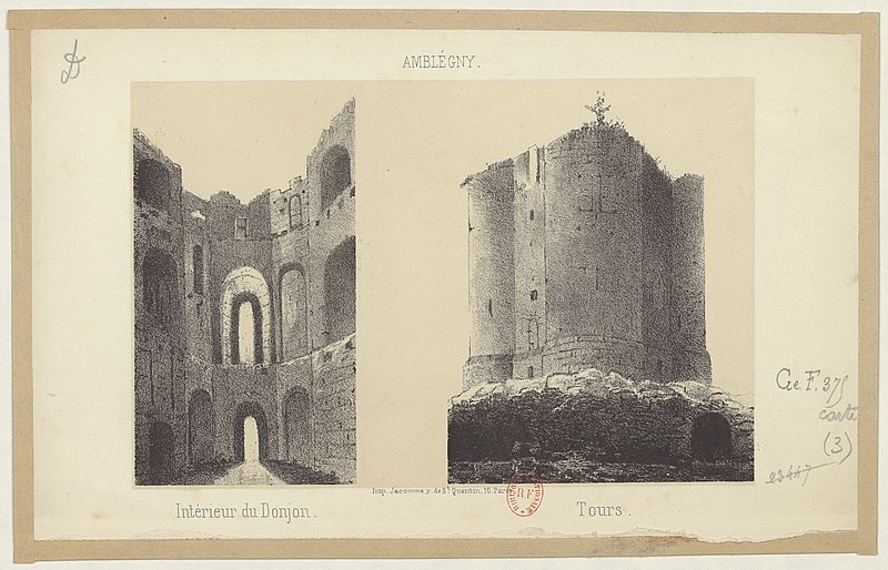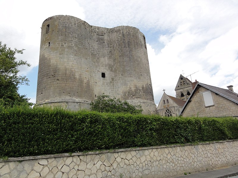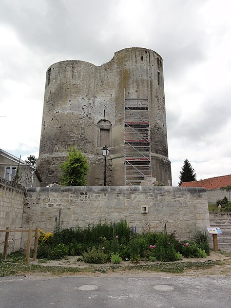 Le donjon d'Ambleny, dernier vestige d'une ancienne forteresse, se dresse au cœur du bourg d'Ambleny dans l'Aisne (Hauts-de-France). La forteresse est attribuée au milieu du XIIe siècle : certaines sources situent sa construction vers 1140, d'autres vers 1155. Au Moyen Âge, Ambleny appartenait au chapitre cathédral de Soissons ; Dreu, seigneur de Pierrefonds et avoué de l'abbaye, fit édifier une petite fortification dotée d'une tour maîtresse. En 1194 la seigneurie entra dans le domaine royal sous Philippe Auguste, puis fut revendue au chapitre en 1296. La forteresse fut détruite à la Révolution ; il n'en subsiste que le donjon, qui a encore subi d'importants dommages pendant la guerre de 1914-1918. D'importants travaux ont été entrepris en 1930 puis arrêtés en 1939 ; une nouvelle campagne, lancée en 1969, visait à consolider les ruines existantes. La tour maîtresse, décrite comme « octogonale », présente des angles coupés du carré munis de tourelles semi-circulaires ; elle est bâtie en bel appareil et s'élève à 28 mètres. Elle comprenait trois niveaux planchéiés et une plate-forme couronnée d'un parapet à mâchicoulis en arcs bandés entre les tourelles, avec un pilier médian sur chaque face. L'accès se faisait au second niveau par une porte protégée par un pont-levis donnant sur un couloir coudé qui mène à l'une des tourelles. Les datations de la tour varient : on l'assimile à la fin du XIIe siècle, André Châtelain la situe vers 1190 et Salch au début du XIIIe siècle. Selon Jean Mesqui, le donjon présente une certaine similitude avec celui de Mez-le-Maréchal à Dordives. Le donjon d'Ambleny est classé au titre des monuments historiques par décret du 24 février 1929.