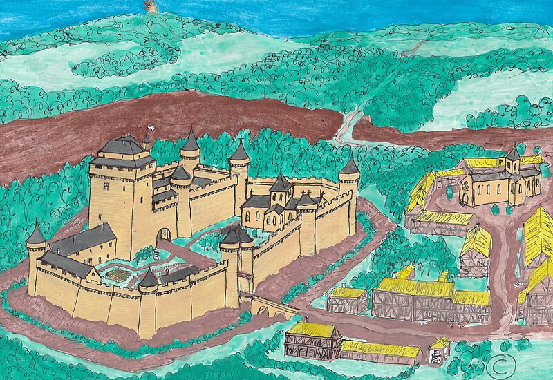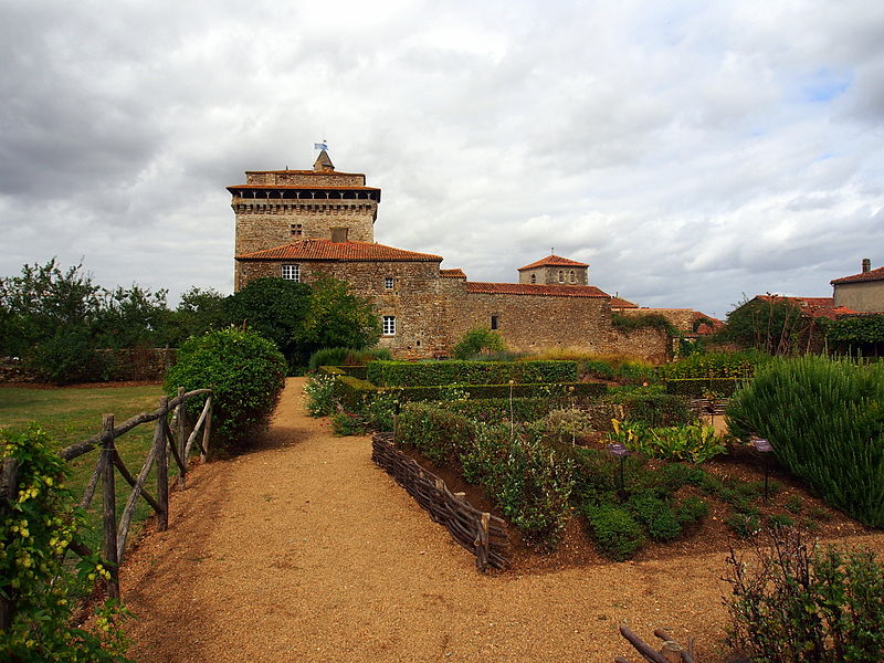 À la fin du Moyen Âge, la forteresse comportait probablement trois enceintes protégeant la basse-cour, l'église et la haute-cour; des fossés subsistent à l'ouest et au sud tandis que d'autres furent comblés au XIXe siècle. Un second rempart, encore en grande partie visible, séparait la basse-cour du parvis et conserve l'emplacement de la herse; la haute-cour, au nord du donjon, est entourée de son enceinte en cours de restauration. L'entrée originelle se trouvait à l'est; en 1525 on perça une seconde entrée à l'ouest, ornée d'un porche Renaissance à colonnes ioniques et précédée d'un pont dormant. Le colombier daté vers 1540, dont le linteau porte les armes de Jean III Girard et de Valentine Lorfeyvre, contient 1 980 boulins et constitue aujourd'hui l'élément central du jardin médiéval; par son état il est considéré comme l'un des plus remarquables d'Europe. L'enceinte castrale abritait l'église Notre-Dame de l'Assomption, dont la construction s'est étalée du XIe au XVIe siècle.