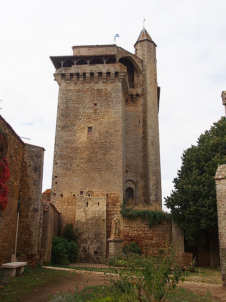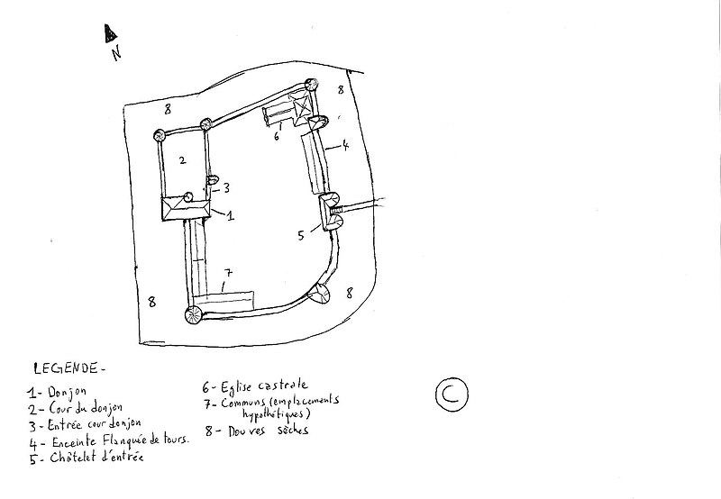 Le donjon : inscription par arrêté du 12 février 1927 - L'église en totalité ; le pigeonnier ; les vestiges de fortifications ; le portail Renaissance ; l'ensemble des terrains d'assiette à l'intérieur de l'enceinte (cad. AD 210, 211, 221 à 224, 228 à 232, 441) : inscription par arrêté du 20 octobre 2003
