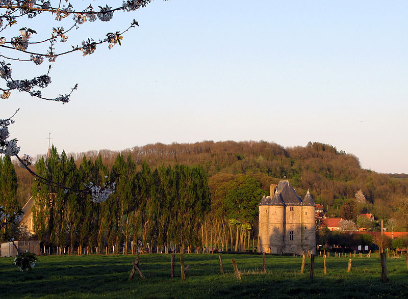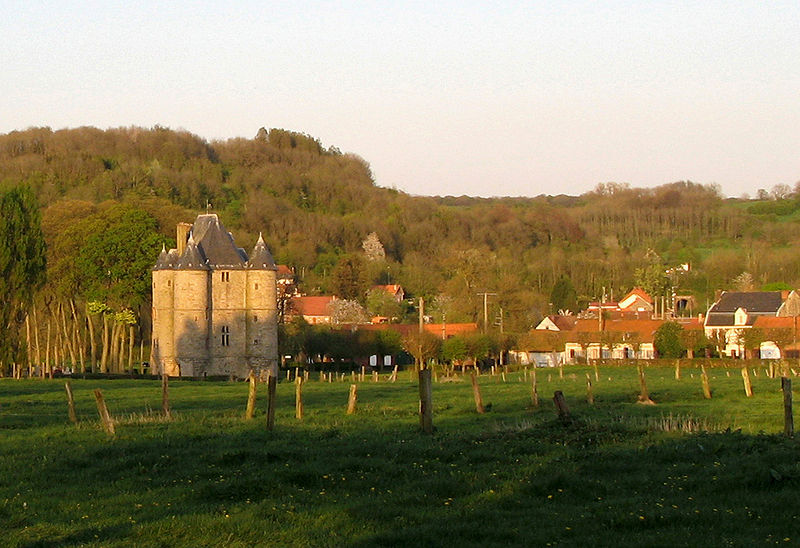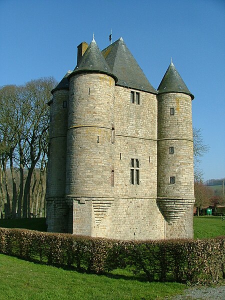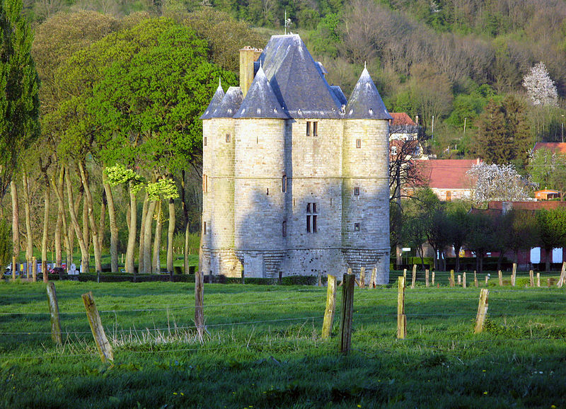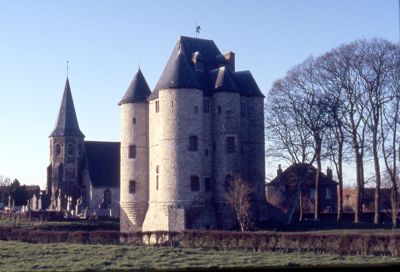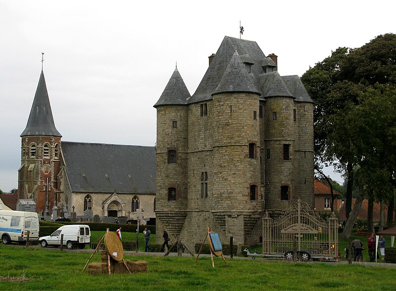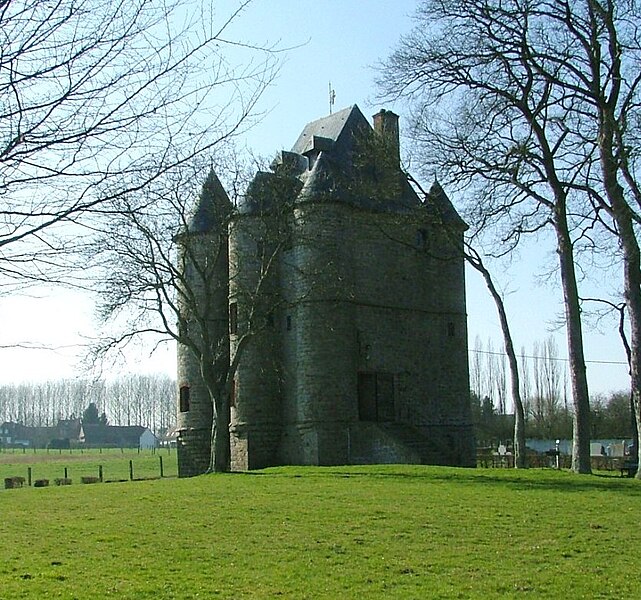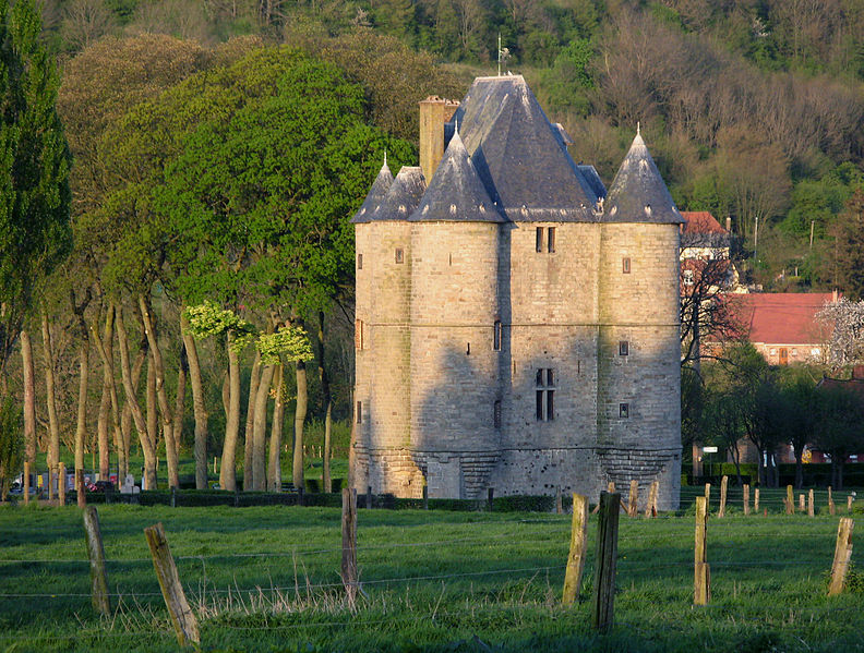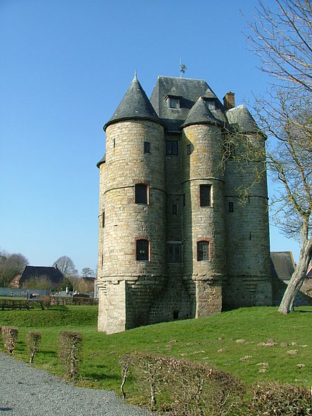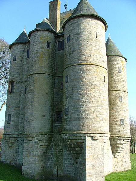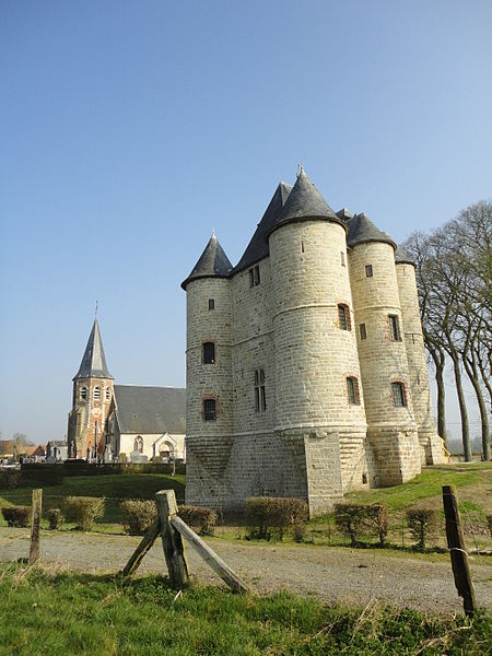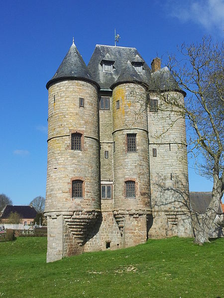 La tour, entièrement en grès d'Artois et adossée à l'ancienne motte féodale, présente une base carrée flanquée de six tourelles cylindriques en encorbellement — quatre aux angles et deux au milieu des faces nord et sud — toutes coiffées de toits en poivrière et de diamètre dégressif. Plus on s'éloigne de l'entrée, plus les tourelles ont un diamètre important, ce qui confère un aspect massif à cet édifice modeste. Malgré son allure robuste, il s'agit d'un logis d'apparat destiné principalement à l'habitation de la famille noble, comme l'atteste l'épaisseur relativement faible des murs des tourelles. Les éléments défensifs sont peu nombreux : traces d'anciennes douves en eau, archères dans la cave et présence d'un assommoir à l'entrée, l'accès se faisant autrefois par un pont dormant. Sobre et sans décor abondant, la maison-forte était à l'origine intégrée à un ensemble castral typique d'une seigneurie moyenne de l'Artois, composé d'une haute-cour avec jardin et d'une basse-cour agricole aujourd'hui détruite.