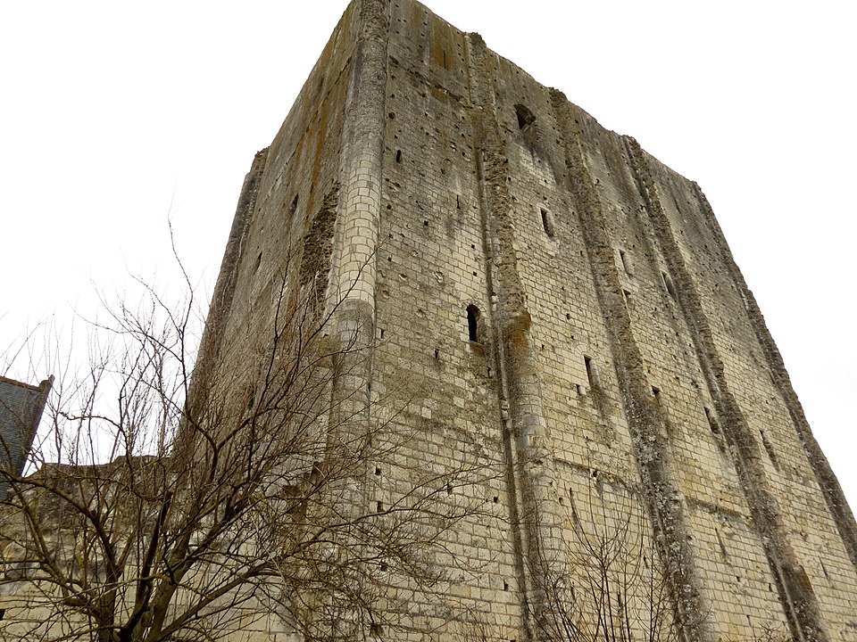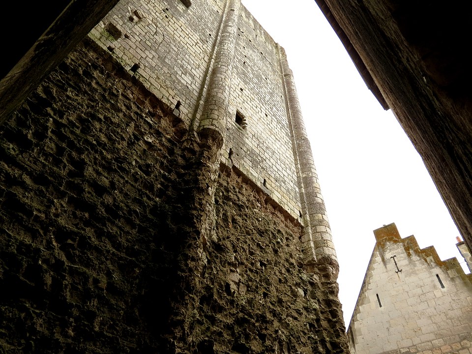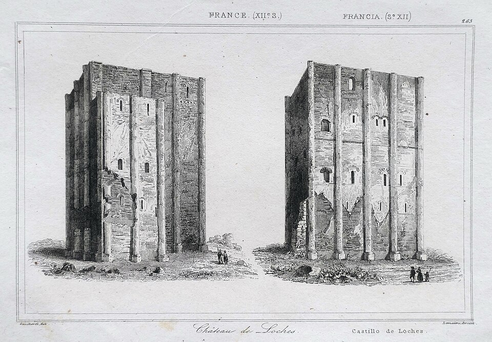 Perché sur un promontoire rocheux long d'environ 450 mètres dominant la vallée de l'Indre, le château de Loches forme, avec la collégiale et le logis royal, la cité fortifiée qui court du sud au nord sur le plateau. Grégoire de Tours signale déjà un castrum sur ce site à la fin du Ve siècle ; des sondages archéologiques ont mis au jour des traces d'occupation romaine, mais aucun bâtiment antérieur au haut Moyen Âge n'est conservé. La forteresse médiévale se compose principalement de la basse-cour qui abrite l'ancienne collégiale, du logis royal et du donjon qui constitue le noyau défensif. Le grand donjon rectangulaire et son avant-corps nord, dit petit-donjon, sont attribués à Foulques Nerra ; des analyses dendrochronologiques situent l'abattage des bois entre 1013 et 1035 et montrent que la majeure partie de l'ouvrage a été élevée de façon homogène sur une courte période, avec la mise en place des hourds dans la première moitié du XIe siècle. Le grand donjon, haut de 36 mètres, a une emprise au sol d'environ 25,2 × 13,7 mètres et ses murs, en moyen appareil de tuffeau, varient de 3,40 mètres d'épaisseur à la base à 2,60 mètres au sommet ; ils sont raidis par des contreforts semi‑cylindriques posés sur des dosserets. Au rez-de-chaussée se trouvaient des celliers et, sur quatre étages, des salles chauffées par des cheminées superposées à hotte conique et éclairées par des fenêtres cintrées aux larges ébrasements intérieurs. L'entrée du donjon, placée en hauteur et accessible depuis une petite tour contiguë, vise à en rendre l'accès difficile.