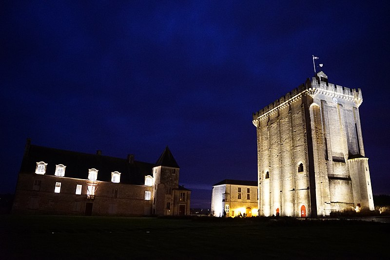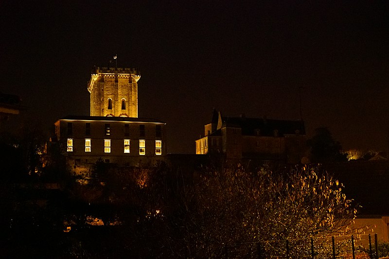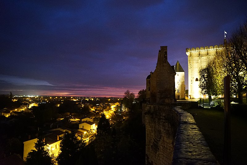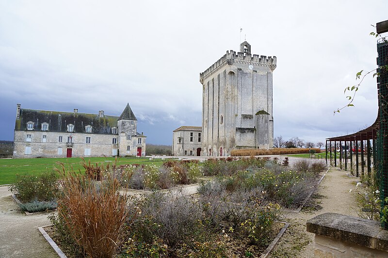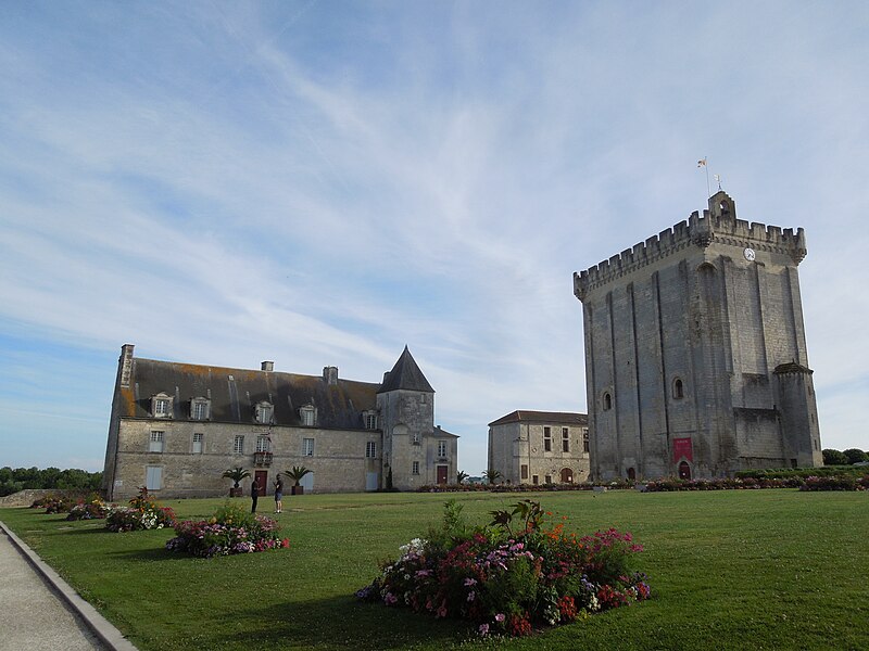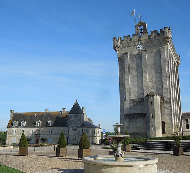 Le donjon, haut de 33 mètres, repose sur une base de 26,45 mètres sur 15,25 mètres ; ses murs en pierre de taille ont une épaisseur de 2,5 mètres sur trois côtés et de 4,40 mètres au nord. L'intérieur comportait trois niveaux et était à l'origine accessible par une entrée nord conduisant au premier étage par un escalier en bois amovible ; l'accès se fait aujourd'hui par un escalier à vis en pierre intégré dans l'épaisseur des murs. Le premier étage offre une vaste salle éclairée au sud par deux fenêtres géminées surmontées de deux baies en plein cintre ; d'autres ouvertures ont été percées ultérieurement selon les usages. Jusqu'en 1904 le sommet était couronné d'un entablement à créneaux ; cette année-là Émile Combes fit ajouter des mâchicoulis et des échauguettes d'angle inspirés d'une gravure, travaux financés par la vente d'une cheminée désormais au château d'Usson. Depuis la terrasse du donjon la vue porte sur toute la ville et la vallée de la Seugne.
