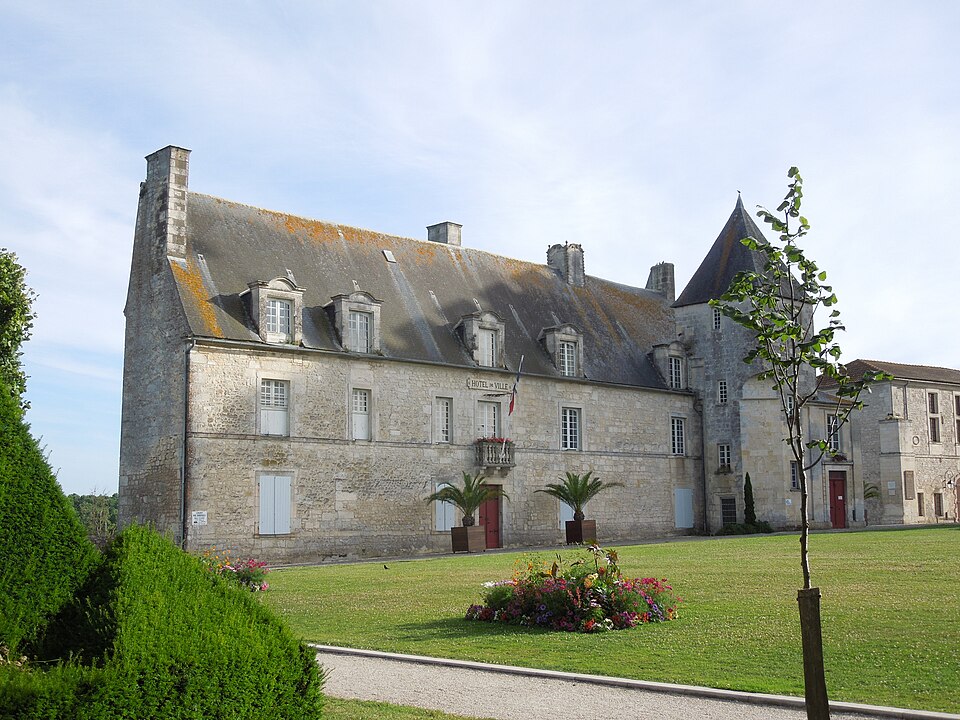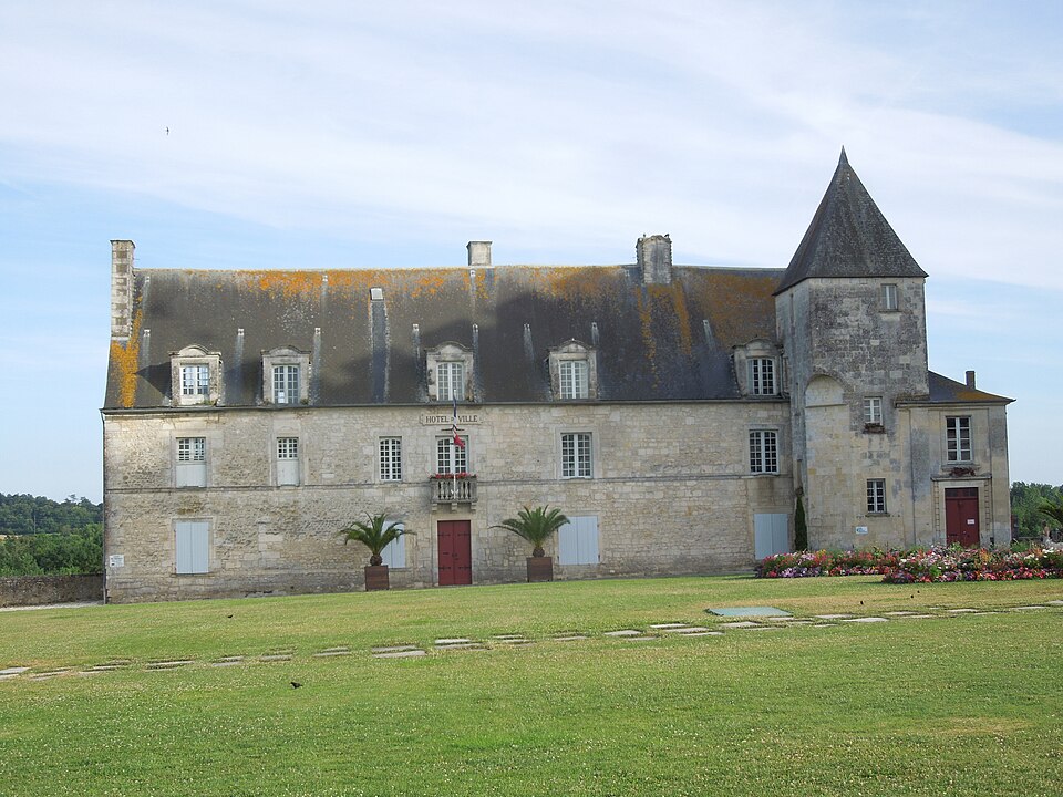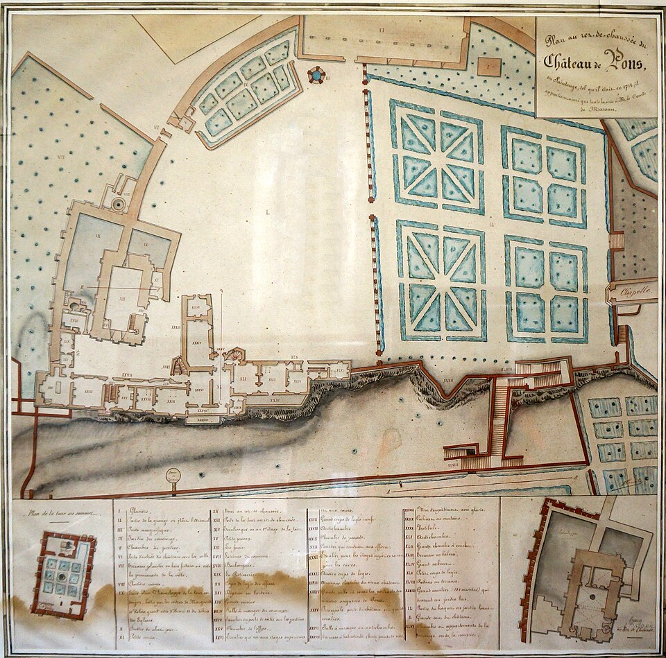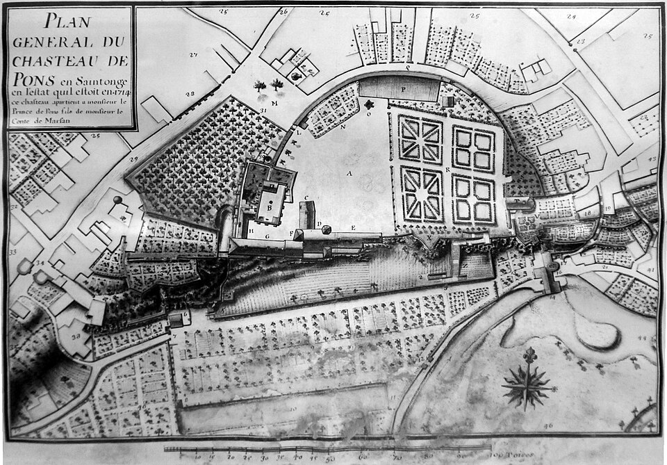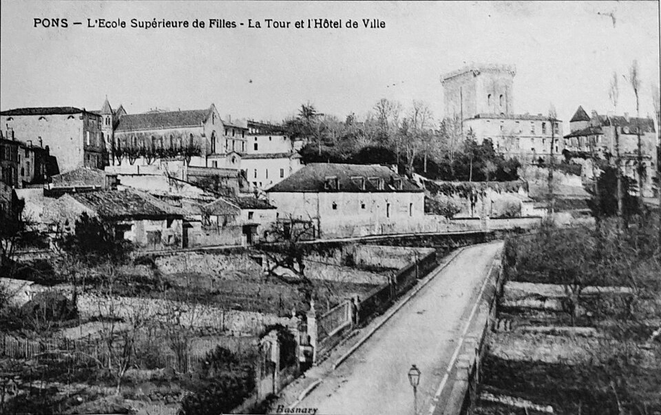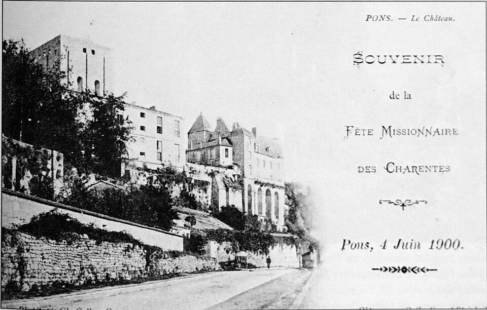 Le château de Pons, dont le donjon est le symbole visible de loin, se situe sur un promontoire au-dessus de la vallée de la Seugne, sur le tracé des voies de pèlerinage entre Saintes et Blaye. Le site, aménagé sur l'emplacement d'un oppidum, semble exister depuis le Xe siècle. Le donjon actuel, élevé au cours de la seconde moitié du XIIe siècle lors de la reconstruction menée par Geoffroy III de Pons après la destruction de 1179, constitue l'un des meilleurs exemples de donjon-palais roman de Saintonge. La ville se développa autour de l'édifice et fut entourée de remparts achevés vers 1230, ce qui fit du castrum une place forte convoitée appartenant successivement au sire d'Aulnay, aux ducs d'Aquitaine puis aux sires de Pons. Devenu fief huguenot, Pons subit des sièges et des attaques en 1570 et 1574 ; en 1598 la place, proclamée place de sûreté, reçut des renforts défensifs autour du donjon et des réparations des remparts. Après la reddition de 1621, le démantèlement des défenses fut ordonné et le château fut en partie rasé ; en 1622 les armées de Louis XIII détruisirent à nouveau l'ensemble, à l'exception du donjon et de quelques éléments défensifs. À partir de 1623 et jusqu'en 1670, des travaux relevèrent partiellement l'enceinte arasée : on remonta tourelles et courtines et l'on bâtit un édifice étroit à l'aplomb de la falaise sur les bases des remparts et des anciennes caves, adossé à de grandes arcatures. César Phébus d'Albret fit édifier le corps de logis et ordonna la construction d'un grand escalier monumental qui relie la ville-haute à la ville-basse ; la galerie d'arcades de la façade sud, avancée au‑dessus de la falaise, fut achevée après 1660. La municipalité acquit les bâtiments en 1806, aménagea l'esplanade en jardin public et installa l'hôtel de ville dans le corps de logis. Le donjon est classé au titre des monuments historiques depuis le 8 octobre 1879 ; les façades et toitures de l'hôtel de ville ainsi que les arcatures servant de soubassement ont été inscrites le 13 juin 1991 ; deux plafonds peints du XVIIe siècle ont été classés le 12 juin 1992, un arrêté du 29 mars 2023 a complété et abrogé les précédents arrêtés d'inscription, et en décembre 2024 l'ensemble de l'ancien château a fait l'objet d'un arrêté de classement.