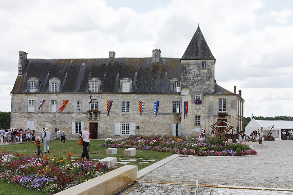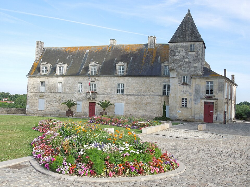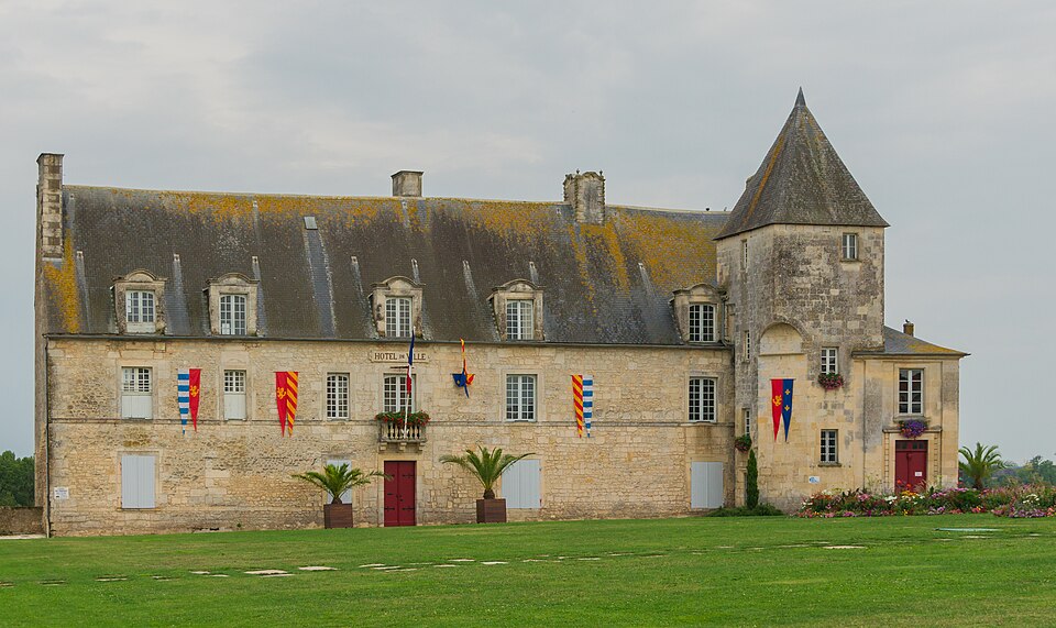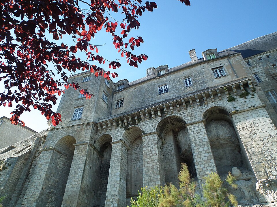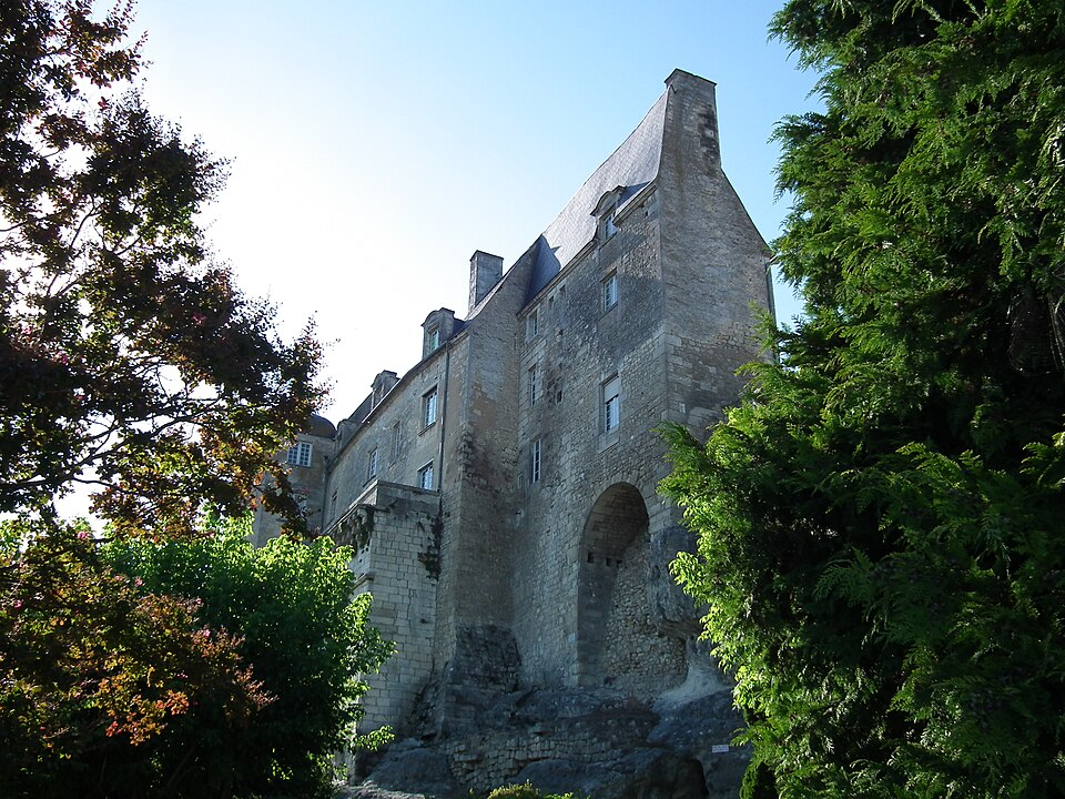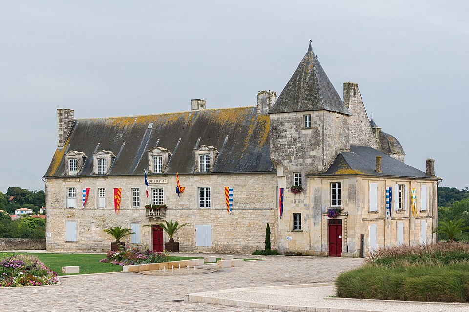 Le château de Pons, dont le donjon est le symbole visible de loin, se situe sur un promontoire au-dessus de la vallée de la Seugne, sur le tracé des voies de pèlerinage entre Saintes et Blaye. Le site, aménagé sur l'emplacement d'un oppidum, semble exister depuis le Xe siècle. Le donjon actuel, élevé au cours de la seconde moitié du XIIe siècle lors de la reconstruction menée par Geoffroy III de Pons après la destruction de 1179, constitue l'un des meilleurs exemples de donjon-palais roman de Saintonge. La ville se développa autour de l'édifice et fut entourée de remparts achevés vers 1230, ce qui fit du castrum une place forte convoitée appartenant successivement au sire d'Aulnay, aux ducs d'Aquitaine puis aux sires de Pons. Devenu fief huguenot, Pons subit des sièges et des attaques en 1570 et 1574 ; en 1598 la place, proclamée place de sûreté, reçut des renforts défensifs autour du donjon et des réparations des remparts. Après la reddition de 1621, le démantèlement des défenses fut ordonné et le château fut en partie rasé ; en 1622 les armées de Louis XIII détruisirent à nouveau l'ensemble, à l'exception du donjon et de quelques éléments défensifs. À partir de 1623 et jusqu'en 1670, des travaux relevèrent partiellement l'enceinte arasée : on remonta tourelles et courtines et l'on bâtit un édifice étroit à l'aplomb de la falaise sur les bases des remparts et des anciennes caves, adossé à de grandes arcatures. César Phébus d'Albret fit édifier le corps de logis et ordonna la construction d'un grand escalier monumental qui relie la ville-haute à la ville-basse ; la galerie d'arcades de la façade sud, avancée au‑dessus de la falaise, fut achevée après 1660. La municipalité acquit les bâtiments en 1806, aménagea l'esplanade en jardin public et installa l'hôtel de ville dans le corps de logis. Le donjon est classé au titre des monuments historiques depuis le 8 octobre 1879 ; les façades et toitures de l'hôtel de ville ainsi que les arcatures servant de soubassement ont été inscrites le 13 juin 1991 ; deux plafonds peints du XVIIe siècle ont été classés le 12 juin 1992, un arrêté du 29 mars 2023 a complété et abrogé les précédents arrêtés d'inscription, et en décembre 2024 l'ensemble de l'ancien château a fait l'objet d'un arrêté de classement.