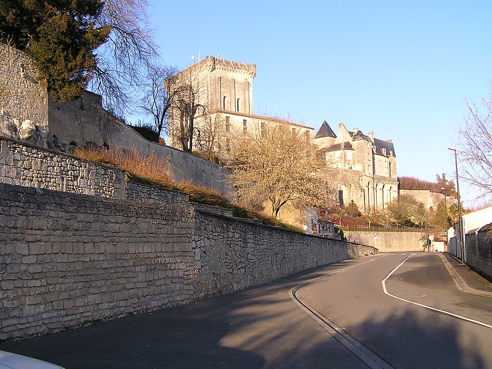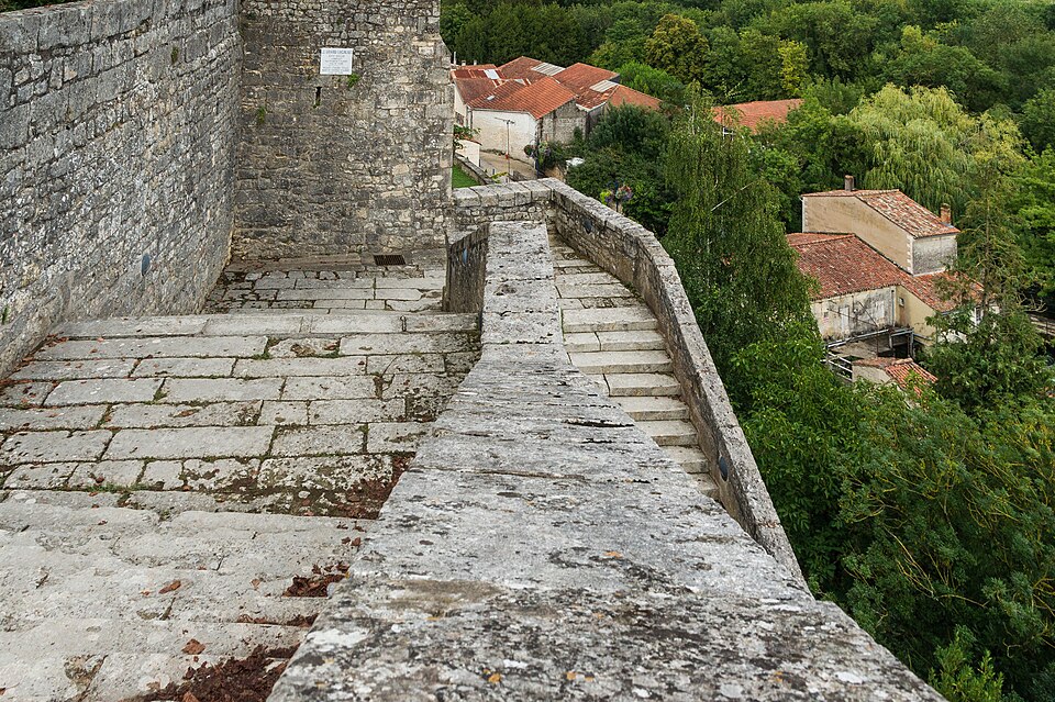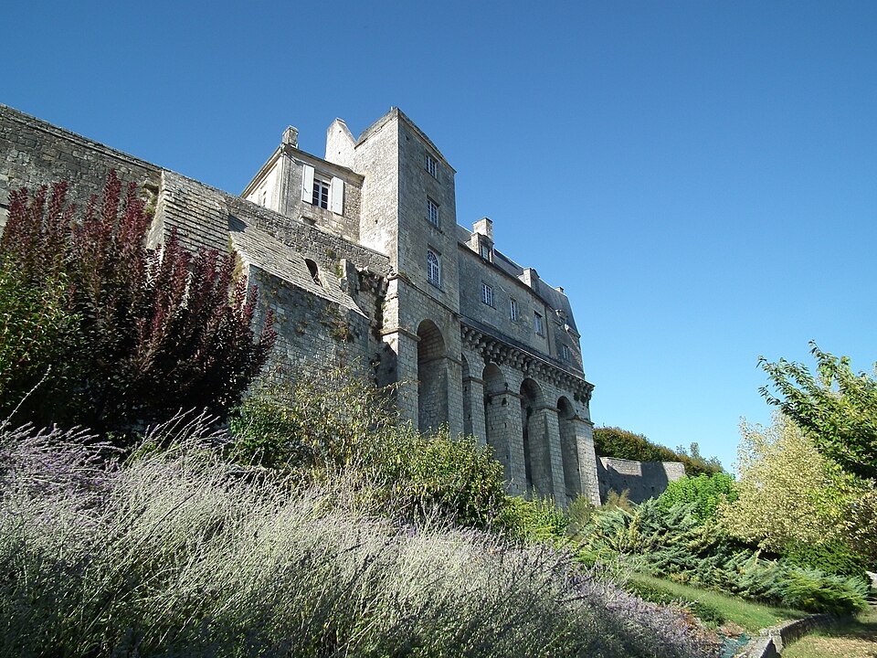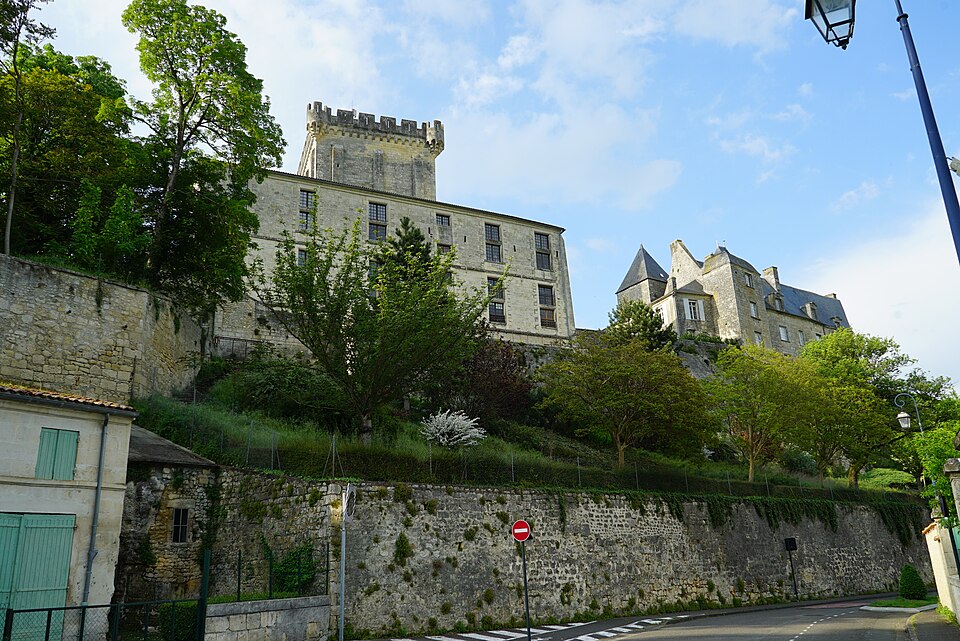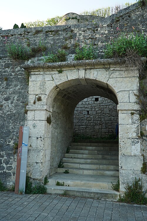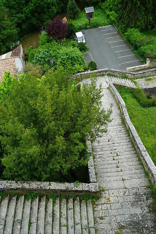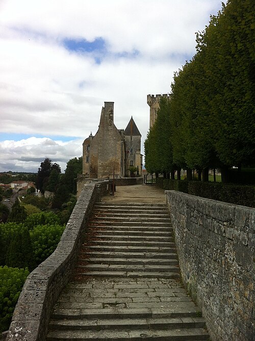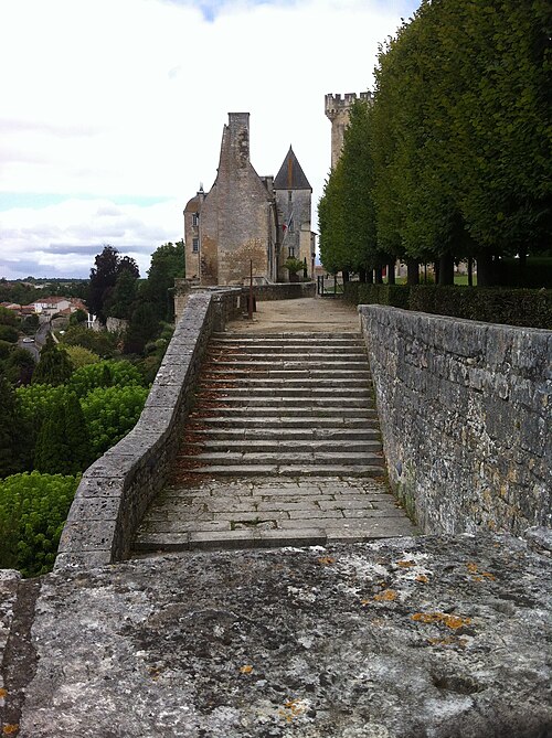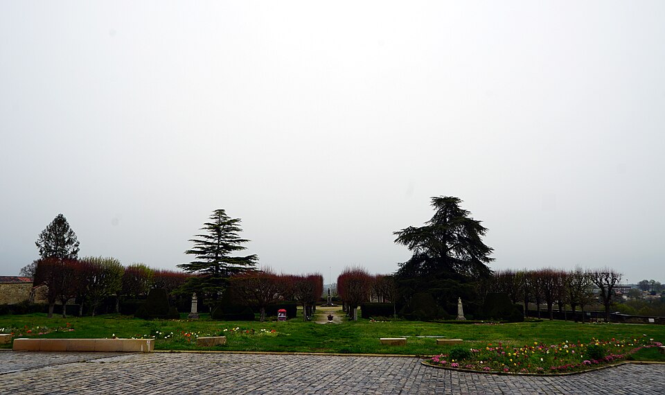 Le jardin public, installé en terrasses sur les anciens remparts, offre des vues plongeantes sur la vallée sinueuse de la Seugne et ses bras d'eau ; il a d'abord été transformé en 1665 en jardin à la française attesté par une aquarelle de 1714, puis réaménagé vers la fin du XIXe siècle et refait en 1885 avec l'ajout d'un grand bassin. Deux accès remarquables donnent sur les terrasses : l'escalier en vis d'une ancienne tourelle de défense, vestige du château détruit en 1622, et l'escalier César Phébus d'Albret, conçu en 1665 avec 124 marches réparties en cinq volées et six paliers, qui relie les jardins supérieurs au pied des remparts et à la Seugne ; il permet d'observer la muraille médiévale du XIIe siècle et la terrasse bâtie en 1630 reposant sur des arcades. À l'extrémité du jardin se trouvent la chapelle Saint-Gilles et la façade reconstruite d'une maison de style Renaissance ; sous la chapelle, la porte Saint-Gilles marquait l'entrée du château.