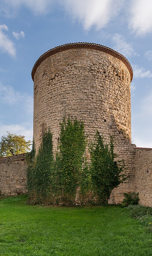 Édification de la tour cylindrique et des éléments de muraille de l'enceinte castrale.