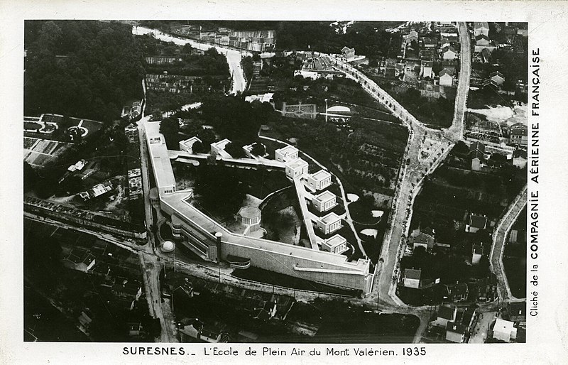 L'école de plein air de Suresnes est un établissement construit dans les années 1930 à l'initiative du maire Henri Sellier et réalisé par les architectes Eugène Beaudouin et Marcel Lods pour accueillir des enfants atteints de tuberculose ou fragiles sur le plan respiratoire. Installée sur le versant ensoleillé du Mont-Valérien, sur un terrain d'environ deux hectares issu de l'ancienne propriété des Landes, elle a été conçue pour préserver les arbres et favoriser un contact étroit avec la nature. Le parti architectural privilégiait l'ensoleillement et l'aération : structure métallique, murs de verre, terrasses et jardins permettant d'ouvrir largement les classes au soleil et, par temps doux, de faire cours en plein air. Le dispositif comprenait un bâtiment principal en arc de cercle relié à plusieurs pavillons d'enseignement, disposés dans le parc et reliés entre eux par des galeries ; ces pavillons, souvent largement vitrés, disposaient de terrasses servant de solarium et d'un chauffage par le sol. L'aménagement intérieur et le mobilier étaient adaptés aux besoins des enfants malades : rampes de circulation à la place d'escaliers, sièges-pupitres et lits en aluminium, sanitaires et bassins en plein air, dispositifs favorisant l'hygiène et le suivi médical avant et pendant la scolarité. Inaugurée en 1936 après une ouverture en 1935, l'école fonctionna jusqu'en 1996 et passa sous la tutelle de l'État en 1954 ; elle eut par la suite une vocation élargie, accueillant d'autres handicaps physiques. L'établissement fut salué par la presse et des architectes contemporains pour son caractère innovant en matière d'architecture sanitaire et pédagogique. Un grand globe terrestre, objet pédagogique remarquable, fut installé devant l'école ; comme l'ensemble du site, il a été classé monument historique en 2002 et a fait l'objet d'une restauration achevée en 2018 grâce à une souscription après l'accord de la DRAC. Le parc a été en partie réduit vers 1970 par la construction de locaux éducatifs supplémentaires, et les bâtiments, inscrits à l'Inventaire supplémentaire des monuments historiques depuis 1965, ont souffert de problèmes d'étanchéité et de dégradation signalés dès la fin des années 1970. Au début des années 2000, les estimations de remise en état faisaient apparaître un coût élevé, et la municipalité a engagé diverses démarches au cours des années suivantes pour la préservation du site, y compris un dossier transmis à la mission de préservation du patrimoine en 2017-2018. En 2021, l'Élysée annonça l'implantation d'un musée-mémorial du terrorisme sur le site et le transfert des occupants, avec la création de logements pour soignants ; ce projet fut finalement abandonné en septembre 2025 en raison du coût des travaux de restauration. De nombreuses archives et documents témoignant de l'activité et de l'architecture de l'école sont conservés, notamment un reportage photographique au musée national de l'Éducation et des fonds au musée d'histoire urbaine et sociale de Suresnes.