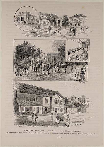 L'École nationale vétérinaire d'Alfort (EnvA) est un établissement public d'enseignement supérieur et de recherche placé sous la tutelle du ministère chargé de l'agriculture ; son site principal et historique se situe à Maisons-Alfort (Val-de-Marne). Fondée par Claude Bourgelat au printemps 1765, l'école s'installe sur le domaine du château d'Alfort en octobre 1766 après un premier séjour provisoire à Paris. L'aménagement initial du château pour les besoins de l'enseignement, dirigé par l'architecte Soufflot entre 1765 et 1766, comprenait logements, laboratoires, salles d'études, écuries et forges ; l'ancien château fut détruit en 1855. De la seconde moitié du XVIIIe siècle au XXe siècle, une succession d'architectes a conduit de nombreuses campagnes de construction et de restauration ; Robelin, Diet, Bobin et Émile Bois, entre autres, ont édifié pavillons, bâtiments d'enseignement, manège, salles d'anatomie et autres équipements. Plusieurs bâtiments du site datent du XIXe siècle, fruits de campagnes entreprises entre 1834 et 1887, et d'autres ont été construits au XXe siècle, comme la cité des élèves par Émile Bois en 1935. Installée sur son site d'origine depuis 1766, l'EnvA est la plus ancienne école vétérinaire encore en place sur son implantation initiale. Le campus, d'une superficie de douze hectares en cœur de ville, est desservi par la ligne 8 du métro à la station École vétérinaire de Maisons-Alfort. L'école accueille environ 800 étudiants, 80 enseignants-chercheurs, 30 chercheurs appartenant à des laboratoires associés et 260 personnels administratifs et techniques, et figure parmi les quatre grandes écoles formant les vétérinaires en France. L'EnvA est également présente en Normandie, à Goustranville, où se trouve le centre d'imagerie et de recherche sur les affections locomotrices équines (CIRALE). Le cursus a été rénové : depuis 2021 la formation dure six années, avec une première année commune aux écoles nationales vétérinaires et une soutenance de thèse d'exercice vétérinaire ouvrant au titre de docteur vétérinaire. La formation clinique s'appuie sur un centre hospitalier universitaire vétérinaire composé de quatre plateformes cliniques — animaux de compagnie, équidés, animaux de ferme et faune sauvage — qui prennent en charge des dizaines de milliers d'animaux chaque année et offrent des services spécialisés, des urgences 24h/24 ainsi que des dispositifs de simulation et de stages pratiques pour les étudiants. L'EnvA propose en outre une offre de formation continue variée, avec une soixantaine de programmes diplômants, certifiants et courts visant l'acquisition de compétences spécialisées. La recherche constitue une mission centrale, organisée autour de deux pôles principaux : maladies animales, zoonoses et risques infectieux ; et physiopathologie et thérapie du muscle, de l'appareil locomoteur et de la reproduction. Les unités de recherche travaillent en partenariat avec l'Anses, l'Inrae, l'Inserm, le CNRS et d'autres instituts dans le cadre d'une approche « One World One Health » liant santé animale, santé humaine et environnement. Le pôle équin normand et le CIRALE forment une référence pour l'étude des troubles locomoteurs équins, alliant imagerie de haut niveau, clinique et recherche. Le patrimoine scientifique et culturel de l'école est particulièrement riche : bibliothèque de 170 000 volumes, musée Fragonard, jardin botanique et collections d'anatomie et d'écorchés, conservés et valorisés par des programmes de numérisation et des partenariats documentaires. Le Musée Fragonard, ouvert au public, présente des écorchés, des squelettes et des moulages anatomiques, tandis que le jardin botanique, créé en 1766, conserve une collection remarquable de plantes médicinales, mellifères et toxiques. À partir des années 1990, l'état du patrimoine immobilier a posé des défis financiers et techniques, entraînant des opérations de réhabilitation, la construction d'une nouvelle cité universitaire et la rénovation de plusieurs équipements. Un grand projet de rénovation du campus mené au début du XXIe siècle a permis la construction de bâtiments neufs et la rénovation d'infrastructures, la livraison du siège de l'Anses sur le campus et la mise en service du bâtiment Camille Guérin, actions qui ont favorisé la réévaluation et l'accréditation européenne de l'école. L'EnvA met à disposition des chercheurs et du public des collections numérisées, des périodiques historiques et des thèses en ligne grâce à des conventions avec des institutions nationales. Le domaine a abrité et formé de grands noms de la médecine et de la recherche vétérinaire, dont Honoré Fragonard, Henri Bouley, Camille Guérin et Gaston Ramon, dont les travaux ont marqué l'histoire vétérinaire. Le site reste ouvert au public et propose des visites guidées du musée et du jardin ainsi que des actions de valorisation du patrimoine scientifique et pédagogique.