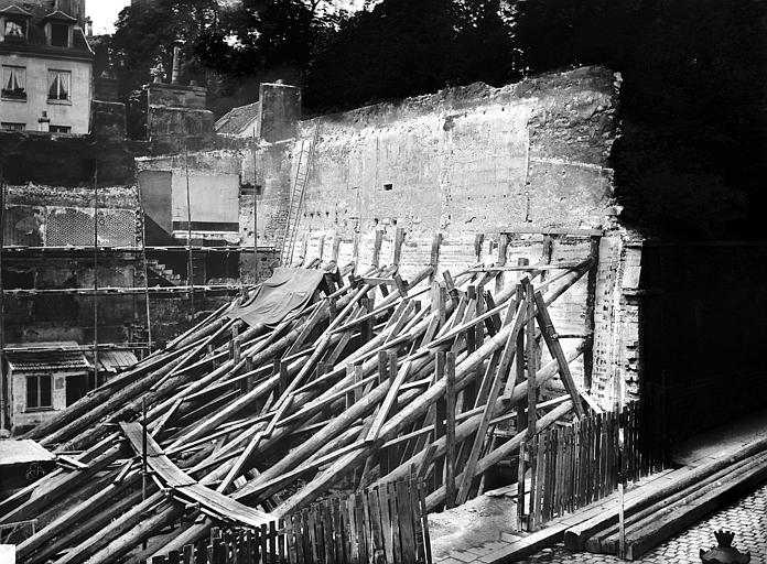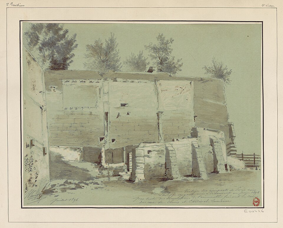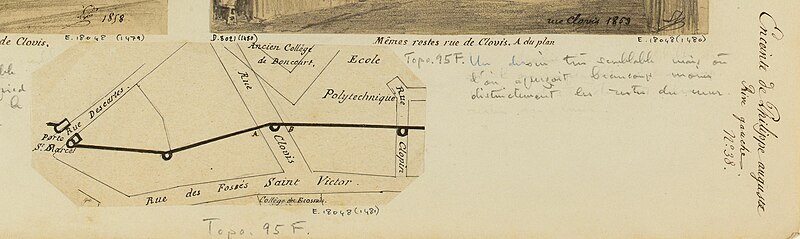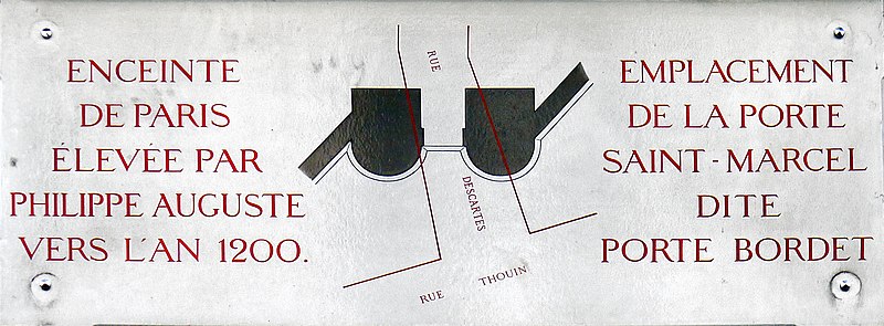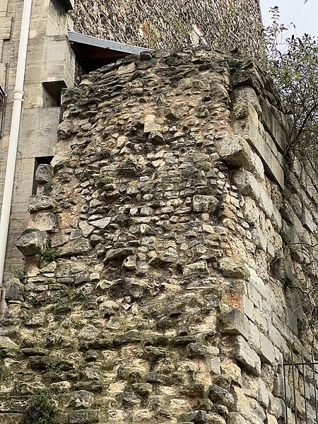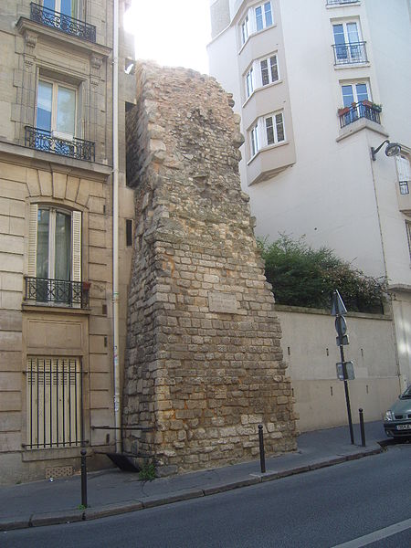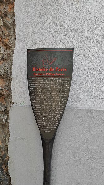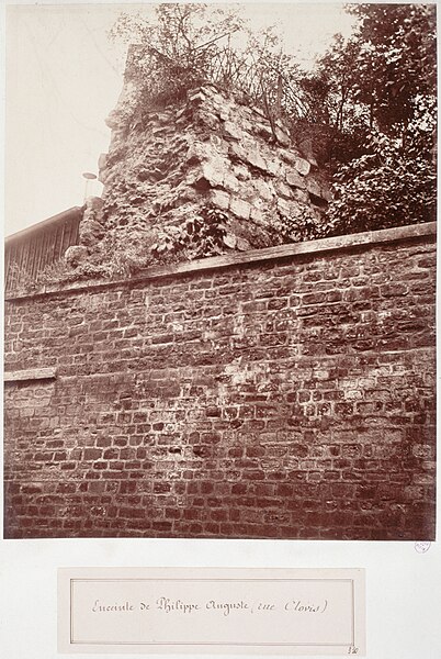 L'enceinte de Philippe-Auguste est un système de fortification urbaine élevé à Paris à partir de la fin du XIIe siècle ; c'est la deuxième enceinte médiévale et la plus ancienne dont le tracé soit connu avec précision. Bien que très partiellement intégrée aux constructions ultérieures, elle a laissé davantage de vestiges que les fortifications qui lui ont succédé. La construction répondait aux luttes opposant Philippe Auguste à la dynastie plantagenêt : le roi ordonna l'édification d'une muraille de pierre avant son départ pour la troisième croisade afin de protéger Paris, notamment des attaques venant du nord et de l'ouest. À l'origine, la muraille ne comportait pas de fossé extérieur, les voiries étant immédiatement adjacentes. Cet aménagement s'accompagna d'un important développement urbain : Philippe Auguste encouragea la croissance des quartiers inclus dans la nouvelle enceinte, transféra la foire de Saint-Ladre dans le quartier des Champeaux et donna des clos à l'abbaye de Sainte-Geneviève pour y lotir des habitations, contribuant à faire de Paris une résidence royale et un centre administratif et universitaire. Au début du XIVe siècle, Paris était devenue la plus grande cité d'Europe médiévale avec environ 250 000 habitants ; à la fin du règne de Philippe Auguste, l'espace renfermé par l'enceinte comptait quelque 50 000 habitants. La rive droite fut fortifiée en premier (1190‑1209), puis la rive gauche (1200‑1215), un décalage dicté par des raisons stratégiques liées à la présence des Plantagenêt en Normandie ; la construction du château du Louvre compléta la défense de la ville face à une attaque remontant la Seine. L'enceinte mesurait environ 2 850 mètres sur la rive droite et 2 535 mètres sur la rive gauche, et enfermait près de 253 hectares. Les propriétaires des terrains expropriés furent indemnisés par l'administration royale ; un mémoire indique que le coût de la rive gauche s'éleva à 7 020 livres, entièrement supportées par le Trésor royal, tandis que la rive droite coûta vraisemblablement plus de 8 000 livres, probablement financées en partie par les bourgeois de Paris. Certains ouvrages furent financés par des particuliers, comme la porte Barbette qui doit son nom à Étienne Barbette ; l'ensemble du programme de fortification, Louvre compris, atteignit au moins 20 000 livres, somme notable mais compatible avec les recettes de la Couronne de l'époque. Au XIVe siècle l'enceinte fut adaptée aux nouvelles techniques de siège : on creusa de larges fossés devant le mur et parfois en arrière de celui-ci, on utilisa les déblais pour renforcer l'arrière-mur, on inonda certaines sections à l'aide d'écluses et on renforça les portes par des barbacanes munies de herses, ponts et ponts-levis, tandis qu'un chemin de ronde intérieur facilita la circulation de l'artillerie. Malgré la construction d'une nouvelle enceinte sur la rive droite sous Charles V, l'ancienne muraille ne fut pas démolie et, en 1434, on la jugeait encore « moult fors et espes ». À partir du milieu du XVIe siècle, la vente et la location des terrains situés le long de la muraille entraînèrent le démantèlement progressif de larges portions du mur ; les fossés proches de la Seine, devenus égouts à ciel ouvert, furent couverts puis remblayés au XVIIe siècle, et les dernières portes furent rasées dans les années 1680, rendant l'enceinte pratiquement invisible. Centrée sur l'île de la Cité, l'enceinte enferma plusieurs bourgs médiévaux, parmi lesquels, au nord, le beau Bourg, le bourg Tiboust, le bourg Saint-Germain-l'Auxerrois, une part du Bourg-l'Abbé, le quartier des Champeaux et le cimetière des Innocents, et, au sud, le bourg Sainte-Geneviève ; son tracé traversait les actuels 1er, 4e, 5e et 6e arrondissements. Sur la rive droite le mur, interrompu au niveau du Louvre afin de laisser à la forteresse son rôle de citadelle, s'articulait en cinq segments autour des portes Saint-Honoré, Montmartre, Saint-Denis et Saint-Antoine ; hormis un petit tronçon rue des Jardins-Saint-Paul, la fortification a disparu en surface. Sur la rive gauche, le tracé se devine encore dans l'orientation de plusieurs rues extérieures et reposait sur six portes d'origine ouvrant la ville vers les axes principaux, avec des poternes et ouvertures supplémentaires percées au XIIIe siècle puis par la suite pour répondre à la croissance des faubourgs. Le rempart, entièrement crénelé et muni d'un chemin de ronde large d'environ deux mètres, mesurait six à huit mètres de hauteur (jusqu'à neuf mètres avec le parapet) pour une épaisseur de quatre à six mètres à la base, construit par deux parements remplis de pierres et de mortier. Il était flanqué de 73 tours semi‑cylindriques intégrées à la courtine (39 en rive droite, 34 en rive gauche) espacées de quelques dizaines de mètres, de dimensions modestes (environ six mètres de diamètre incluant des murs d'un mètre) et d'une quinzaine de mètres de hauteur, chacune comportant trois niveaux ; quatre grandes tours, situées aux jonctions avec la Seine et hautes d'environ 25 mètres, permettaient de contrôler la navigation et de tendre de fortes chaînes pour interdire le passage par voie d'eau. À l'origine quatorze portes principales furent aménagées, flanquées de tours à base talutée et encadrant des passages voûtés ou à ciel ouvert, puis d'autres portes et poternes furent ajoutées au fil des besoins de circulation. L'enceinte est devenue largement invisible depuis le XVIIe siècle, mais des vestiges subsistent, parfois intégrés aux constructions privées, parfois visibles en élévation ou en sous-sol et disséminés dans les premiers arrondissements de la capitale ; vingt portions sont classées aux monuments historiques depuis 1889, la plus longue portion conservée étant visible à l'angle des rues Charlemagne et des Jardins-Saint-Paul, e