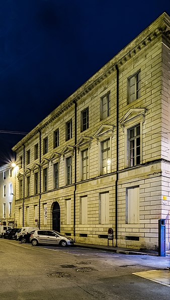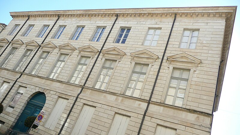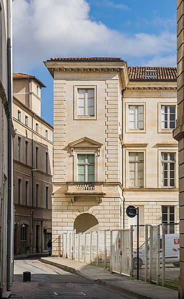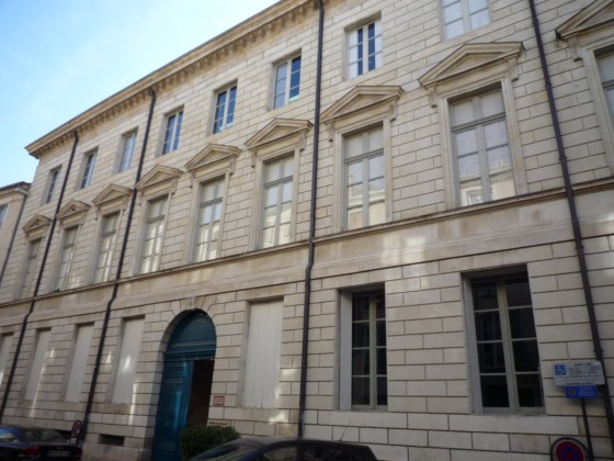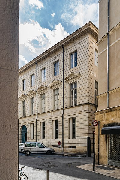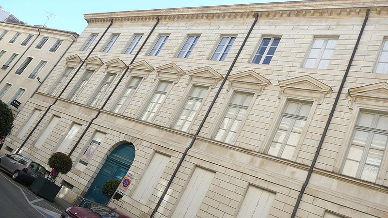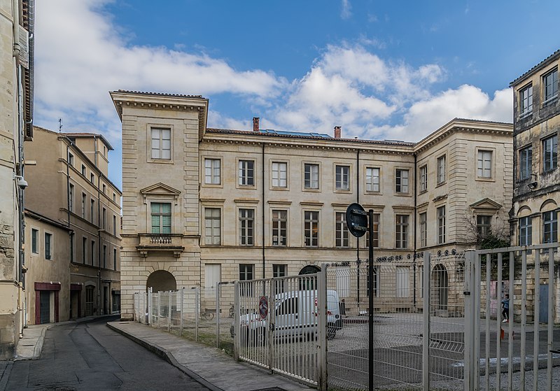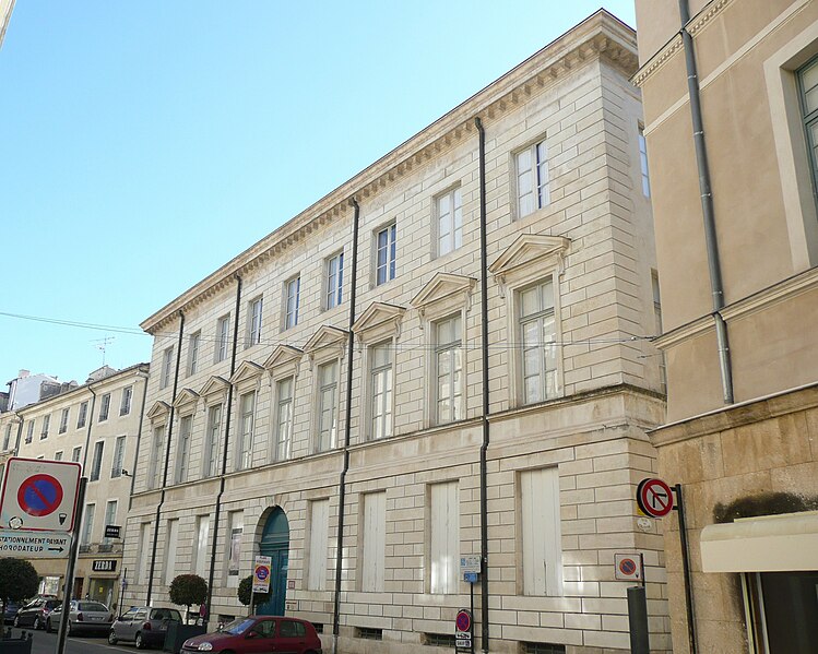 L'ancien hôtel Rivet, situé 10 Grande-Rue à Nîmes, est un édifice civil inscrit au titre des monuments historiques en 1988 et classé en 2005, qui abrite aujourd'hui l'École supérieure des beaux-arts de Nîmes. Construit en 1786 pour David Rivet, négociant en soieries et armateur à Cadix revenu dans sa ville natale, l'édifice est attribué à l'architecte Jean-Arnaud Raymond et constitue, dans la région, le seul témoignage de ses réalisations. La façade sur la Grand'Rue et celle ouvrant sur la cour arrière présentent un caractère monumental ; l'ensemble se compose de deux petites ailes en U et d'une composition qui fermait le côté rue, les ailes étant prolongées par des terrasses menant au jardin. Au XIXe siècle, l'architecte Durand a remanié l'hôtel pour l'installation de la préfecture, réalisant notamment des extensions et une galerie couverte, dont une partie a ensuite été supprimée pour permettre une éventuelle extension de l'école des Beaux-Arts. Après avoir accueilli un hôpital, l'édifice a servi, en 1857, de couvent pour les dames de la Miséricorde, puis d'école primaire de jeunes filles. L'École supérieure des beaux-arts de Nîmes s'y est installée en 1985 ; le texte indique par ailleurs que l'établissement trouve son origine dans une « école de dessin » créée en 1820 sous la direction de Jean Vignaud. En 1987, l'extérieur a été restauré par Ariel Balmassière et l'intérieur par Frédéric Lombard. L'architecture, de style néo‑classique palladianisant, se distingue par des façades régulières et monumentales, un atrium et un éclairage zénithal. L'entrée, encadrée de colonnes toscanes, présente un sol réalisé par l'artiste Bernard Pagès, et l'escalier d'honneur comporte une rampe en fer forgé inspirée de celle de l'École militaire de Paris. Au sud du bâtiment s'ouvre une grande cour. Parmi les élèves notoires de l'école figurent Julien Doré, Jean‑Marie Granier, Jaouen Salaün, Thibault Brunet et Damien Bonnard. L'édifice est répertorié dans plusieurs notices et guides et fait l'objet de ressources en ligne, notamment les sites officiels et les portails consacrés aux monuments et aux arts.