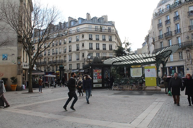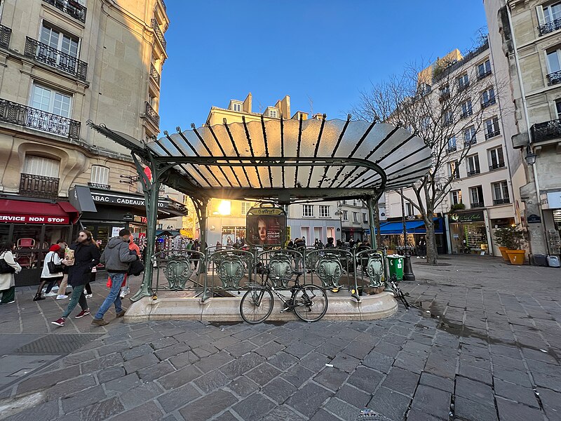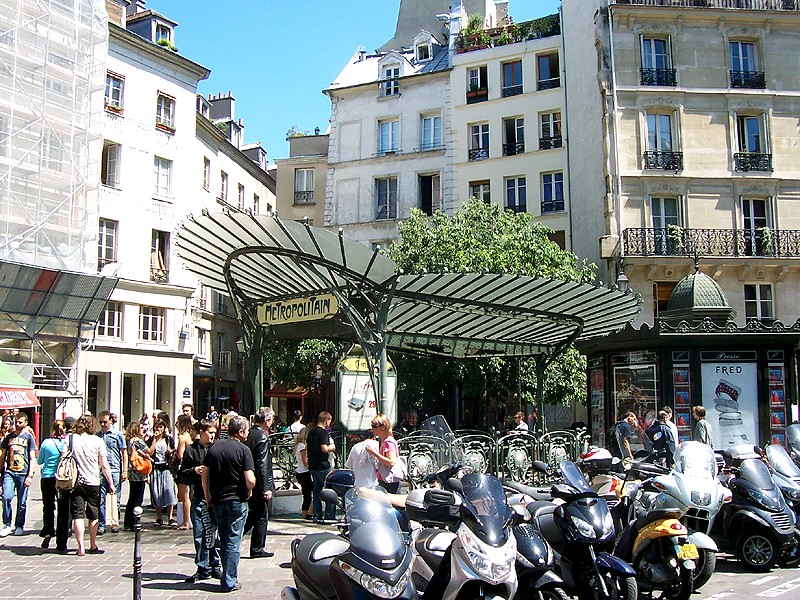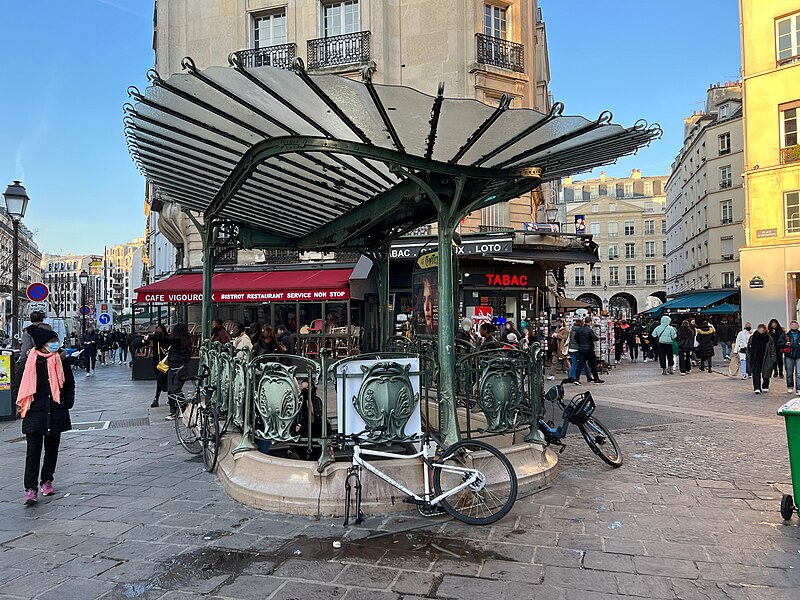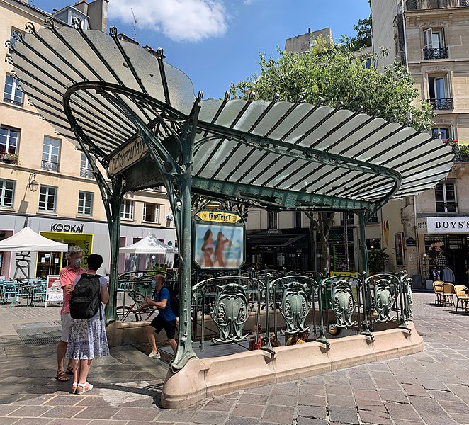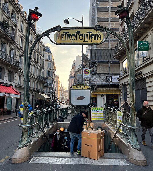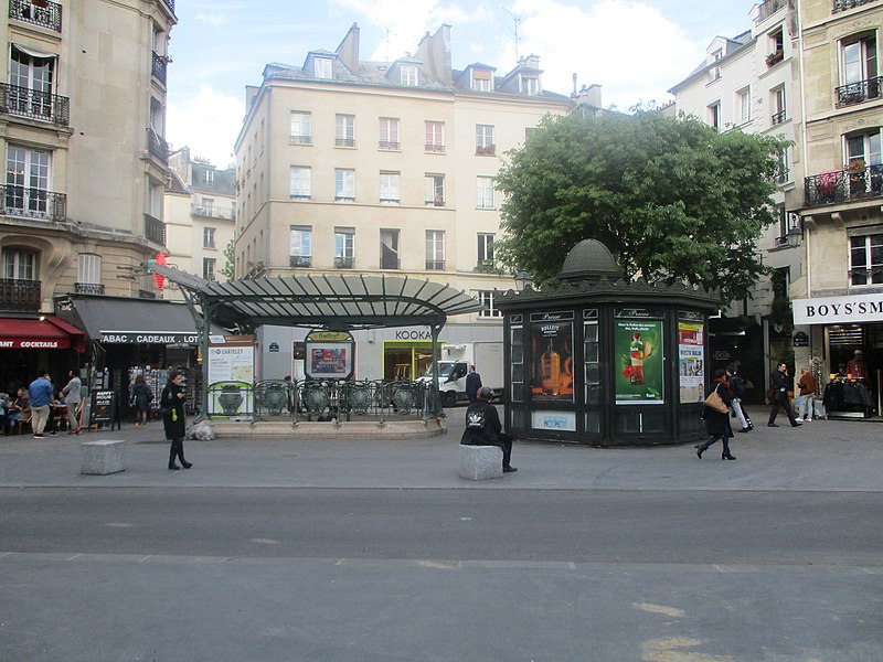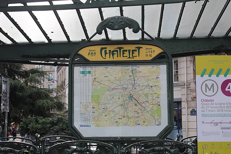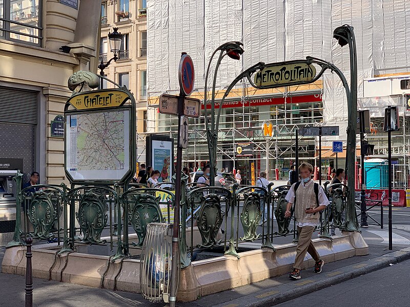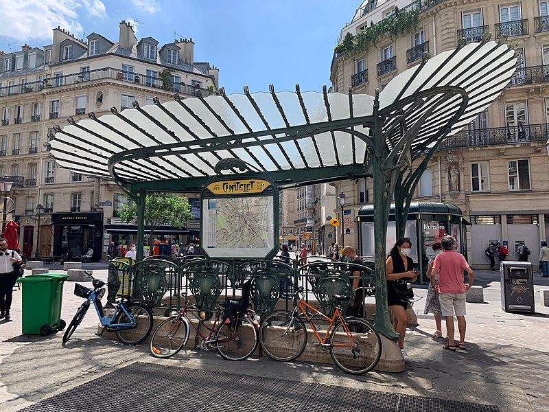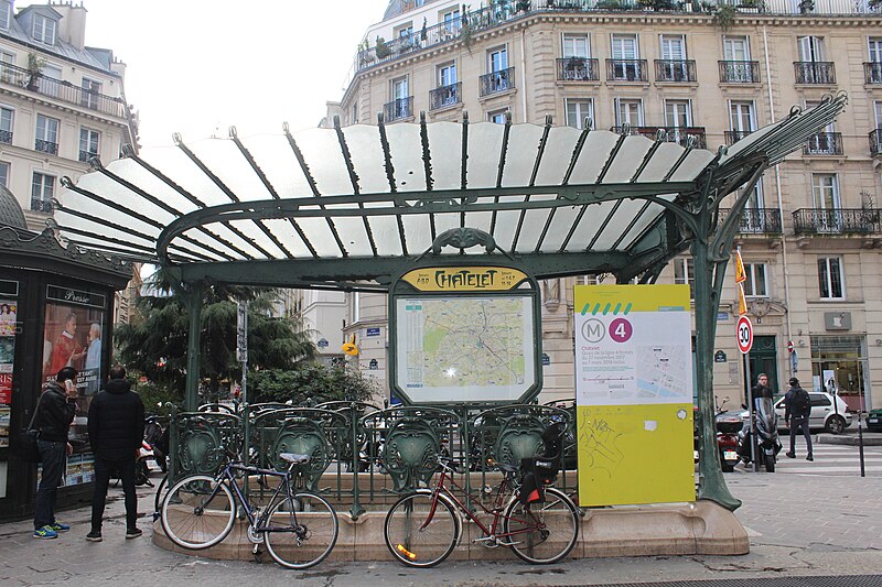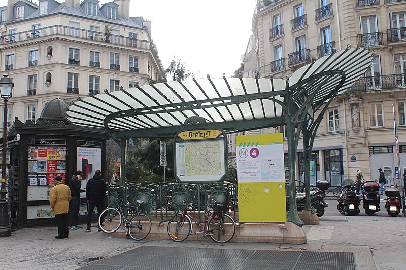 L'accès à la station Châtelet est l'un des édicules du métro dessinés en 1900 par Hector Guimard pour la Compagnie générale du Métropolitain de Paris ; la station se situe sur la ligne 1, inaugurée la même année. Les réalisations de Guimard, conçues dans un style Art nouveau, vont des édicules couverts mêlant fer, fonte, verre et lave émaillée à des entourages plus simples composés d'une balustrade et d'un portique en fonte sculptée, repérables par leurs candélabres soutenant une enseigne « Métropolitain » et des verrines colorées. Conçues selon une logique modulaire, ces entrées associent éléments standardisés — panneaux de lave émaillée, montants en fonte, vitrages et marquises — et productions semi-industrielles afin d’être adaptées aux contraintes de chaque site. Guimard obtint la commande hors concours et livra rapidement dessins et projets, mais la collaboration avec la CMP se détériora pour des motifs financiers ; en 1903 une convention mit fin au contrat tout en permettant à la Compagnie de reproduire ses modèles. Entre le printemps 1900 et 1913, la CMP posa nombre d’ouvrages d’après ses plans : entourages à écussons ou à cartouches, édicules de deux modèles et trois petits pavillons destinés aux gares les plus importantes. Sur les 167 ouvrages édifiés d’après ses dessins, la plupart des édicules et près de la moitié des entourages furent détruits dans les décennies suivantes, l’Art nouveau passant de mode. Le choix des matériaux et des fournisseurs reflète le souci technique et esthétique de Guimard : pierres de soubassement, fontes produites en série, panneaux de lave émaillée, verrines et vitrages réalisés par des ateliers spécialisés. La simplicité des entourages convint bientôt la municipalité de généraliser ces modèles au détriment des édicules, initialement prévus en plus grand nombre. Au fil du XXe siècle, l’abandon, les remplacements par des modèles plus sobres et les difficultés d’entretien entraînèrent démontages et pertes, tandis que certaines pièces furent prêtées ou offertes à des musées et institutions étrangères. Dès les années 1960 la redécouverte de l’Art nouveau amorça des mesures de protection et des restaurations, et un arrêté de 1965 puis une inscription de 1978 protègent plusieurs ouvrages, inscription complétée en 2016 par l’ajout de l’entourage de la place de la Nation. La RATP a engagé depuis les années 1970 des campagnes de maintenance et, à l’approche du centenaire du métro, des restaurations à l’identique menées avec les services des Monuments historiques. Parmi les ouvrages conservés, l’édicule de la Porte Dauphine est le seul édicule B d’origine resté en place et restauré, et le modèle A à claire-voie déplacé est visible à Abbesses. La version allégée installée place Sainte-Opportune, qui offre un accès secondaire à la station Châtelet, est une reconstitution réalisée en 2000 d’un exemplaire initialement édifié à la Gare de Lyon. Longtemps controversées, les entrées de Guimard sont aujourd’hui reconnues comme des symboles de l’Art nouveau et du paysage parisien, contribuant à l’image et à l’imaginaire de la ville et demeurant un élément identitaire du métro.